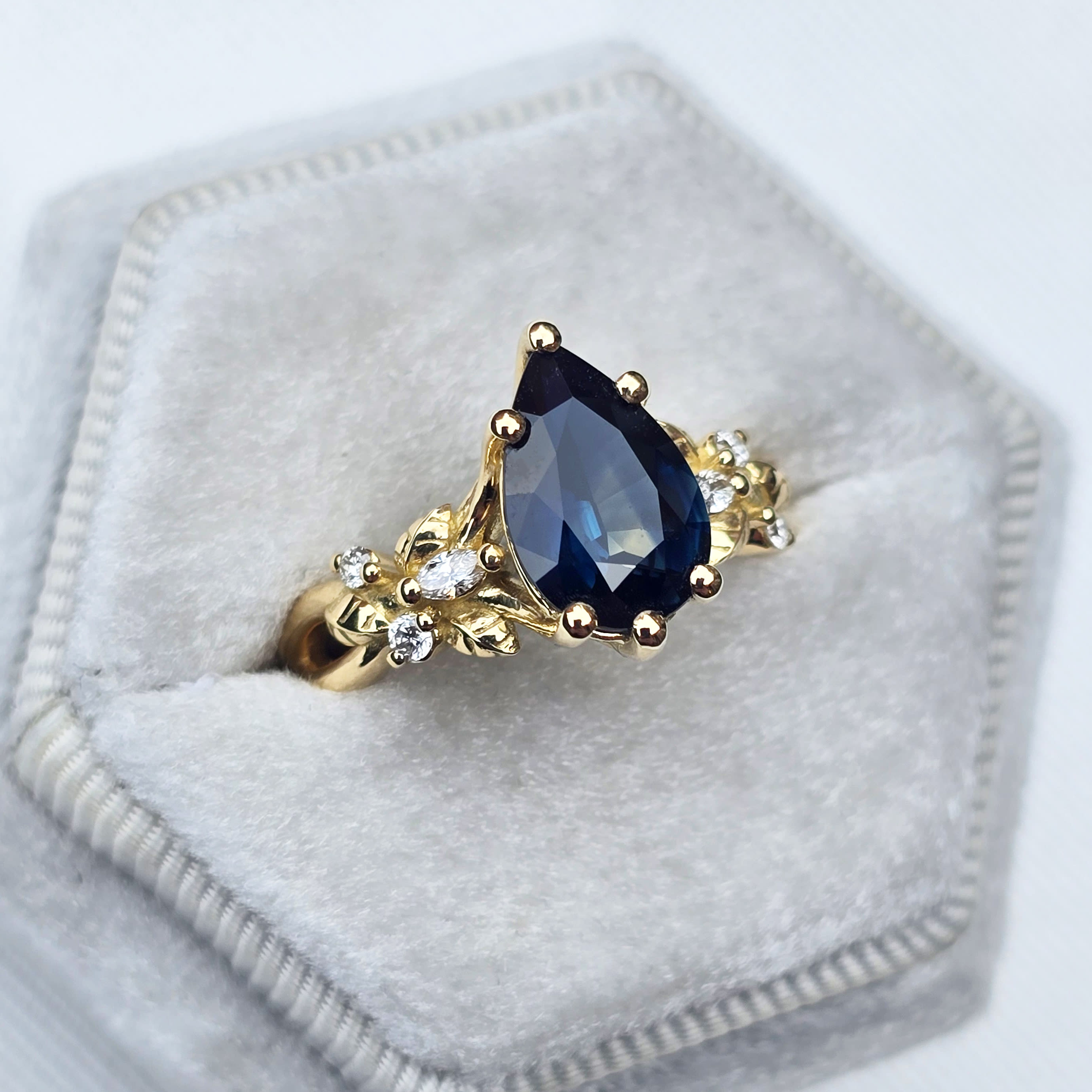 Description: The Flora Belle sapphire and diamond ring features a pear-shaped, 2.38-carat natural Australian sapphire centre stone. The design is accented by a a cluster of minature golden leaves and diamonds, in a weaving band, all in 18ct yellow gold.