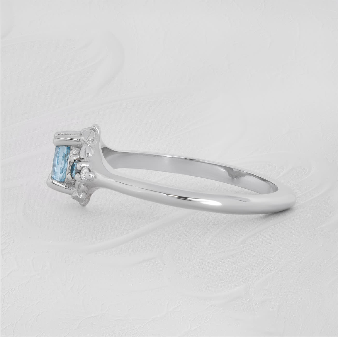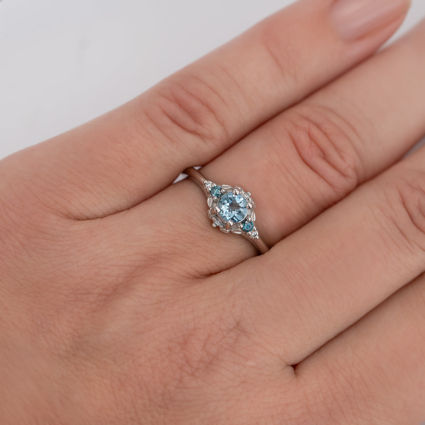 This gorgeous piece is centred with a natural round aquamarine. The aquamarine has been flanked with two lab grown alexandrites and four lab grown diamonds, with miniature leaves surrounding the centrepiece, all in platinum!