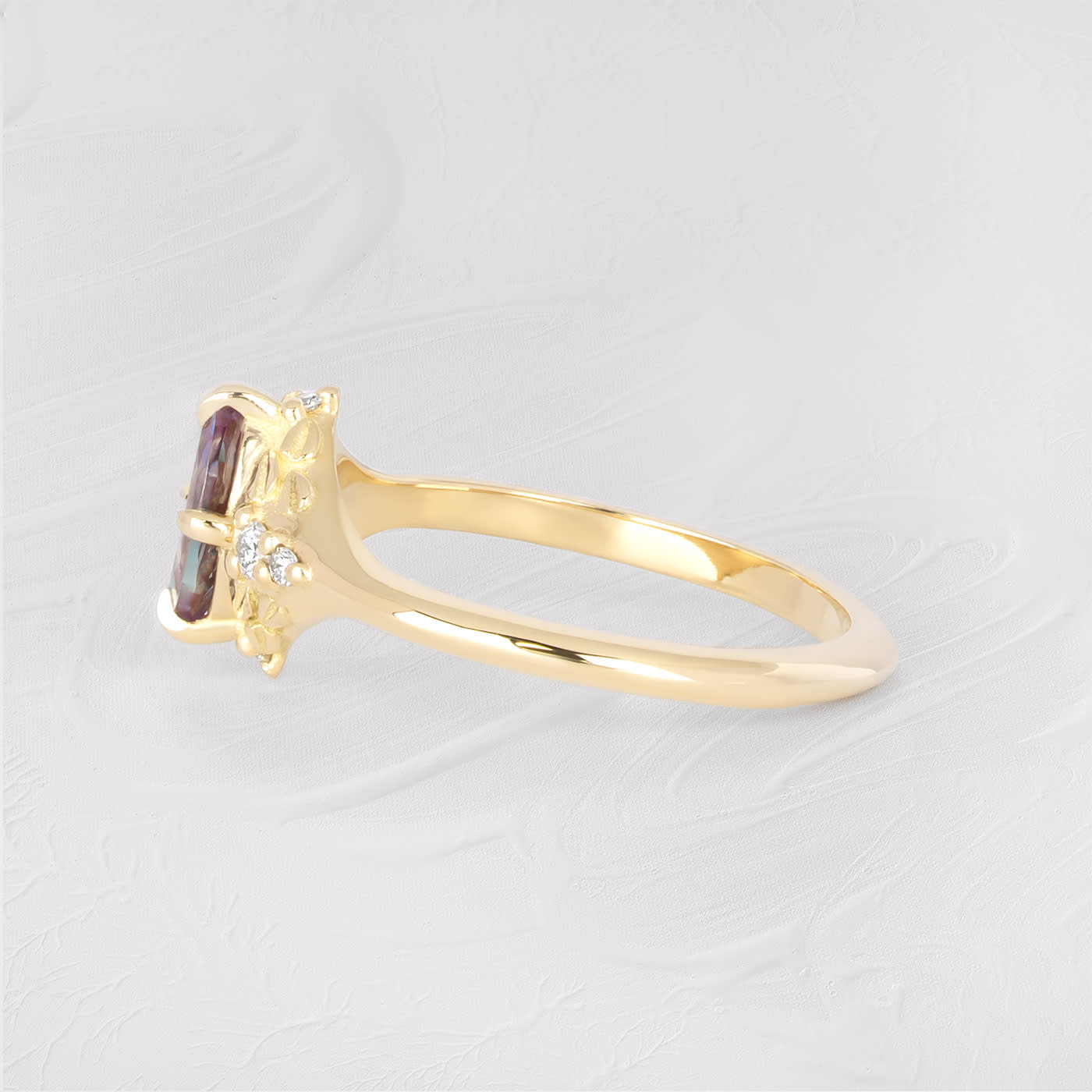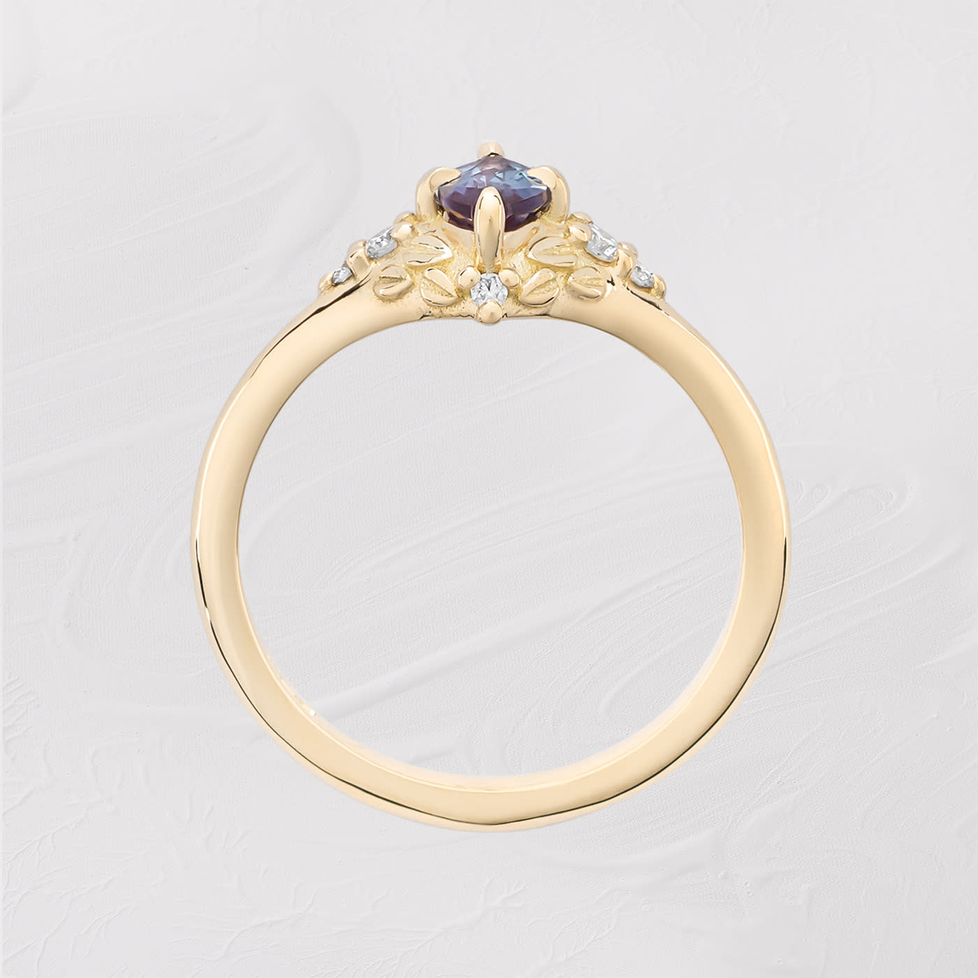 This gorgeous piece is centred with a marquise cut lab grown Alexandrite. The Alexandrite has been flanked with a further six lab grown diamonds, with miniature leaves surrounding the centrepiece, pictured in 18ct yellow gold!