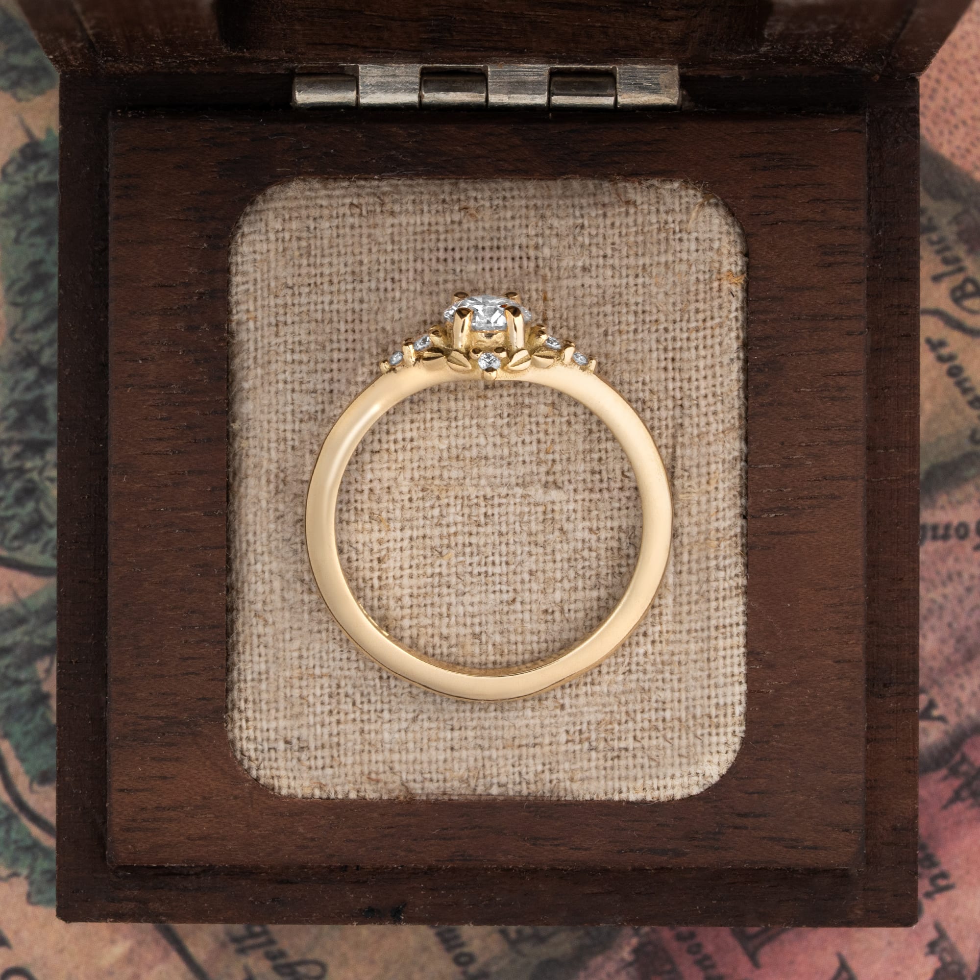 Description: This diamond ring is set with a 0.50ct lab-grown round brilliant cut centre stone. The design features miniature leaf detailing surrounding the centrepiece, creating a cluster effect. The centre stone is flanked by three lab-grown round accent diamonds on each side. This fine jewellery piece is classified as a Made To Order Ring.