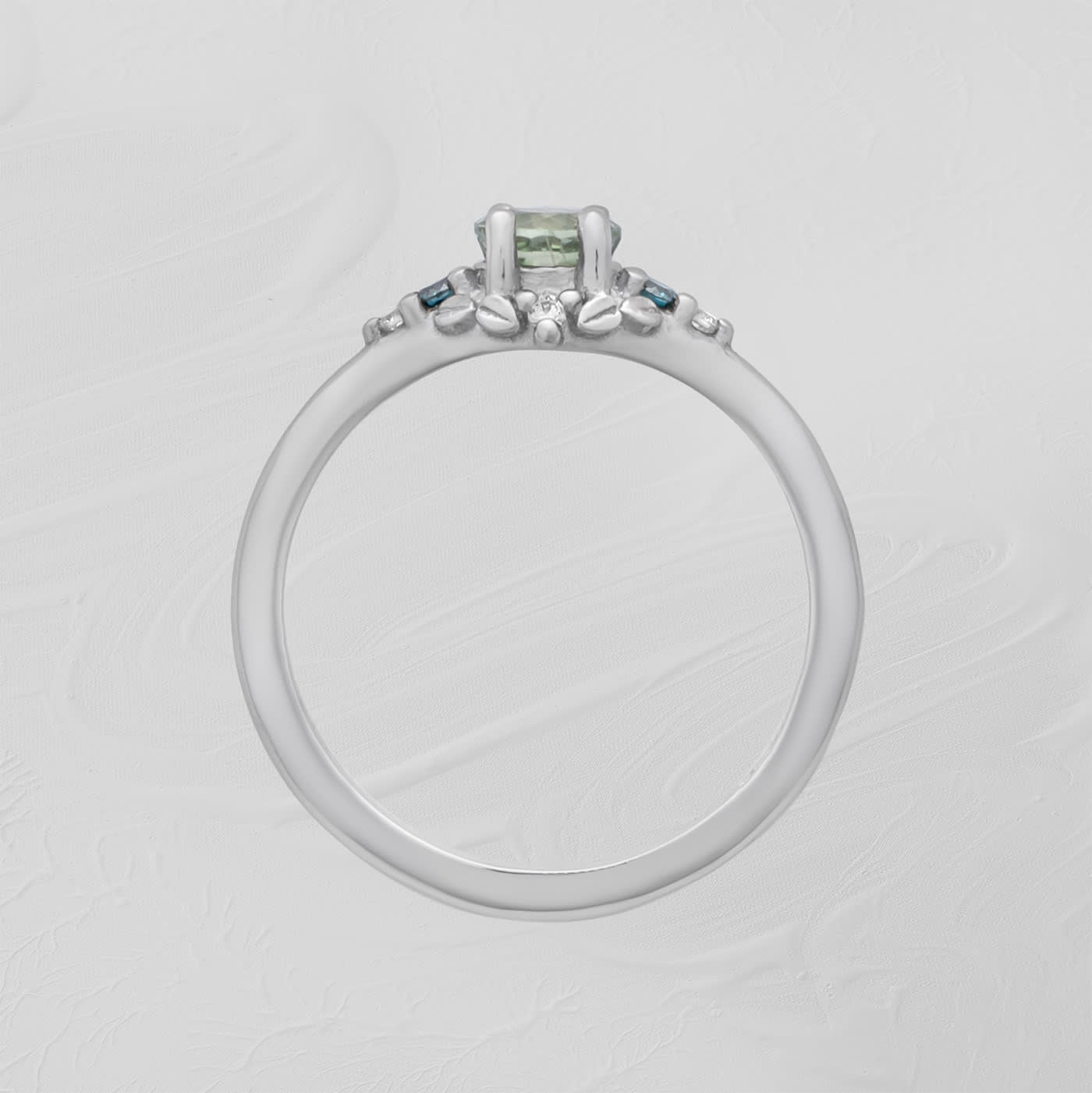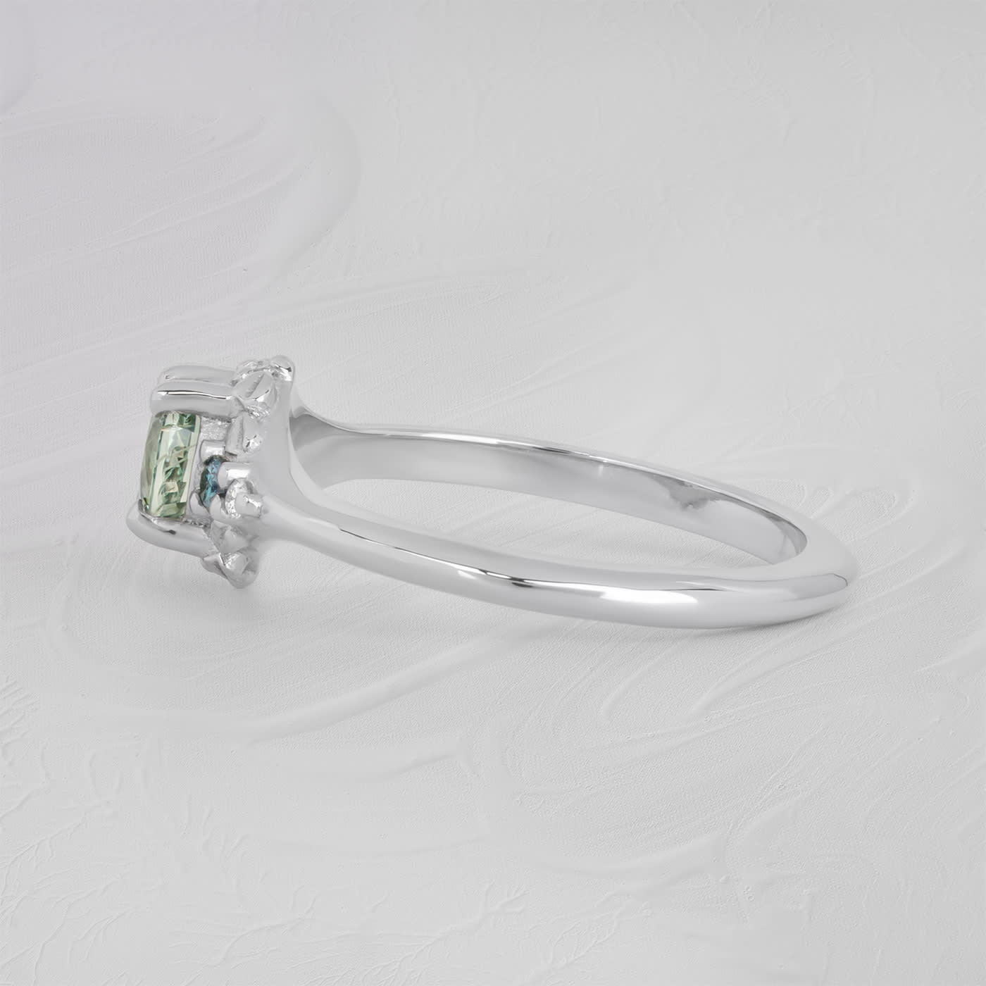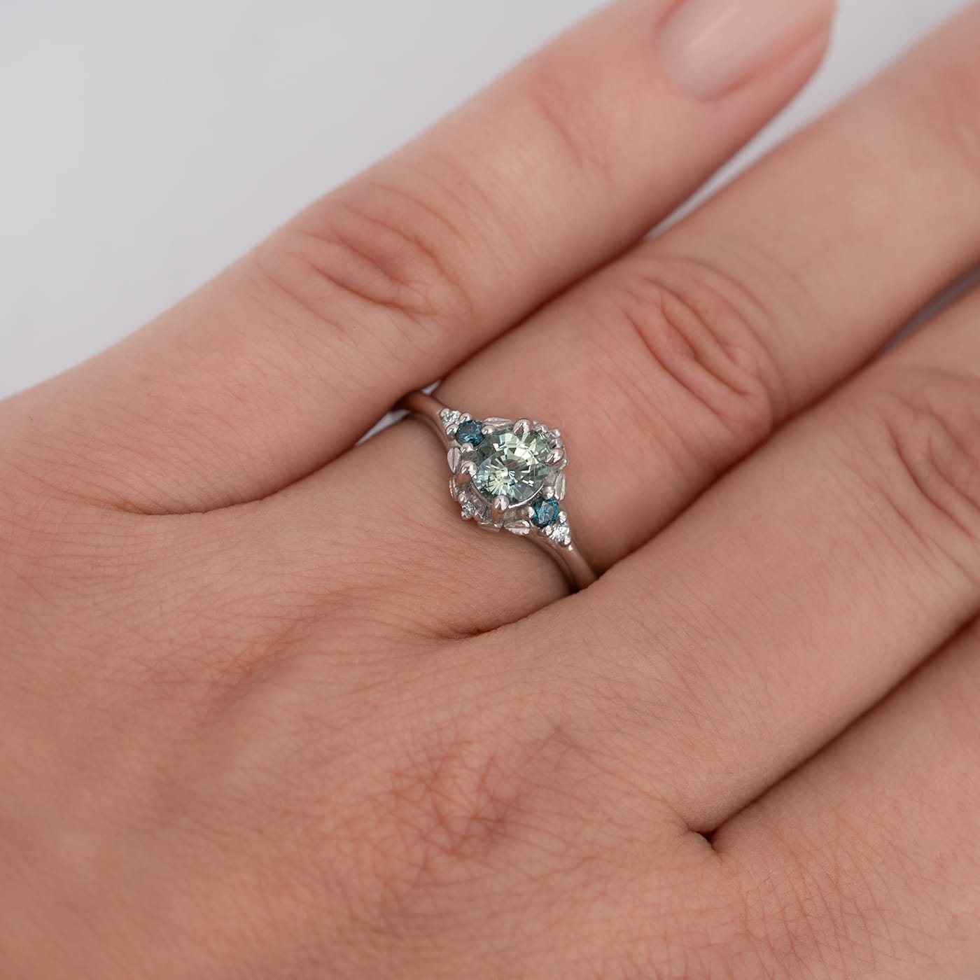This gorgeous piece is centred with a natural, round seafoam green sapphire. The sapphire has been flanked with two lab grown alexandrites and four lab grown diamonds, with miniature leaves surrounding the centrepiece, all in platinum!