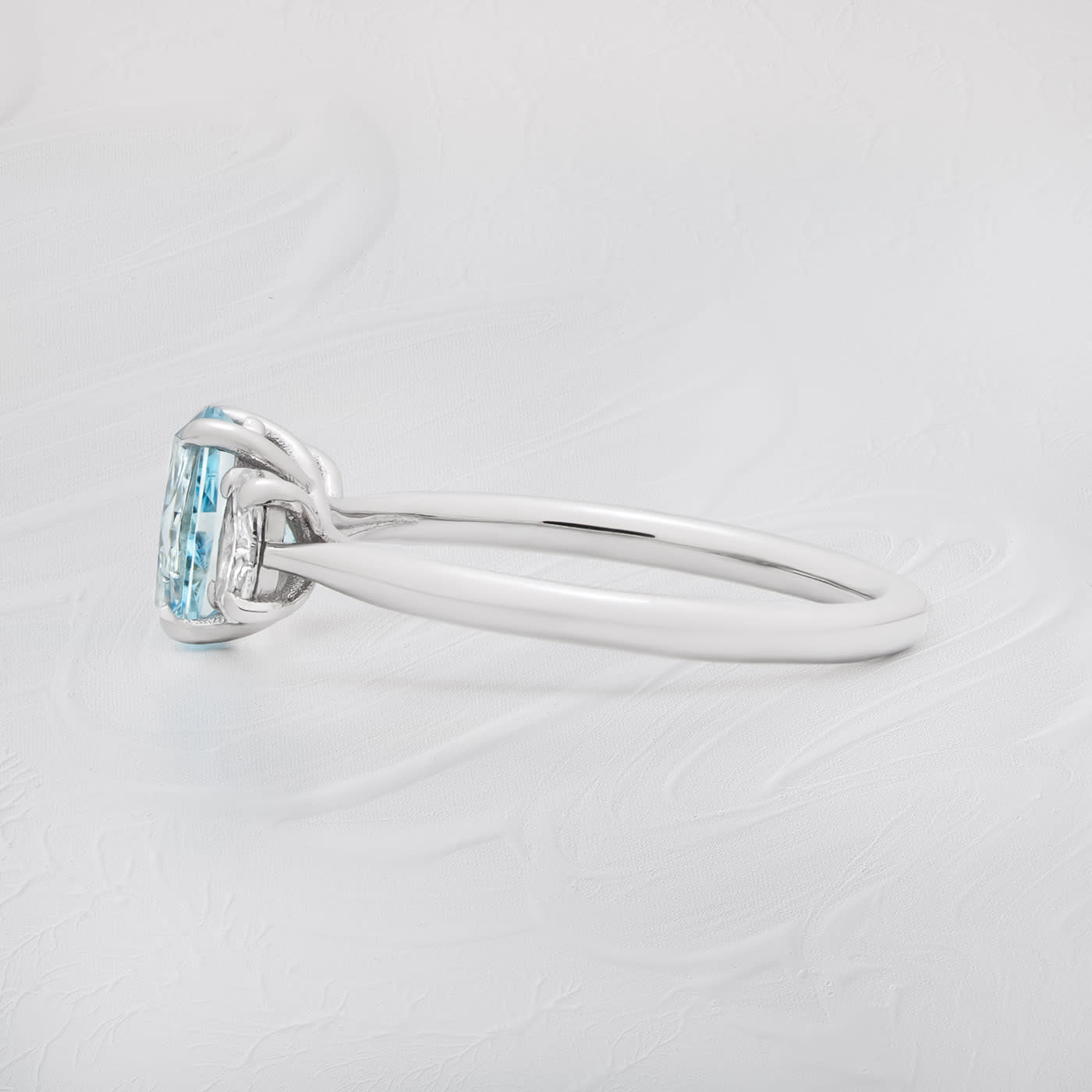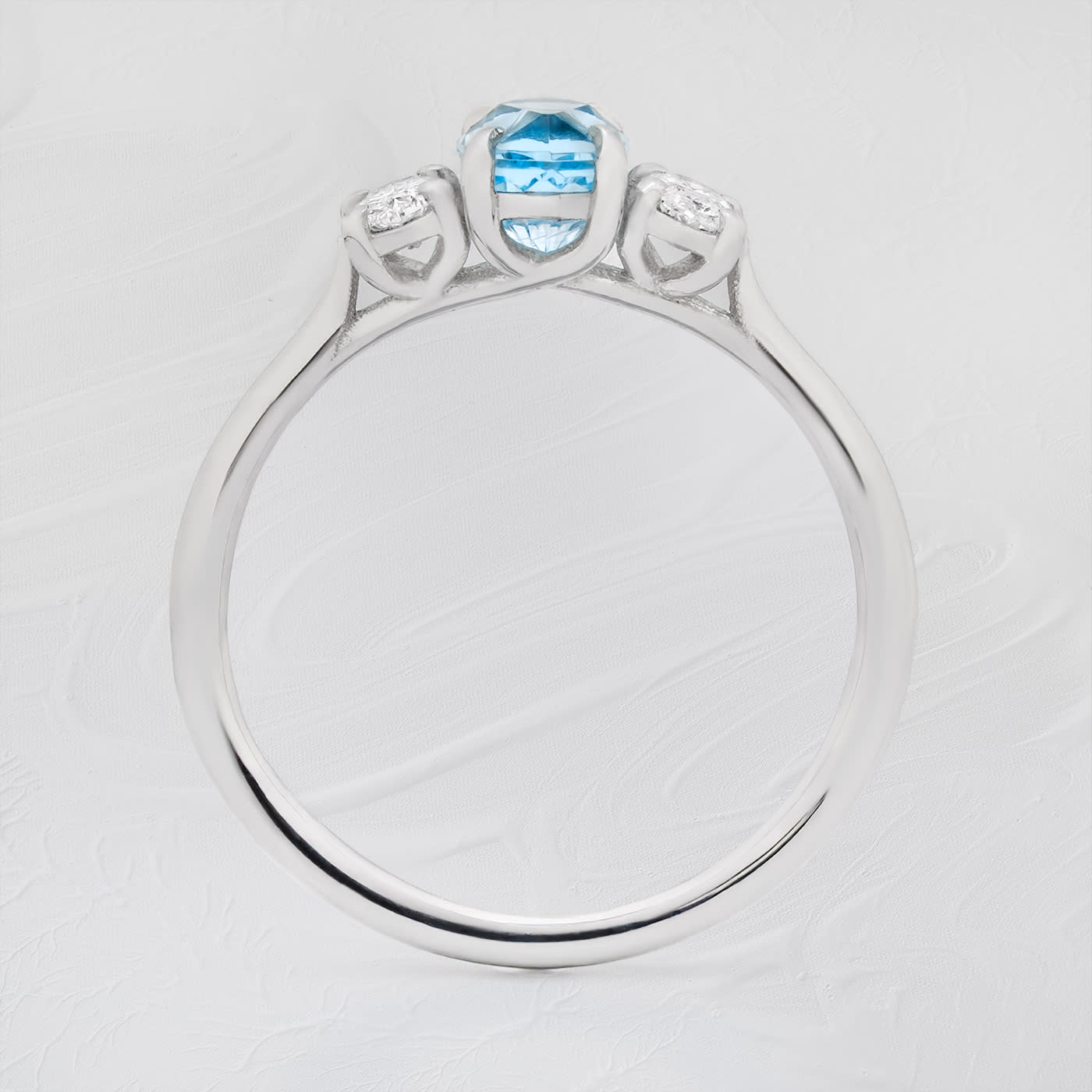 This brand new stunning ring features a beautiful and totally unique 0.9ct Aquamarine. This sapphire was cut by artist and expert lapidary Sennin Esko in his one of a kind 'Galaxy' style octagon cut. The aquamarine has been talon set with two oval cut lab grown diamonds in a classic trilogy style platinum arrangement.