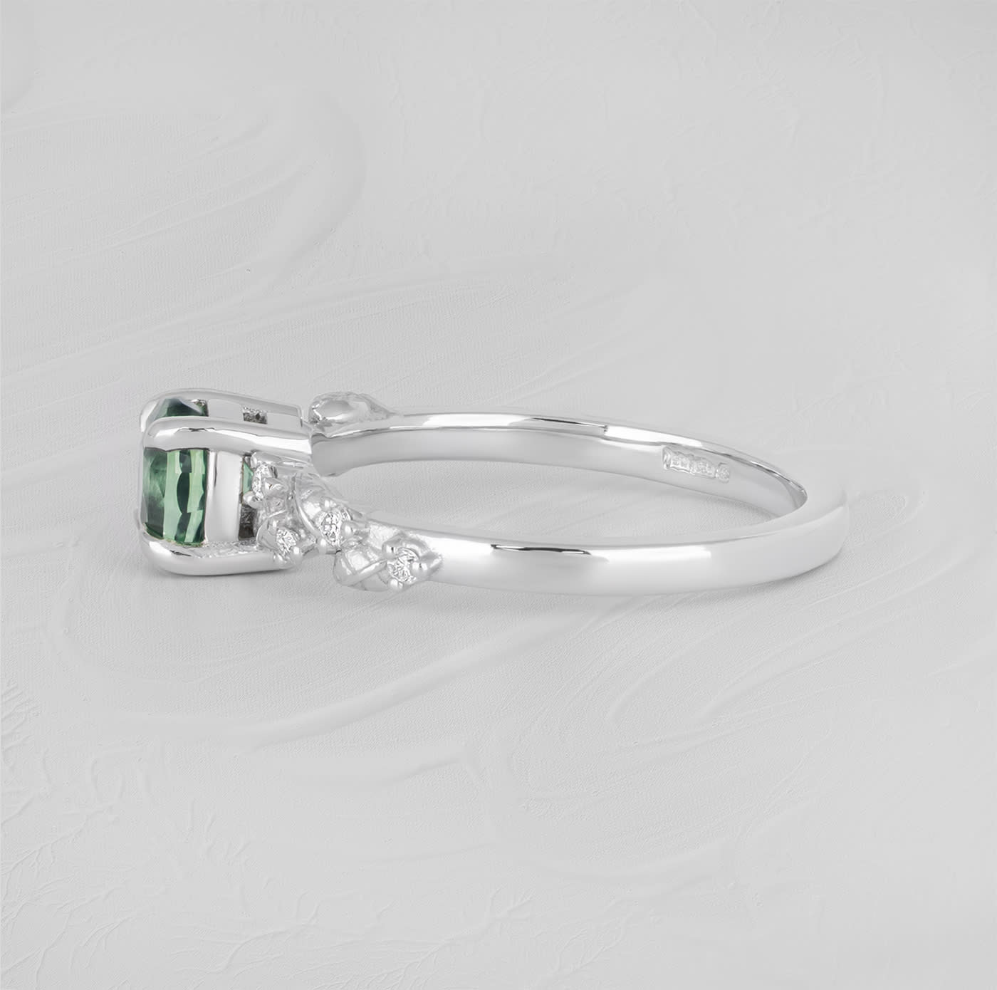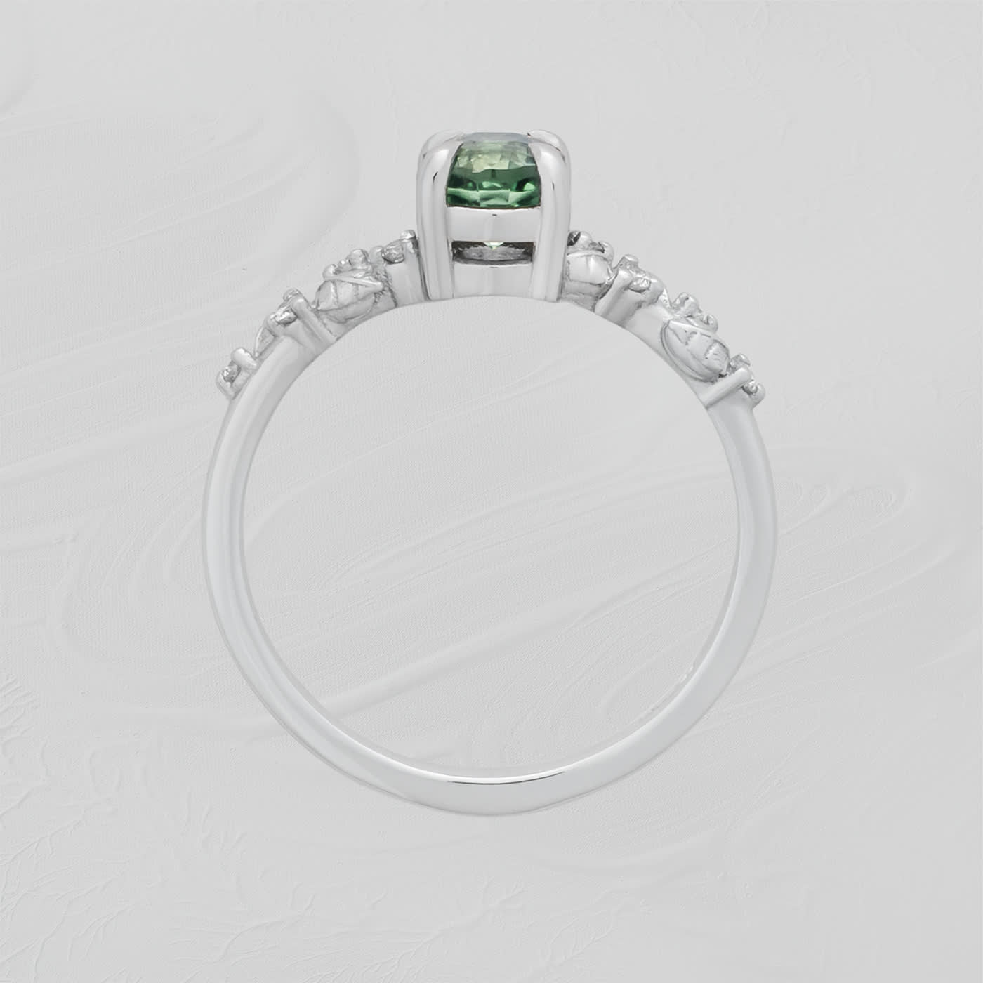 This elegant ring features a central 1.11ct oval green sapphire, in a 4 talon setting. The central diamond is accented with a mixture of miniature leaves and round diamonds, all in platinum!