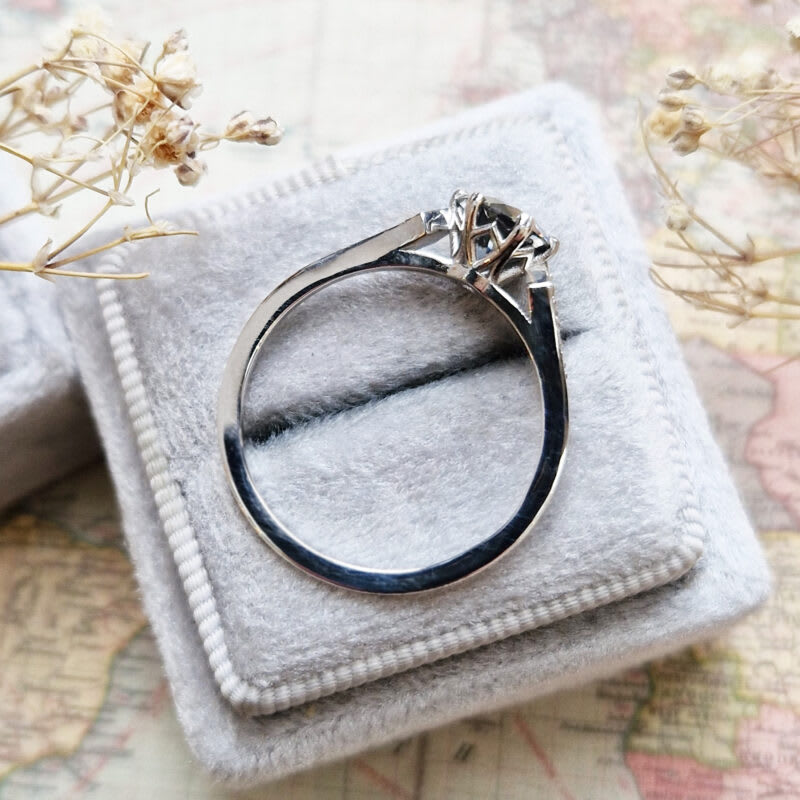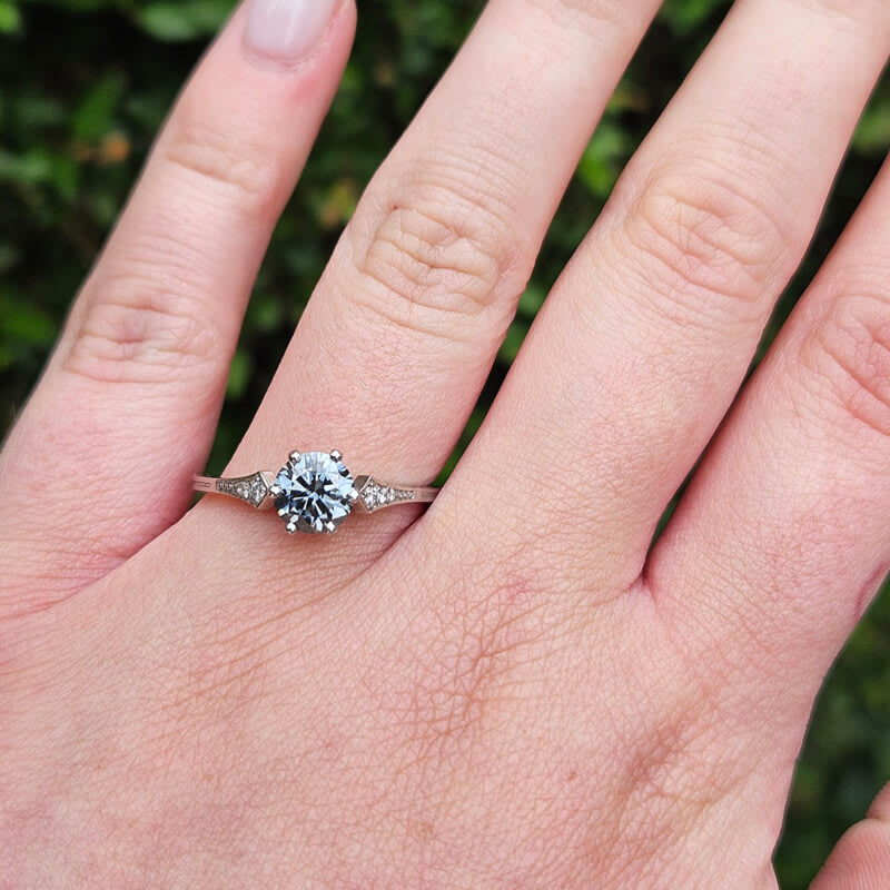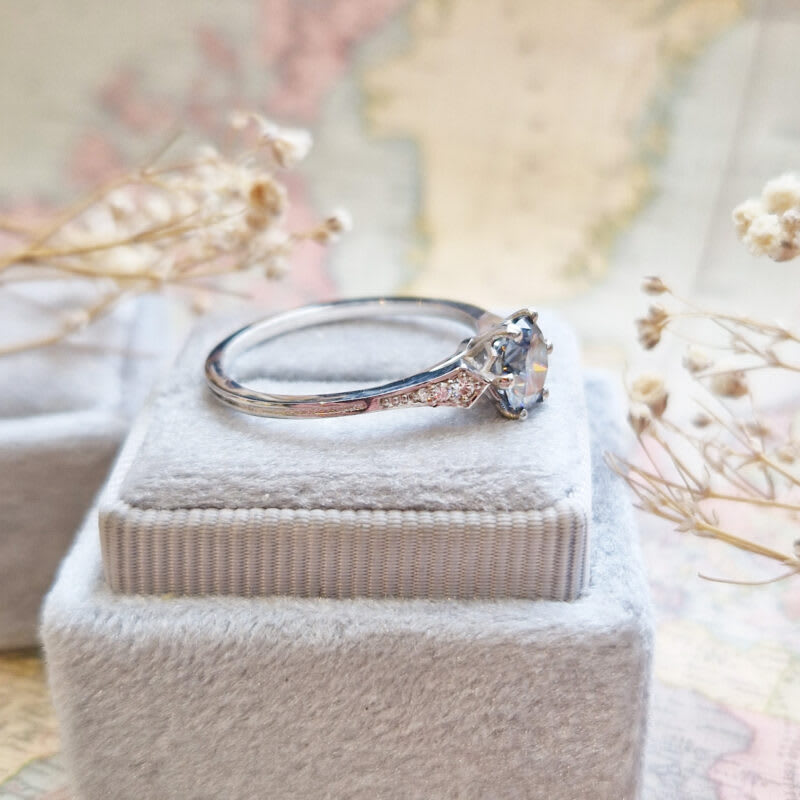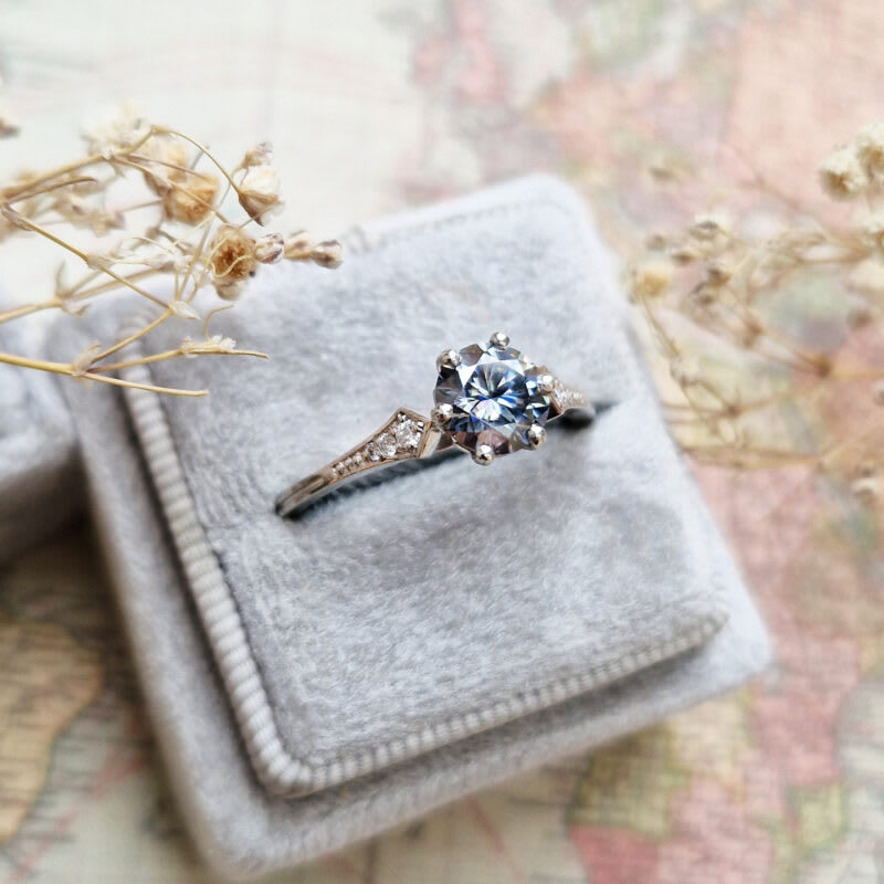 Center Grey Moissanite: 1 carat, 6.5mm, VVS clarity, blueish-grey