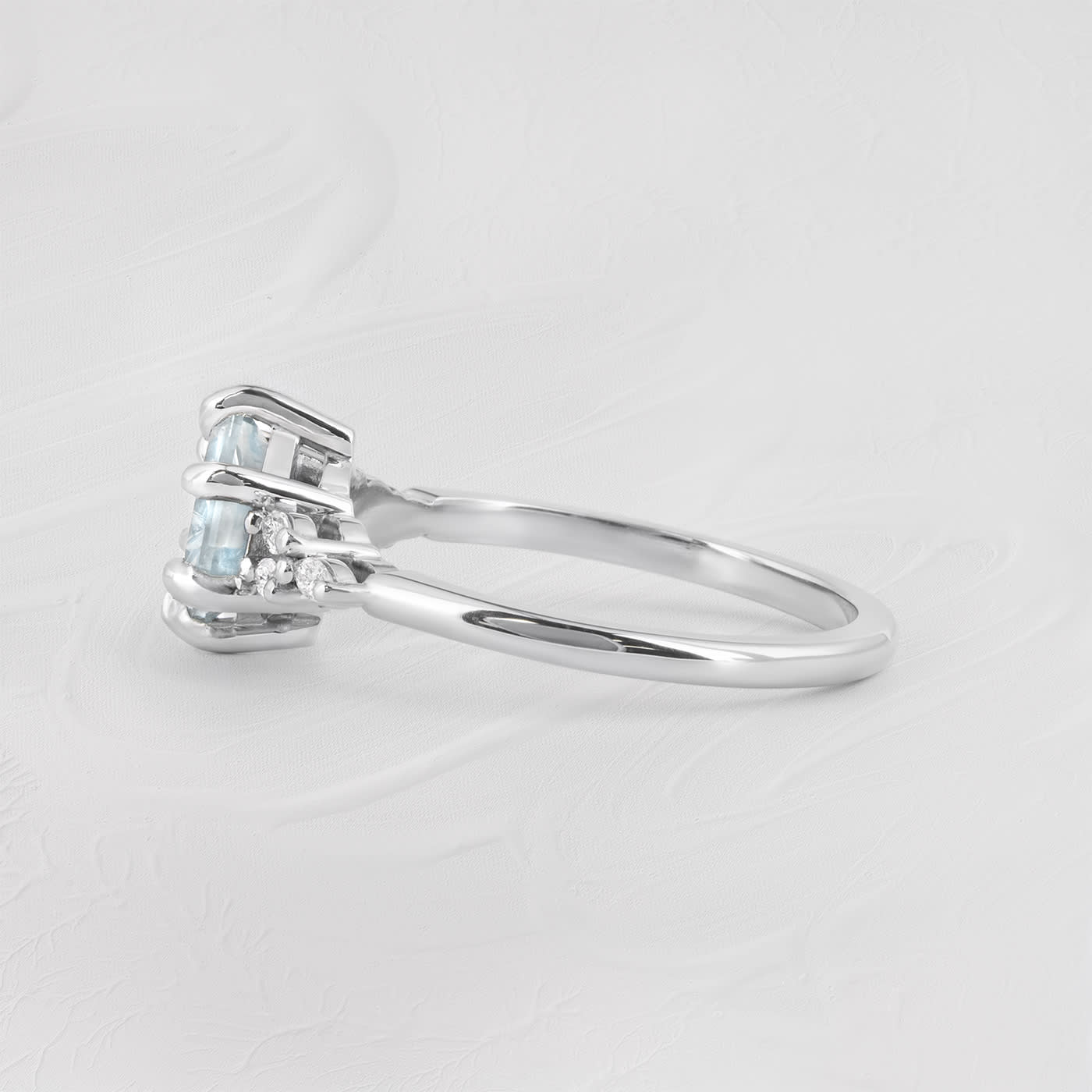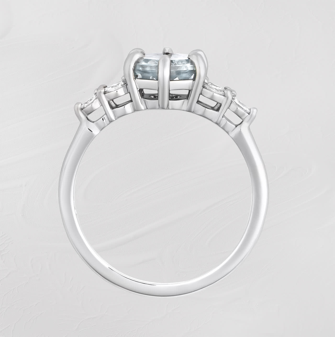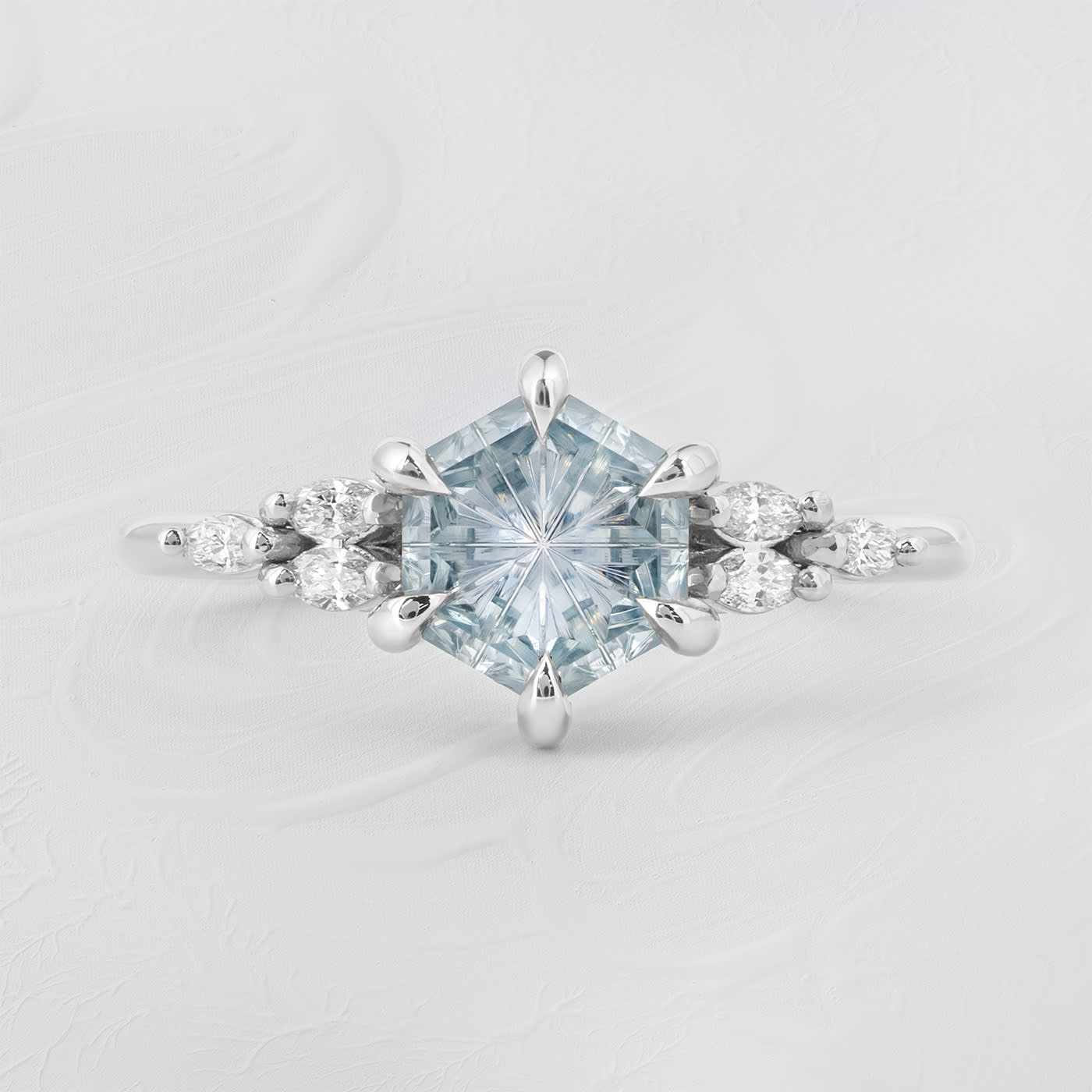 Description: This luxury engagement ring features a central natural hexagon-cut, unheated icy teal Montana sapphire (1.12ct total carat weight) set in a delicate 6-talon mount. The sapphire has been custom cut in a snowflake style pattern to make it truly unique. The centre stone is flanked by six marquise-cut white accent lab grown diamonds (0.15ct total carat weight) for a comprehensive fine jewellery design. The setting secures the centre stone with minimal metal for maximum light exposure.