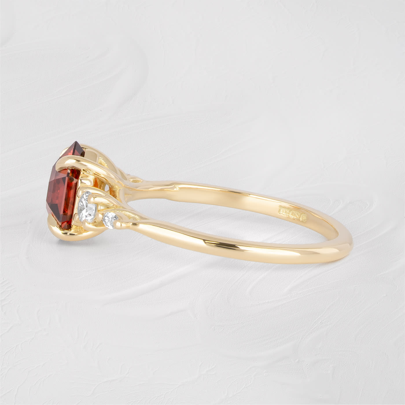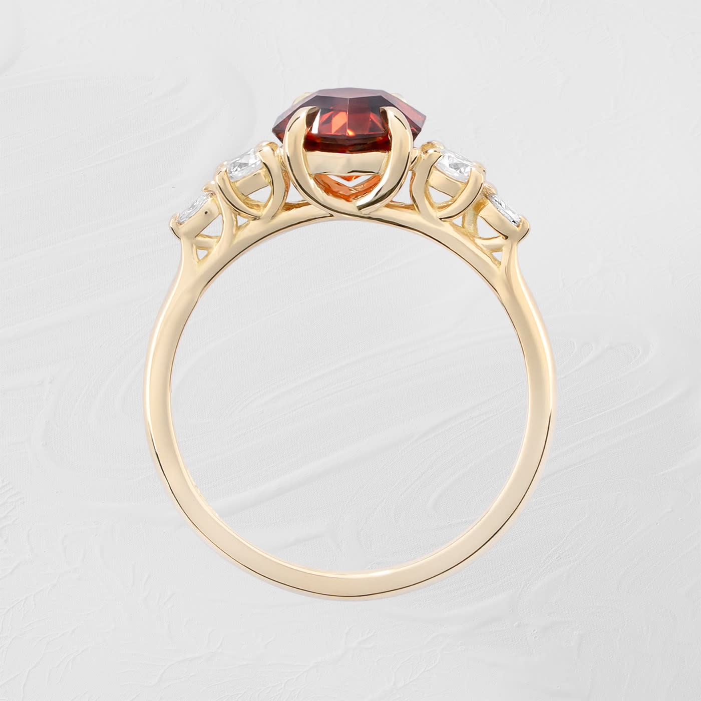This beautiful new ring features a 2.21ct hexagon cut spessartine garnet. It is flanked by round and marquise cut lab grown diamonds, in an intricate, weaving, trellis style 18ct yellow gold mount!