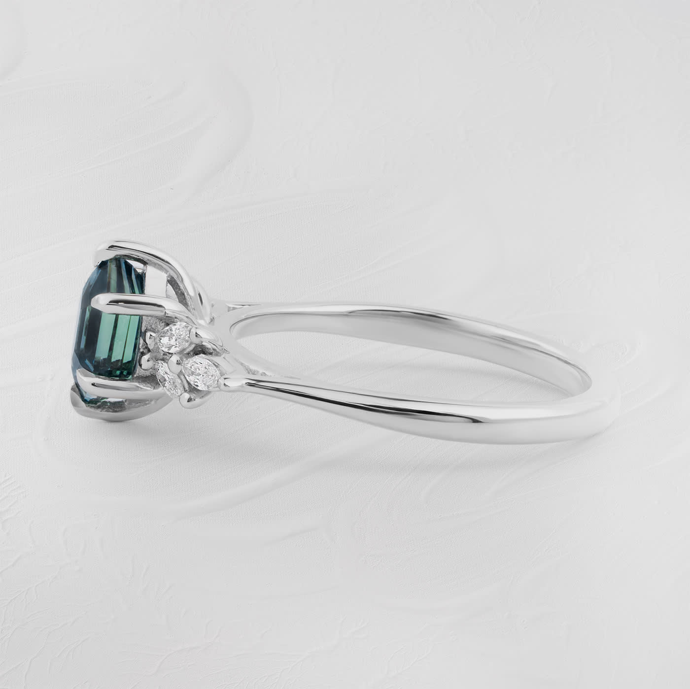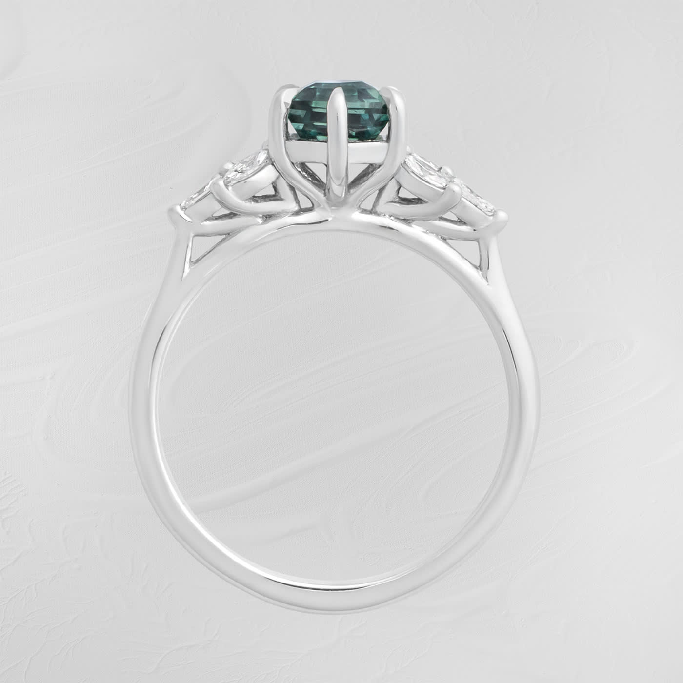 Description: This fine jewellery engagement ring features a 1.70ct elongated hexagon teal sapphire as its centre stone. The sapphire is set in an ornate platinum mount, flanked on either side by three marquise cut diamonds. This Pre Made Ring design focuses on showcasing the clarity and cut of the natural gemstones.