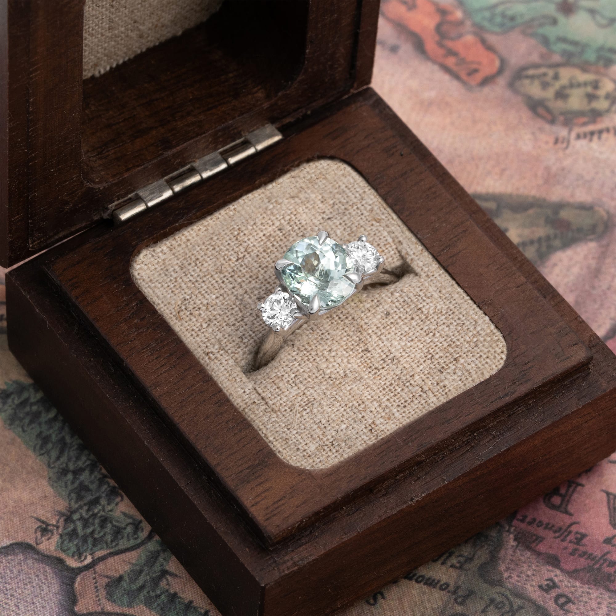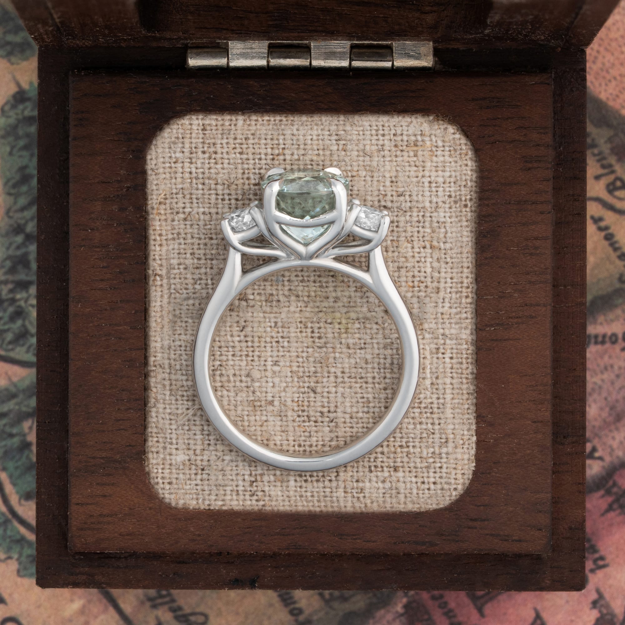 This trilogy engagement ring features a natural icy blue tourmaline center stone in an oval cut, secured by a four-talon setting. The center stone is flanked by two round brilliant cut lab-grown diamonds, all set within an intricate platinum mount. The design is characteristic of fine jewellery with Antique and Art deco influences.