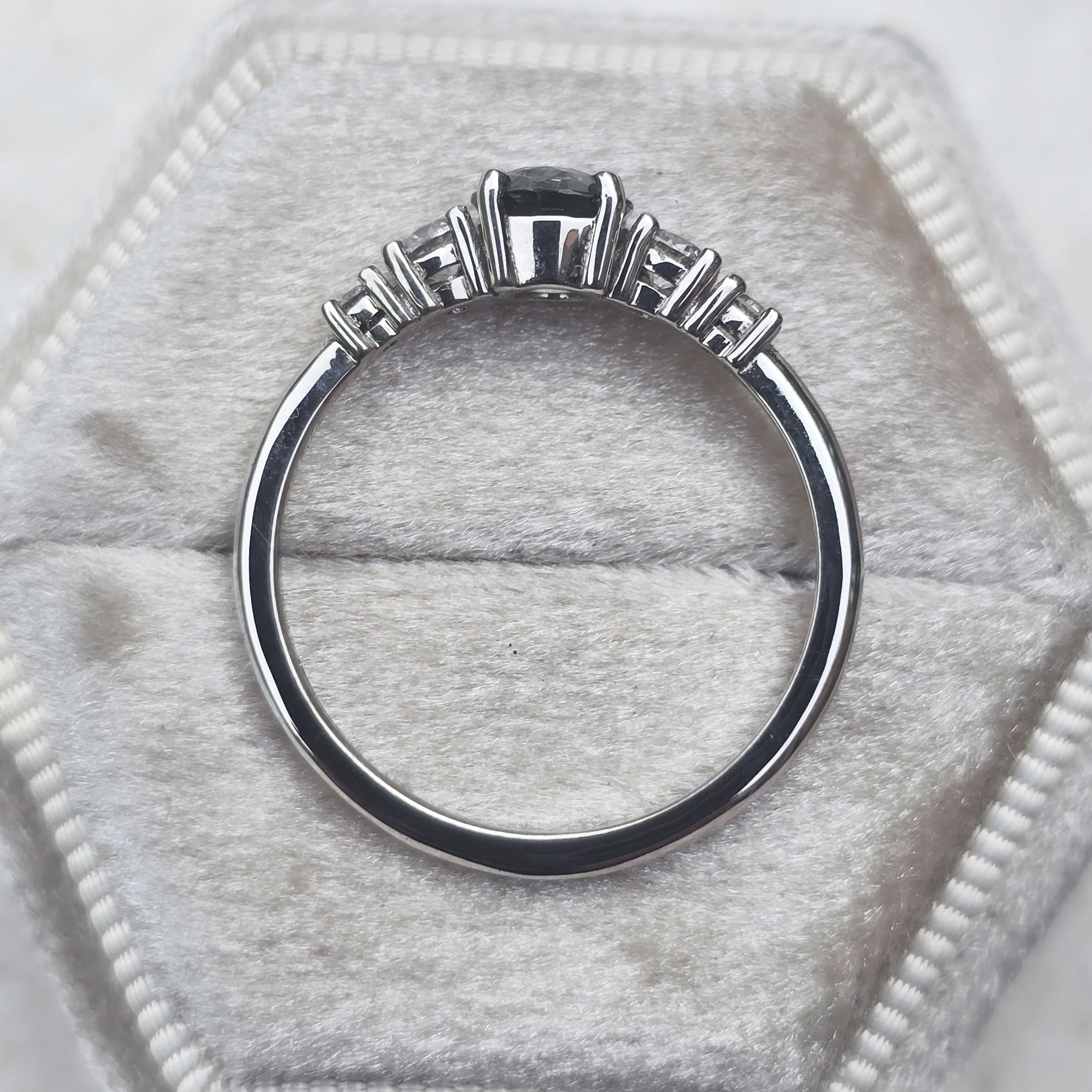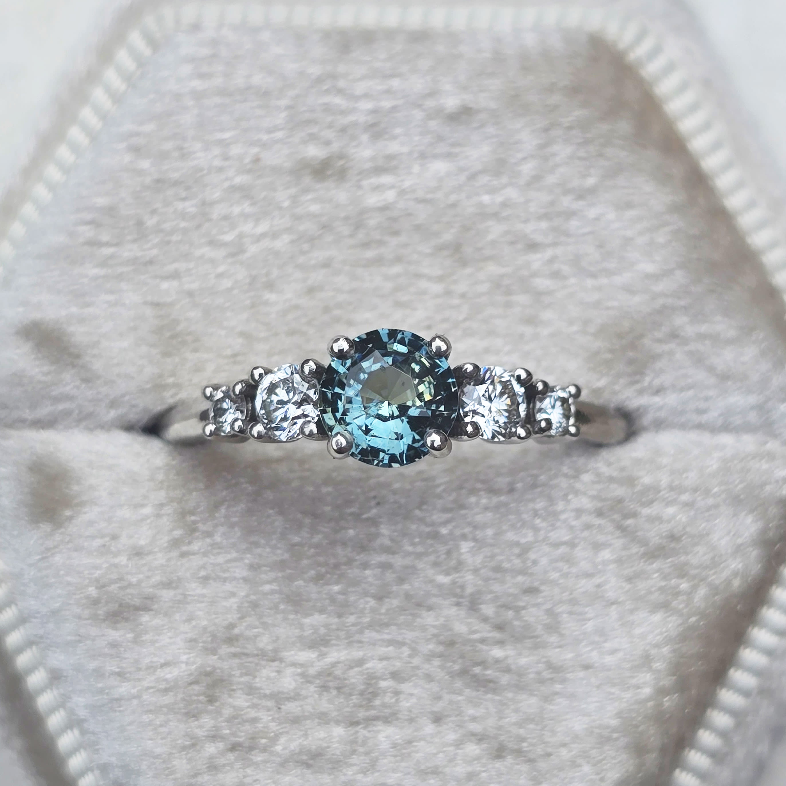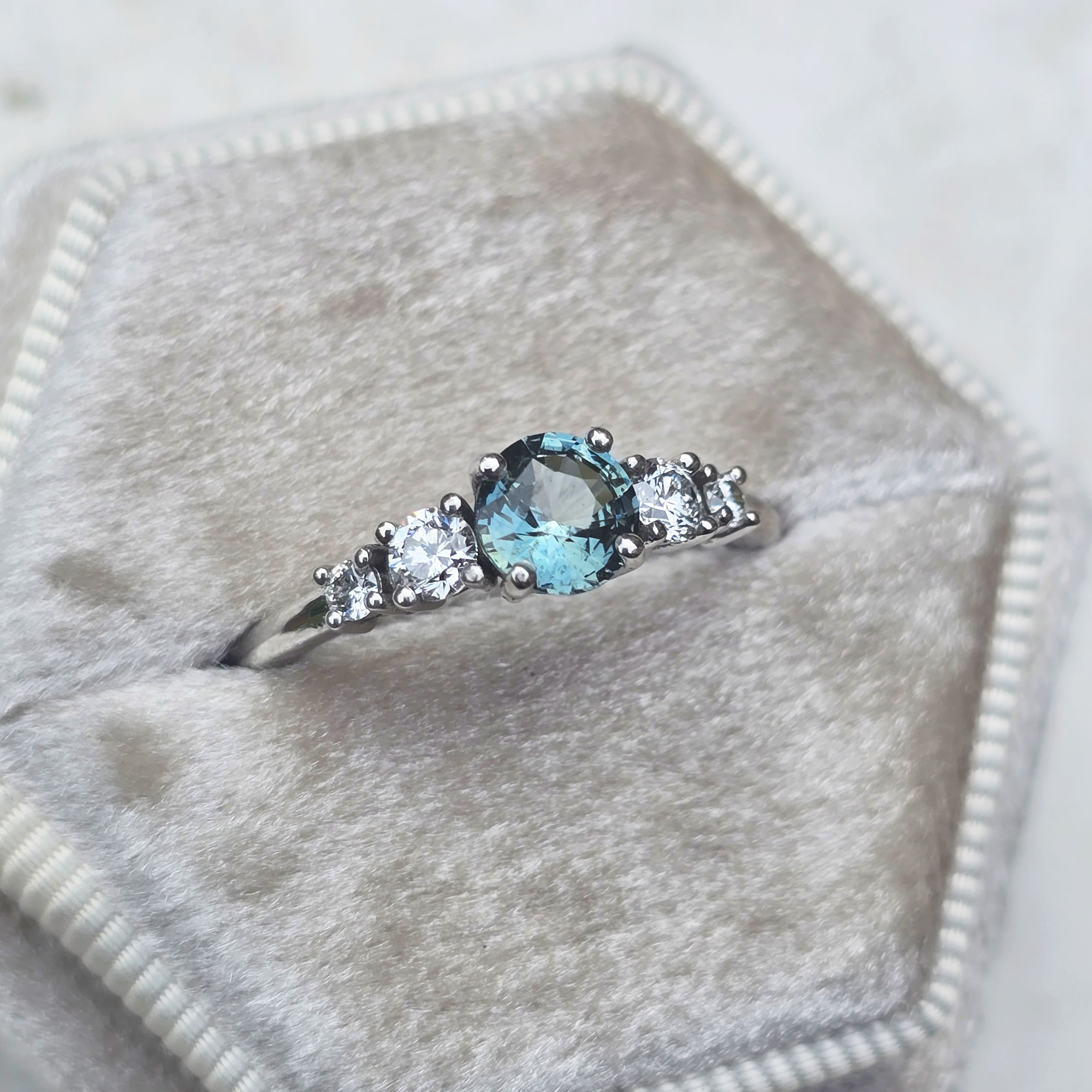 This brand new stunning ring features a central round cut natural, icy teal Sapphire, that has been prong set with 4 graduated brilliant cut lab grown diamonds, in a sleek and elegant low profile 18ct white gold mount.