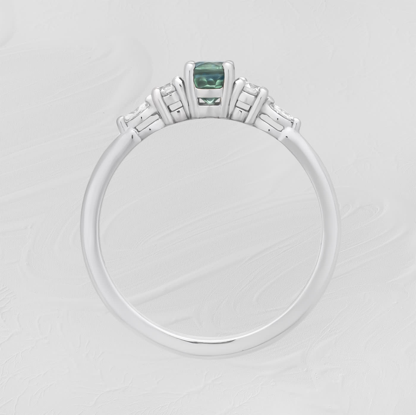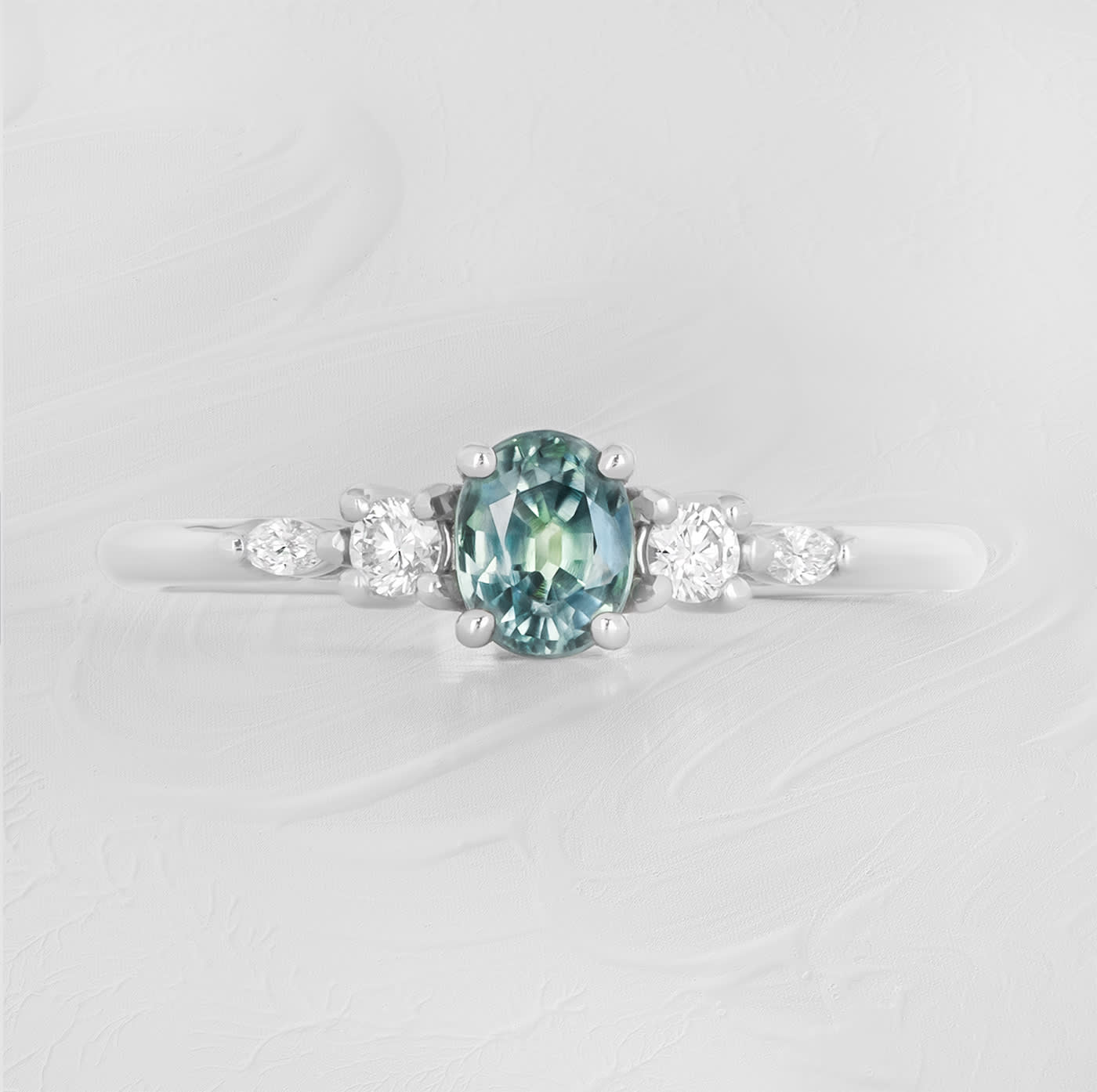 This elegant ring features a central 0.54ct oval icy teal sapphire. The sapphire has been 4 prong set with two round brilliant and two marquise diamonds in a classic 5 stone platinum setting!