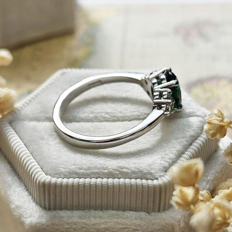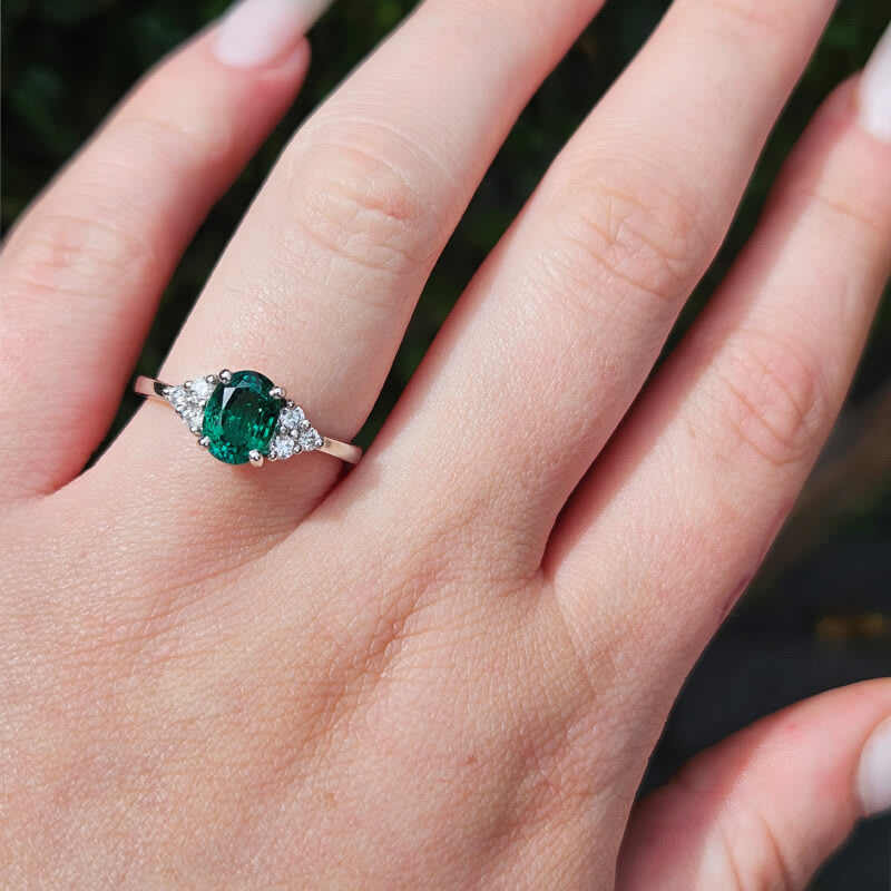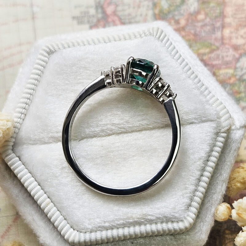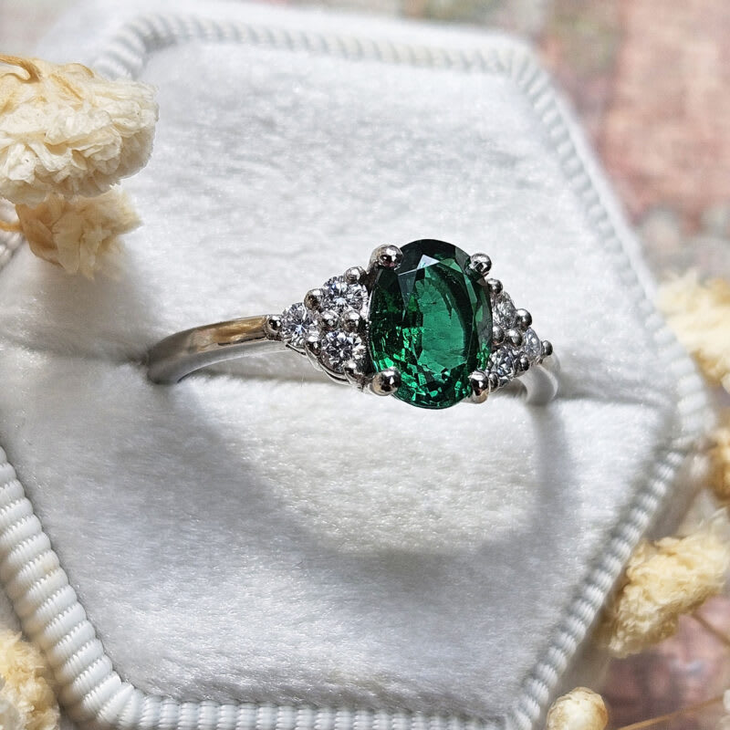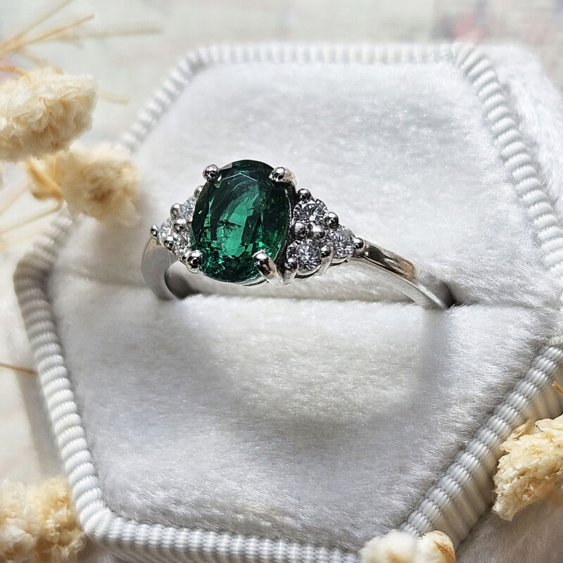 This absolutely gorgeous ring features a dazzling oval cut lab created Emerald, with 6 diamonds flanking on either side in a platinum mount!
