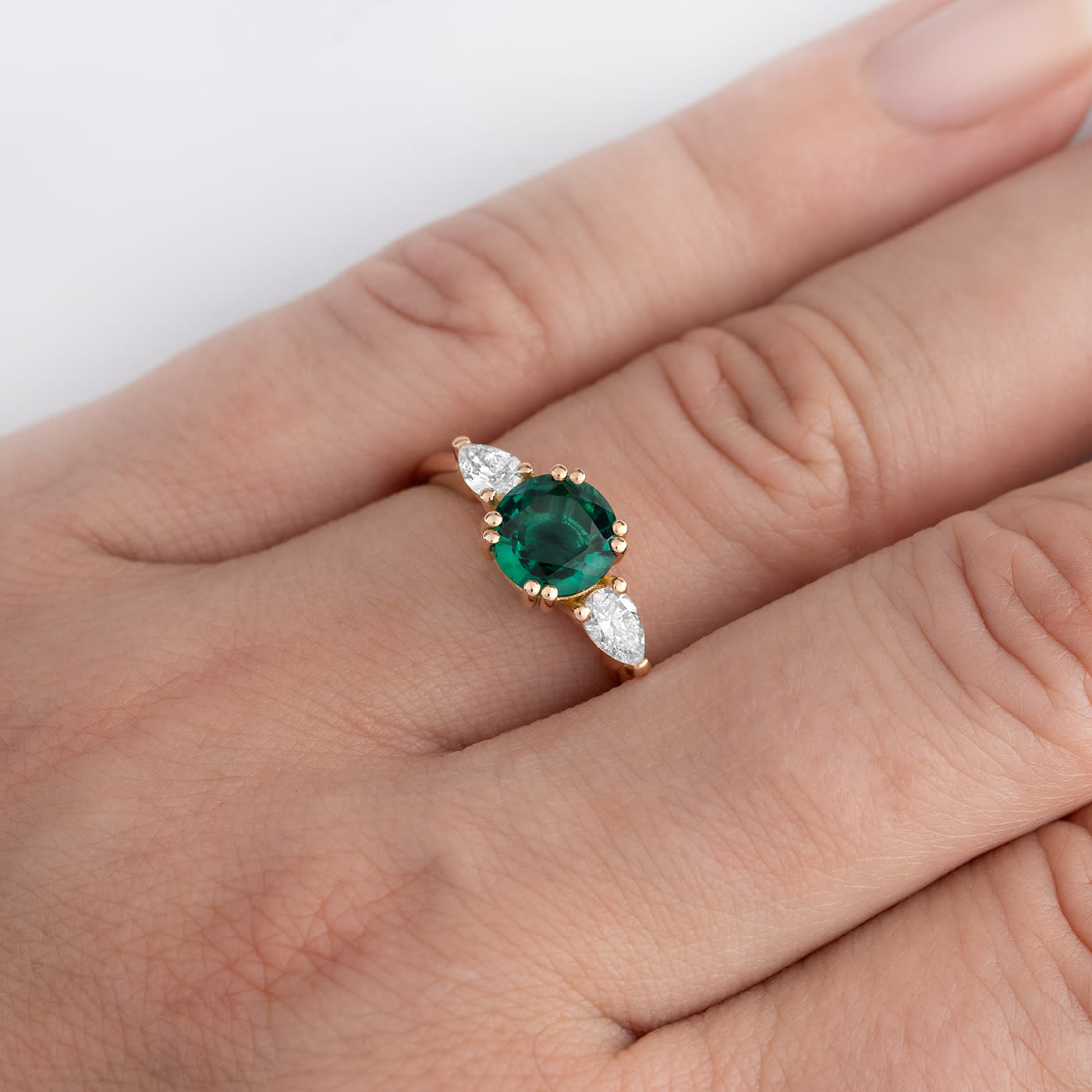 Description: This trilogy engagement ring features a lab grown emerald centre stone, set with double prongs for security. The central emerald is flanked by two pear cut lab-grown diamonds, creating a three-stone design. The design is secured on a slim 1.6mm band profile.