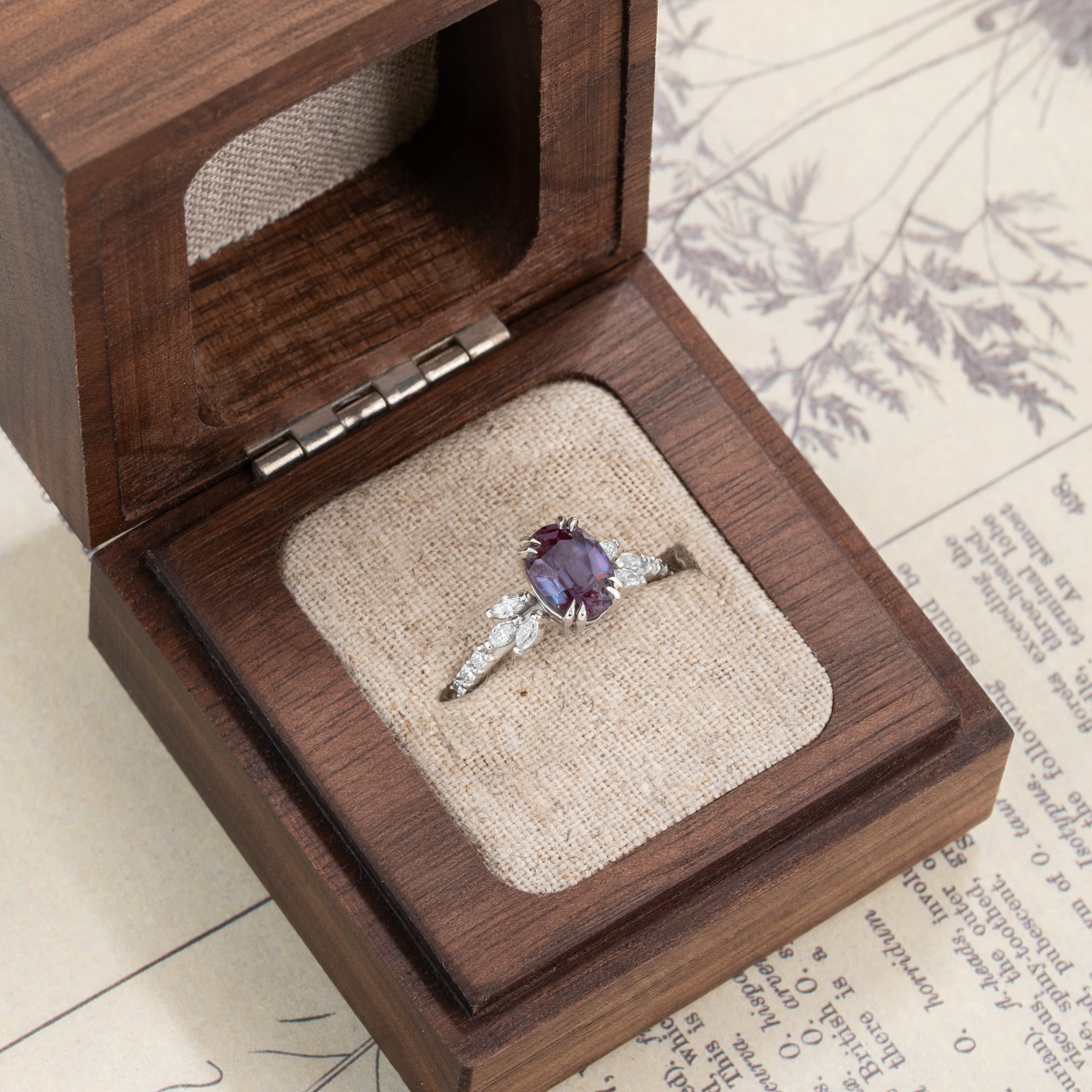 Description: This diamond engagement ring features a central 1.2 carat lab grown oval Alexandrite, secured by a double talon setting in platinum. The centre stone is flanked by six marquise cut diamonds and six round brilliant cut diamonds, arranged in a floral-inspired shoulder design. The Alexandrite exhibits a natural colour change property.