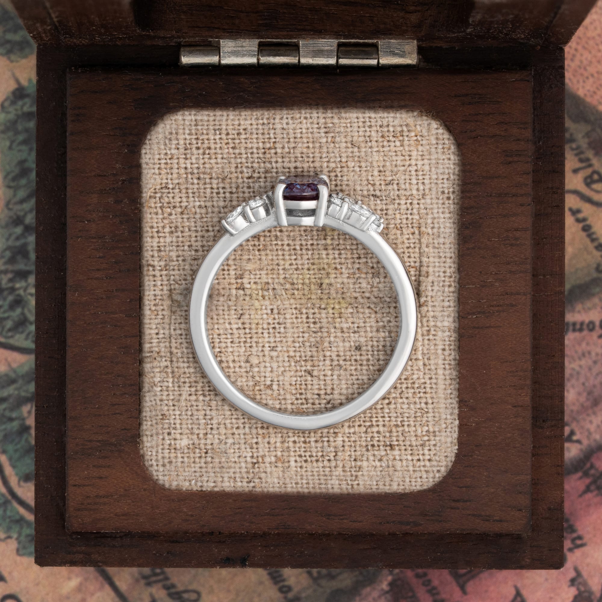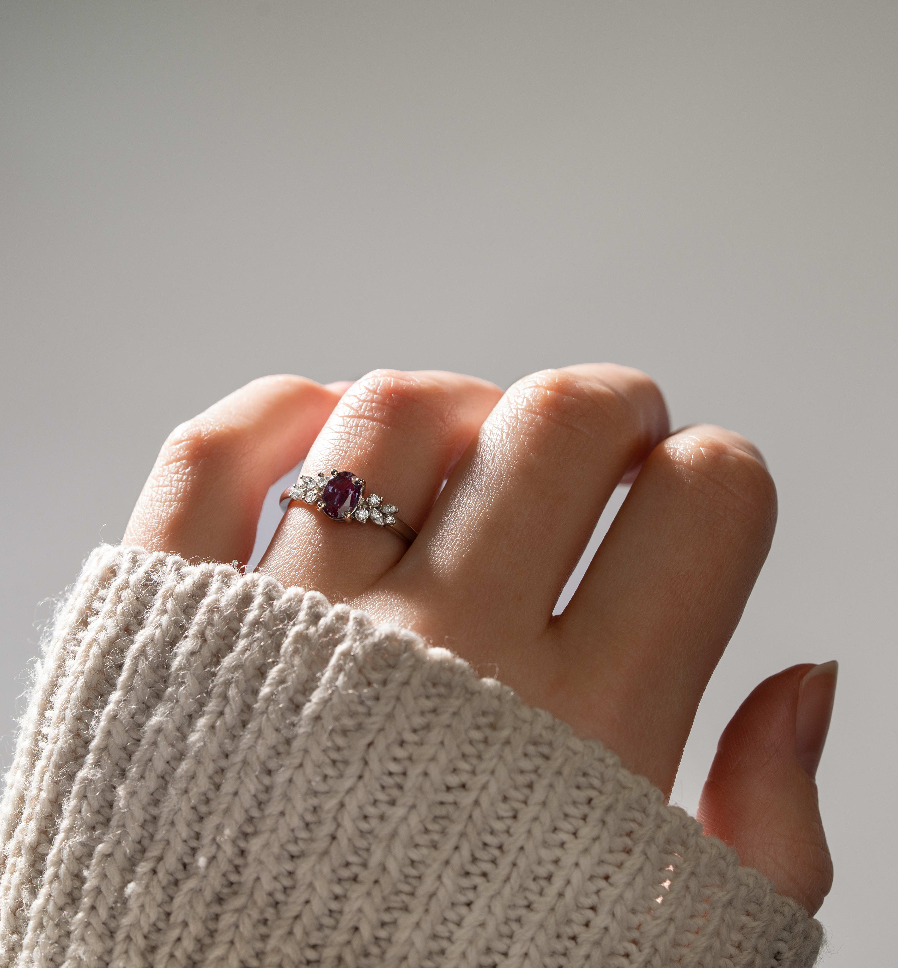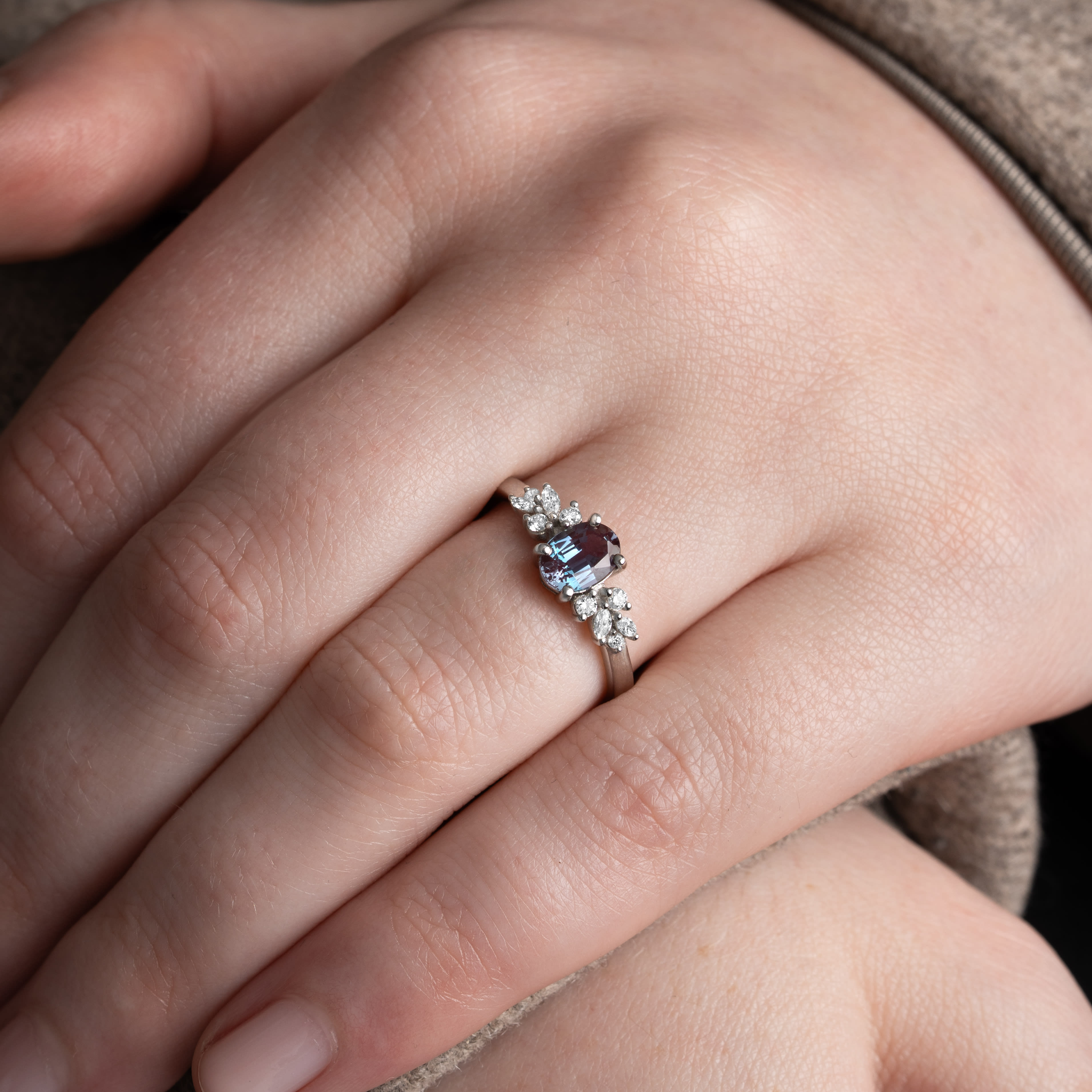 Description: This lab grown alexandrite and diamond floral ring features an oval cut alexandrite centre stone surrounded by a cluster of marquise and round cut diamonds. The accent stones are set in a flowing, floral-inspired pattern. The fine jewellery design is low profile from the finger for practical wear, with a 1.6 mm band thickness.
