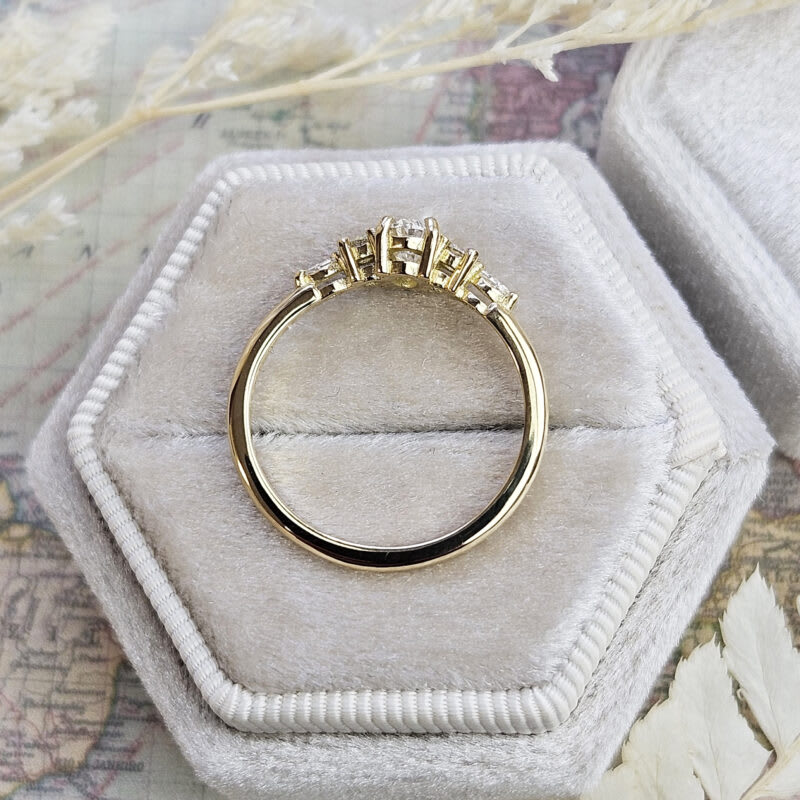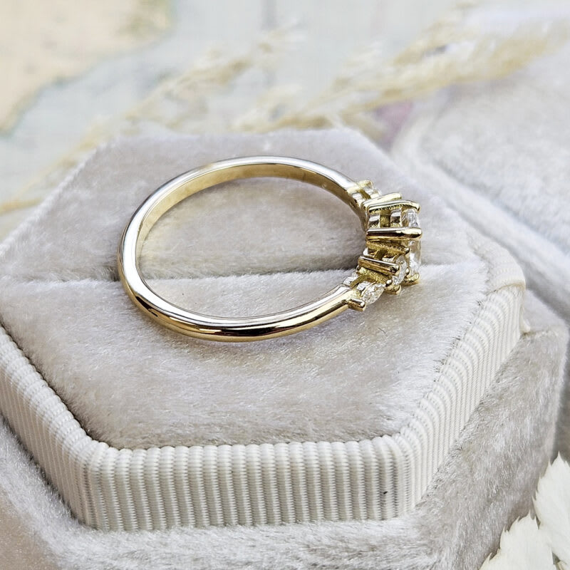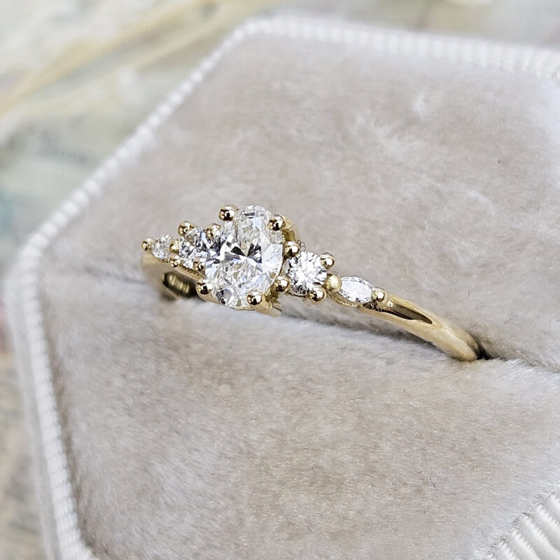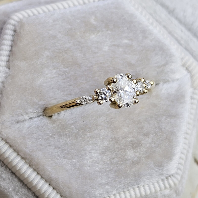This brand new ring features a central oval cut lab grown diamond, flanked by two round brilliant and two marquise cut diamonds in our 5 stone 18ct yellow gold setting!