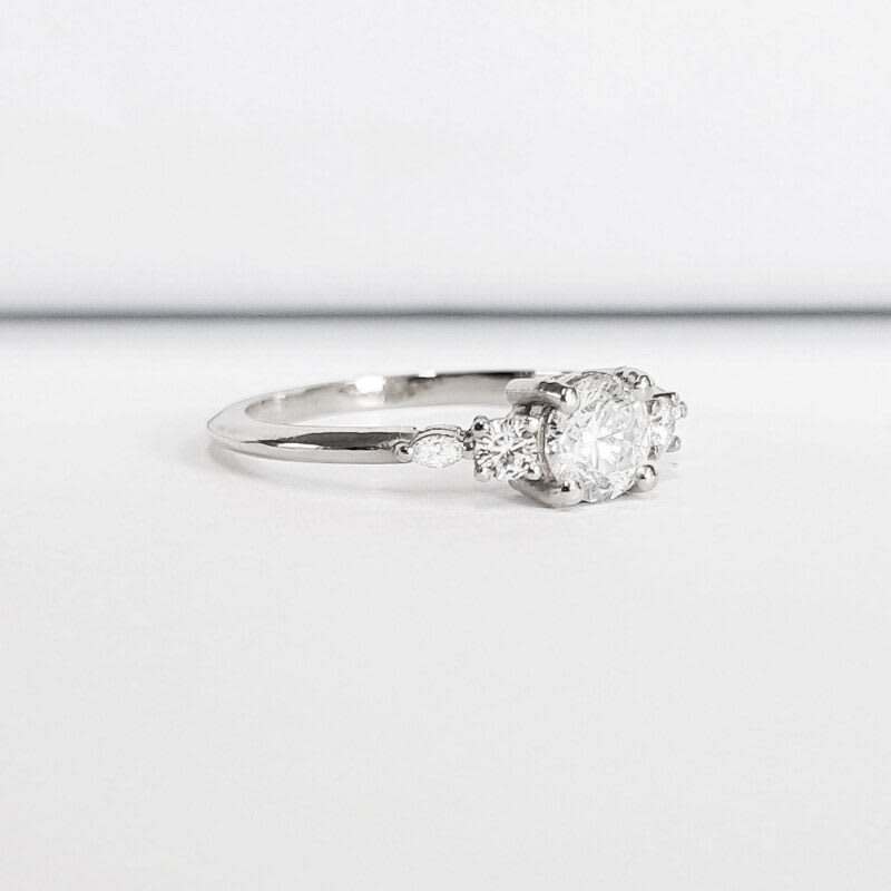 This brand new stunning ring features a central 0.5 carat lab grown diamond, set in a stunning antique inspired mount that has been studded with brilliant and marquise cut lab diamonds