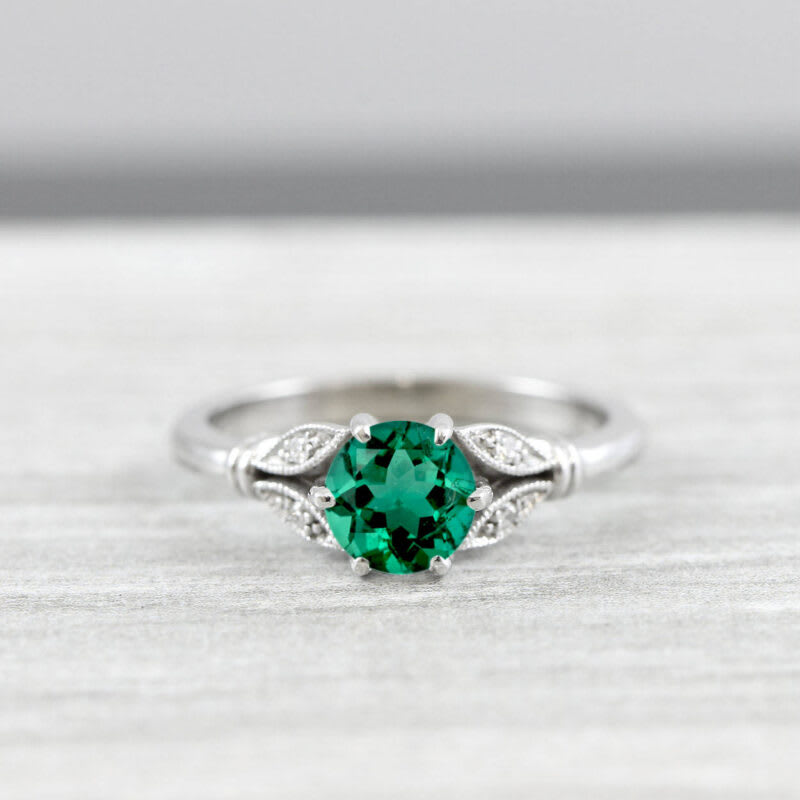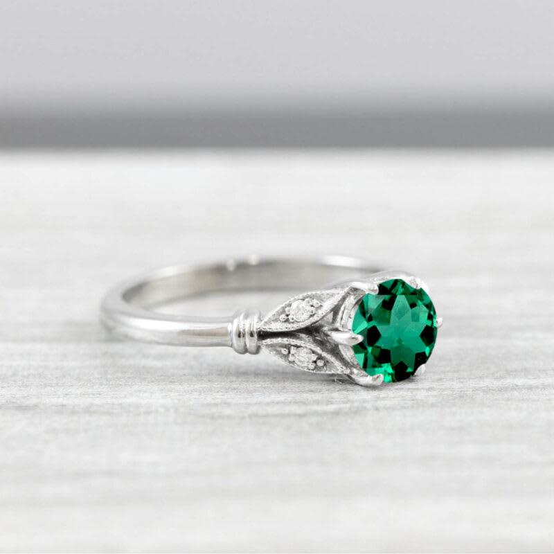 This brand new stunning ring features a central round Lab grown emerald, set in a gorgeous floral inspired gold mount, with 4 diamond accent stones!