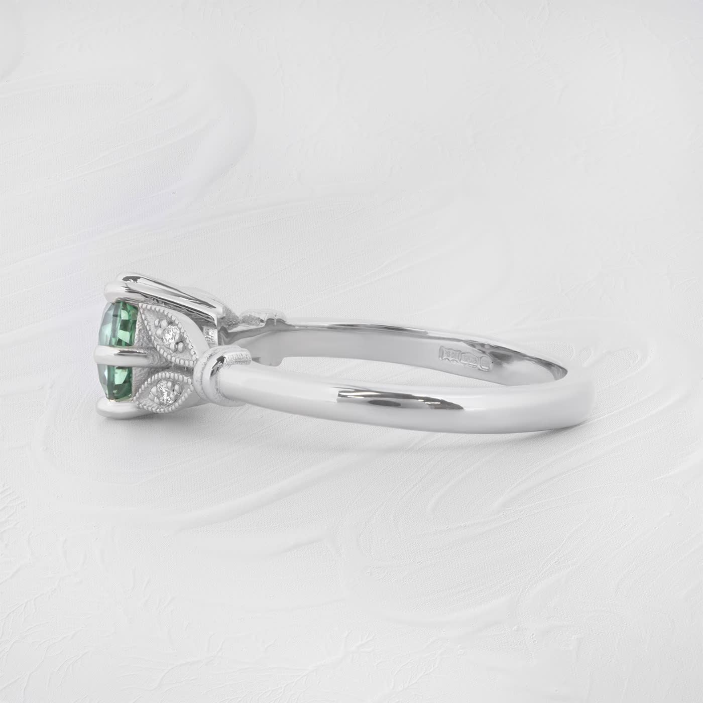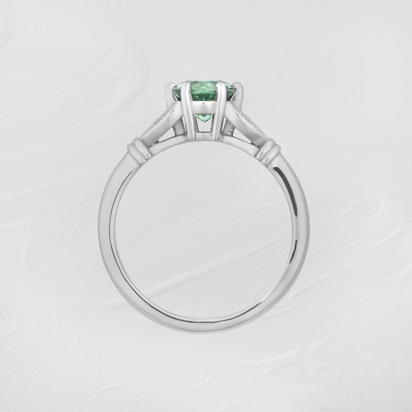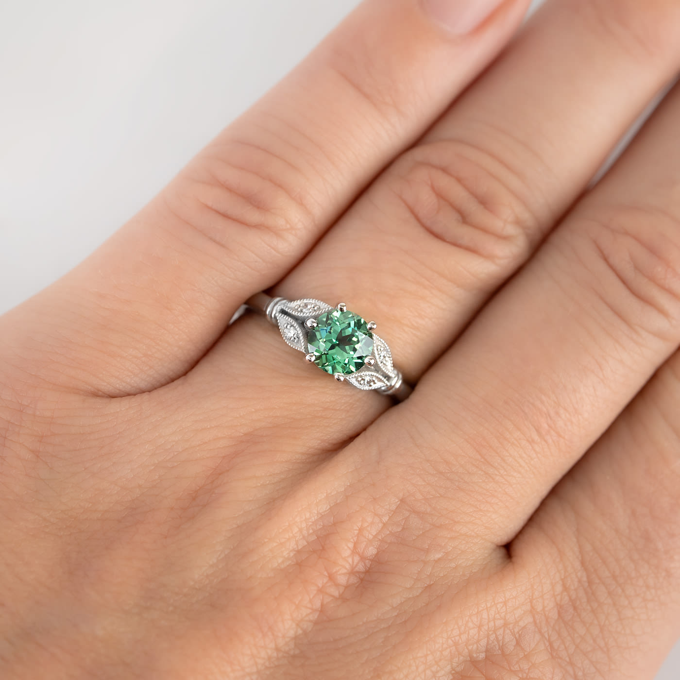 This brand new stunning ring features a central round lab grown green sapphire, set in a gorgeous floral inspired mount, with 4 lab diamond accents set into the leaf detailing.