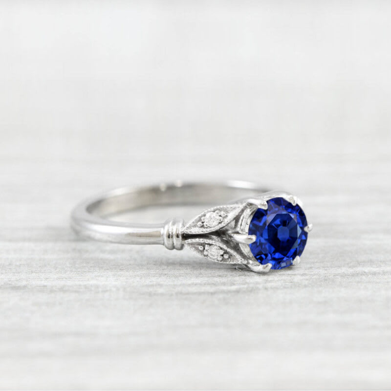 This brand new stunning ring features a central round Lab grown sapphire, set in a gorgeous floral inspired gold mount, with 4 diamond accent stones!