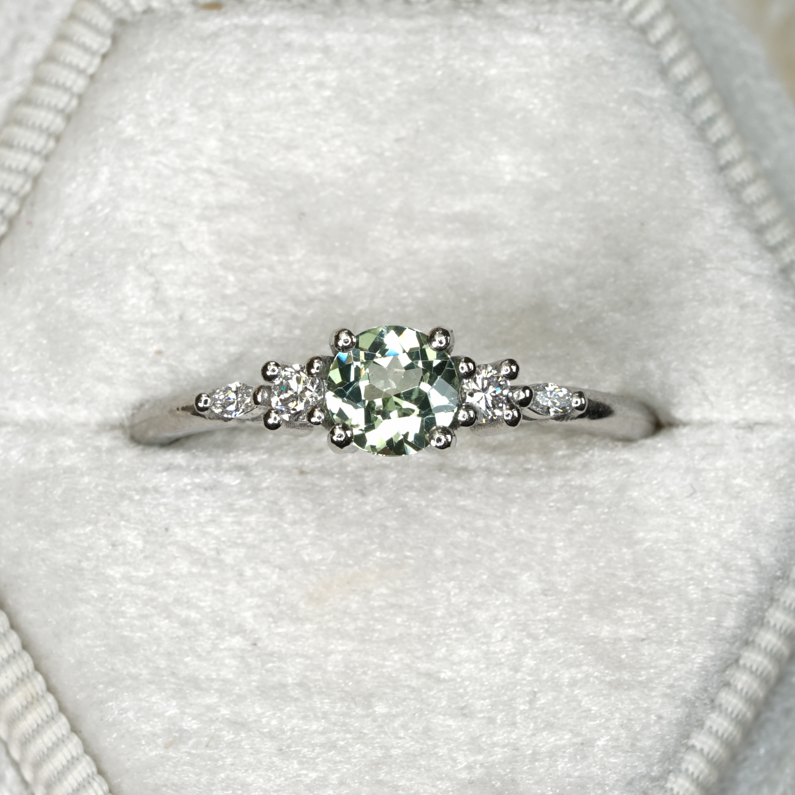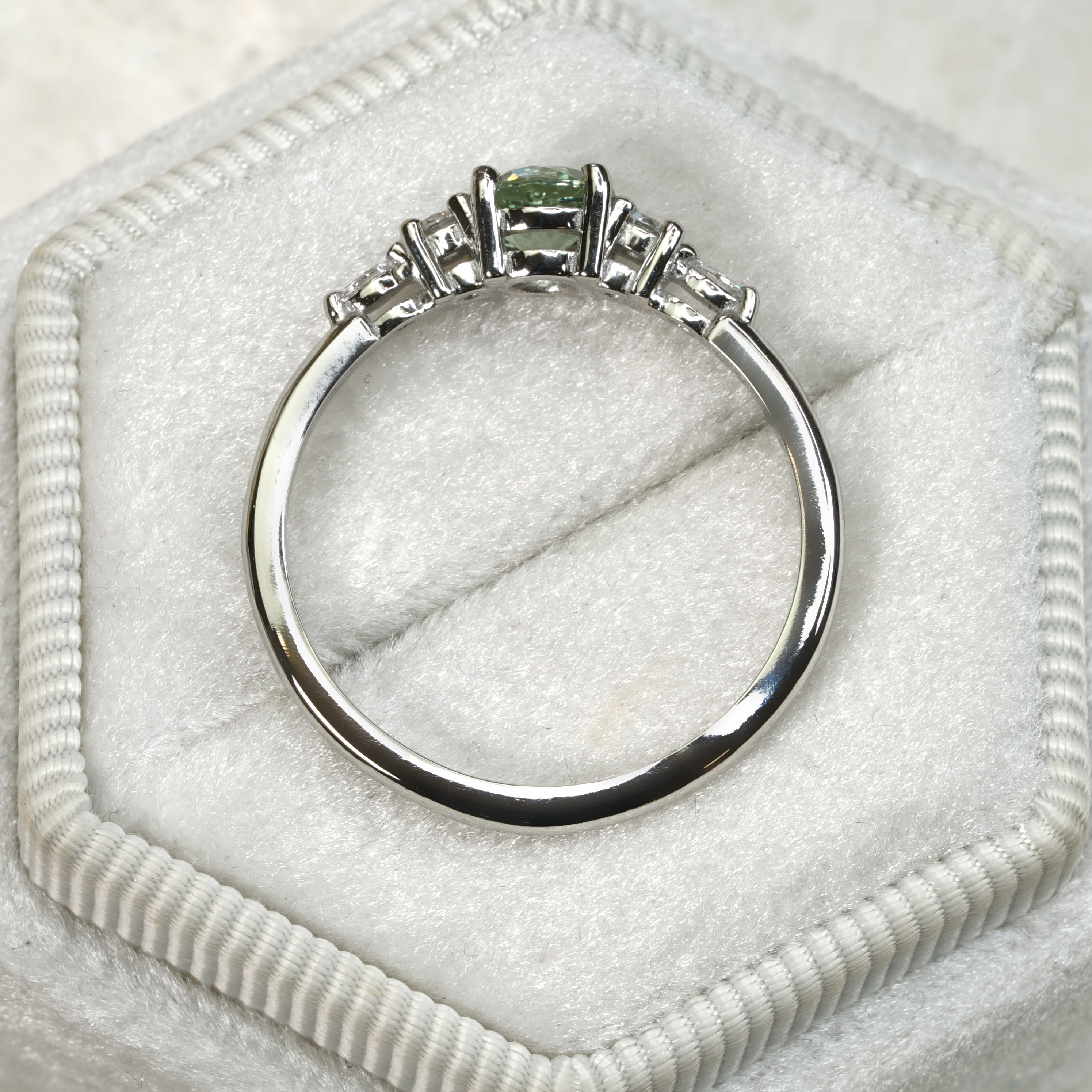 This brand new stunning ring features a central lab grown seafoam green sapphire, that has been prong set with graduated accent lab diamonds, in a sleek and elegant low profile mount. Jewels: Lab Sapphire, Lab Diamonds Centre lab grown Sapphire: 0.5ct, round cut, 5mm, light blueish-green Accent lab diamonds: 0.12ct total F/G colour VS clarity Metal: Platinum Size: P