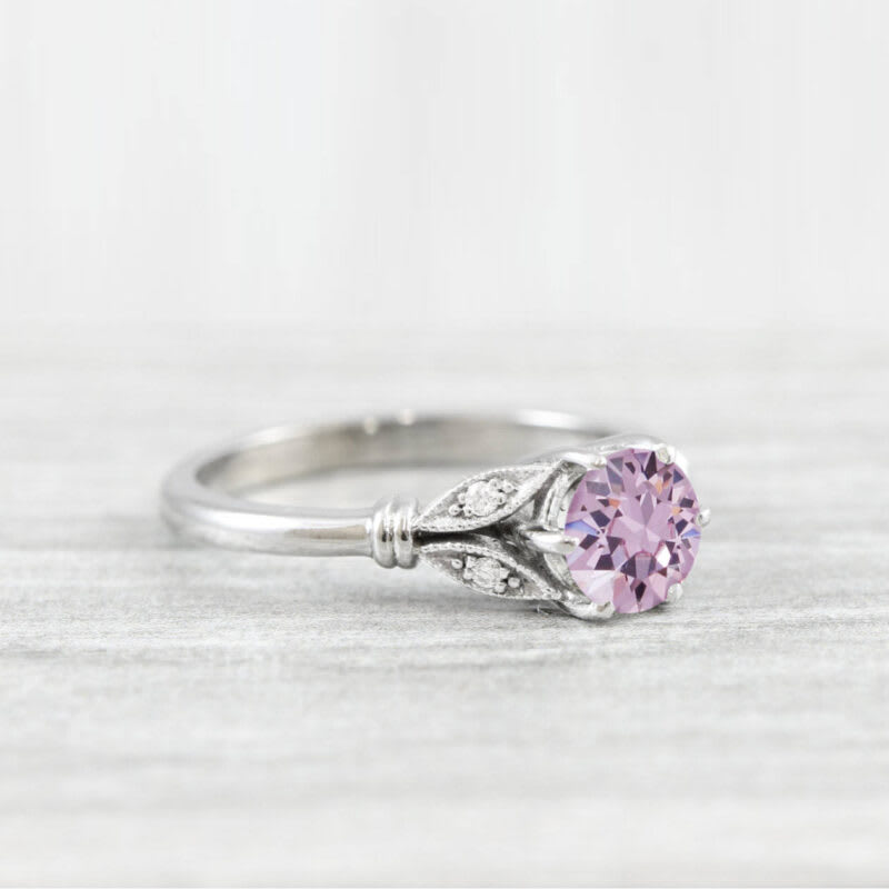 This brand new stunning ring features a central round natural round lavender Amethyst, set in a gorgeous floral inspired gold mount, with 4 diamond accent stones!