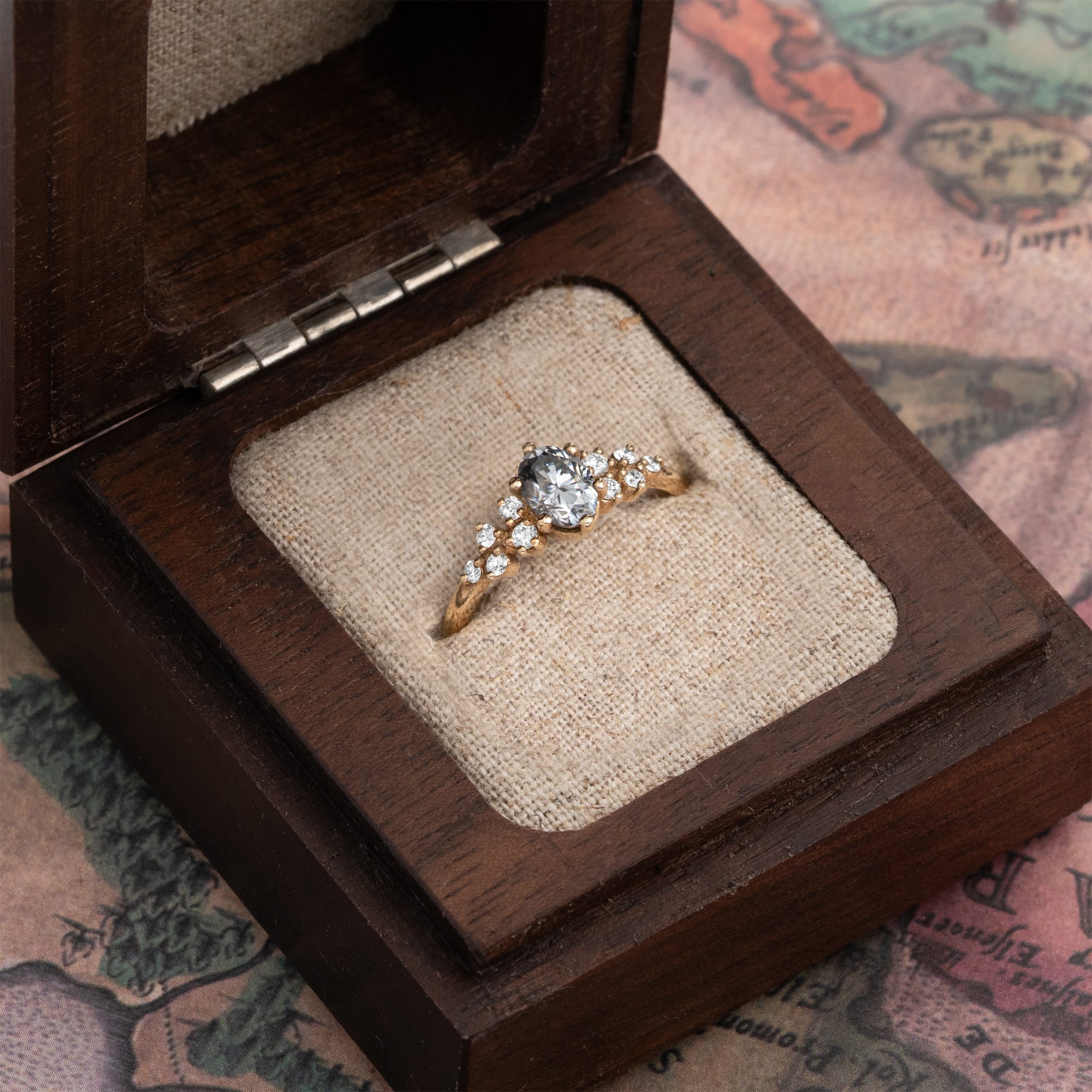 Description: This engagement ring features a central 0.8ct oval cut grey moissanite, a lab-grown stone, set in a cluster mount design. The centre stone is flanked by ten round brilliant cut natural diamonds totalling 0.23ct. The overall design presents a floral-inspired cluster setting on a fine jewellery band.