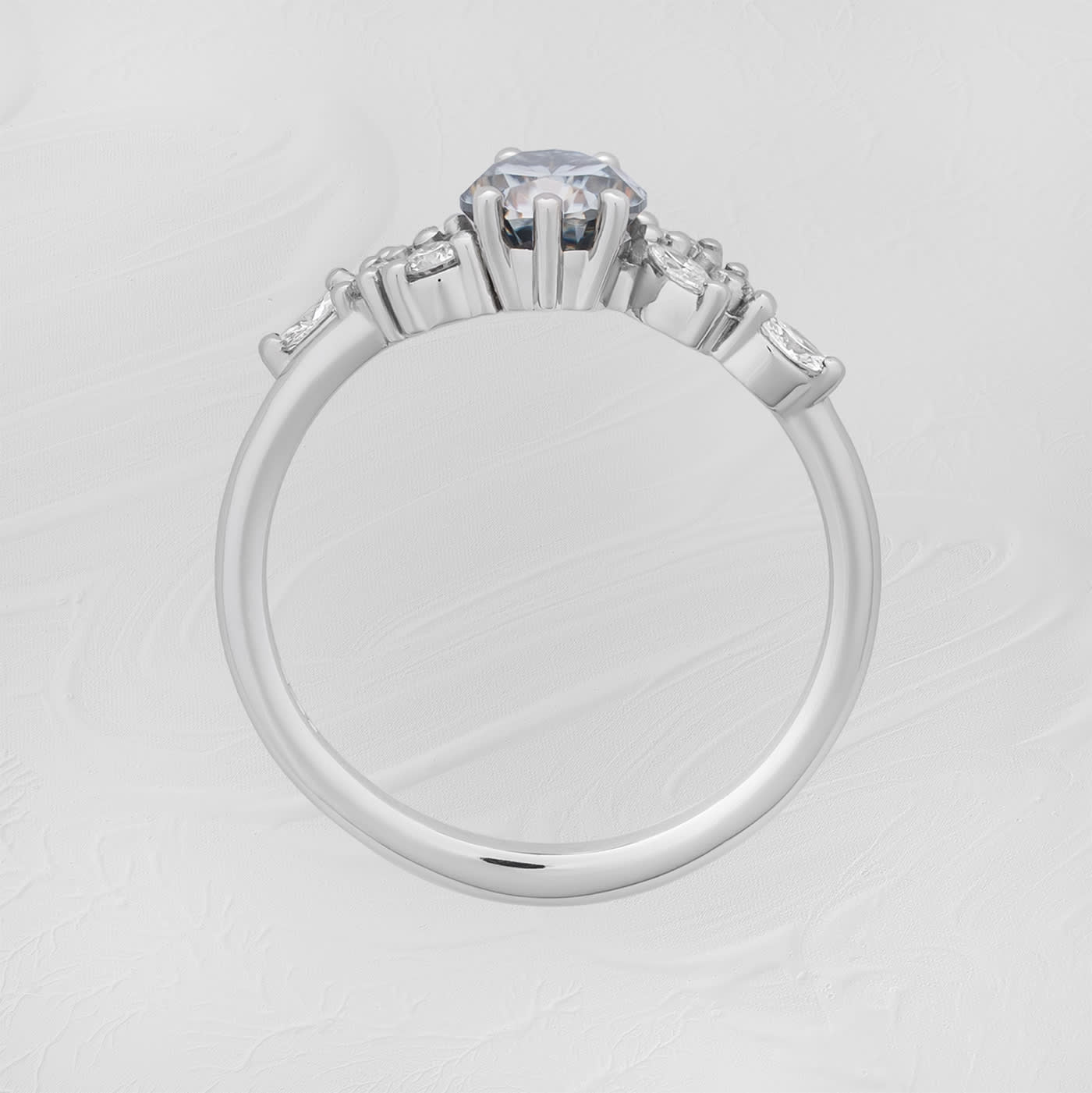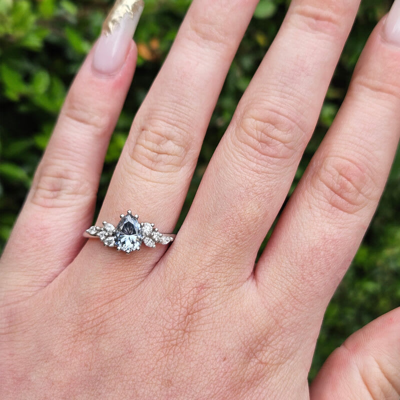 This brand new ring features a mesmerizing pear cut light grey moissanite, set with a mixture of marquise and round cut diamonds in a flowing, floral inspired pattern. The ring is designed to be low profile from the finger.