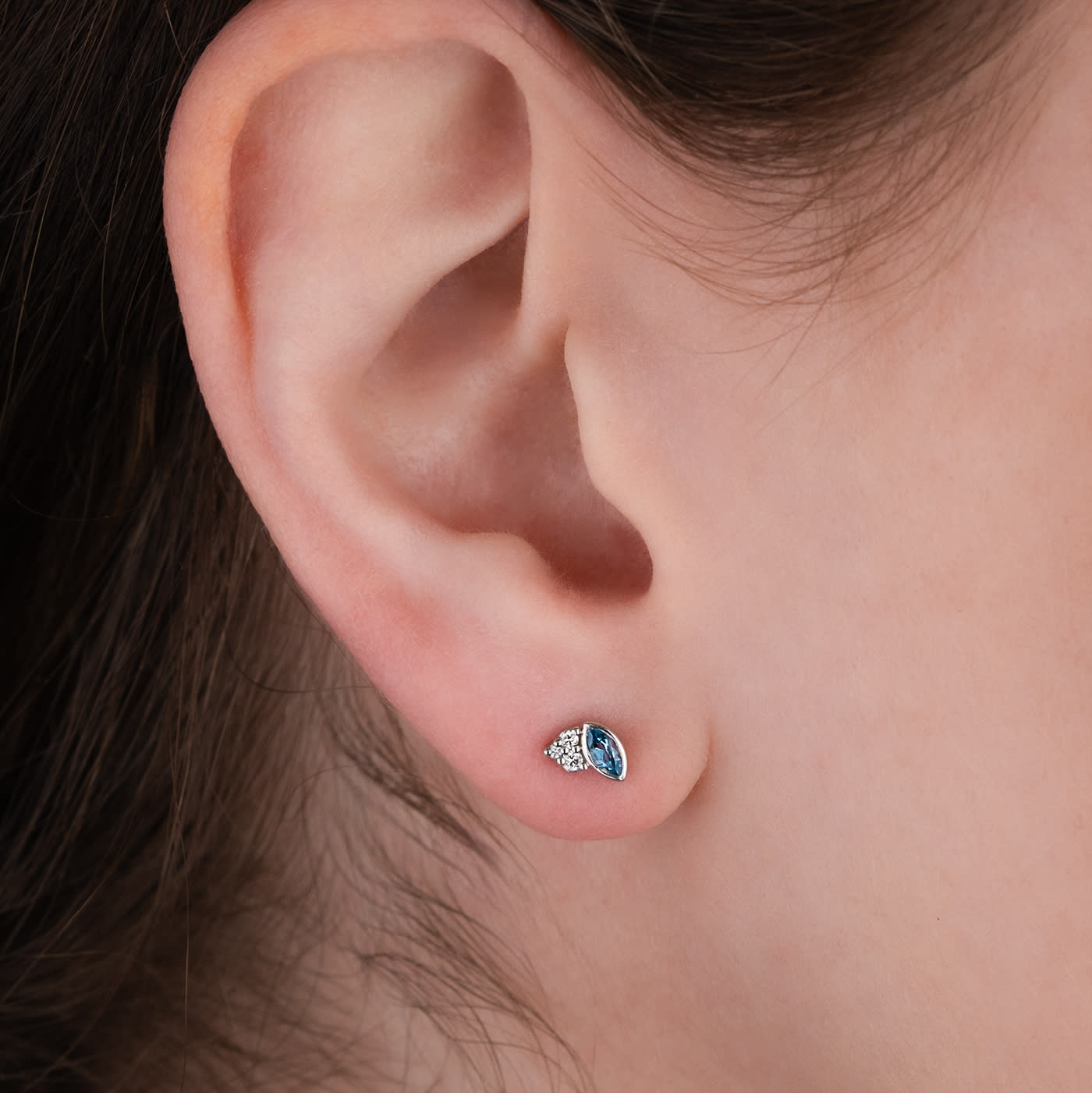 These beautiful new stud earrings feature a central natural marquise cut aquamarine in a bezel setting, accented with 3 diamonds, all in 14ct gold.