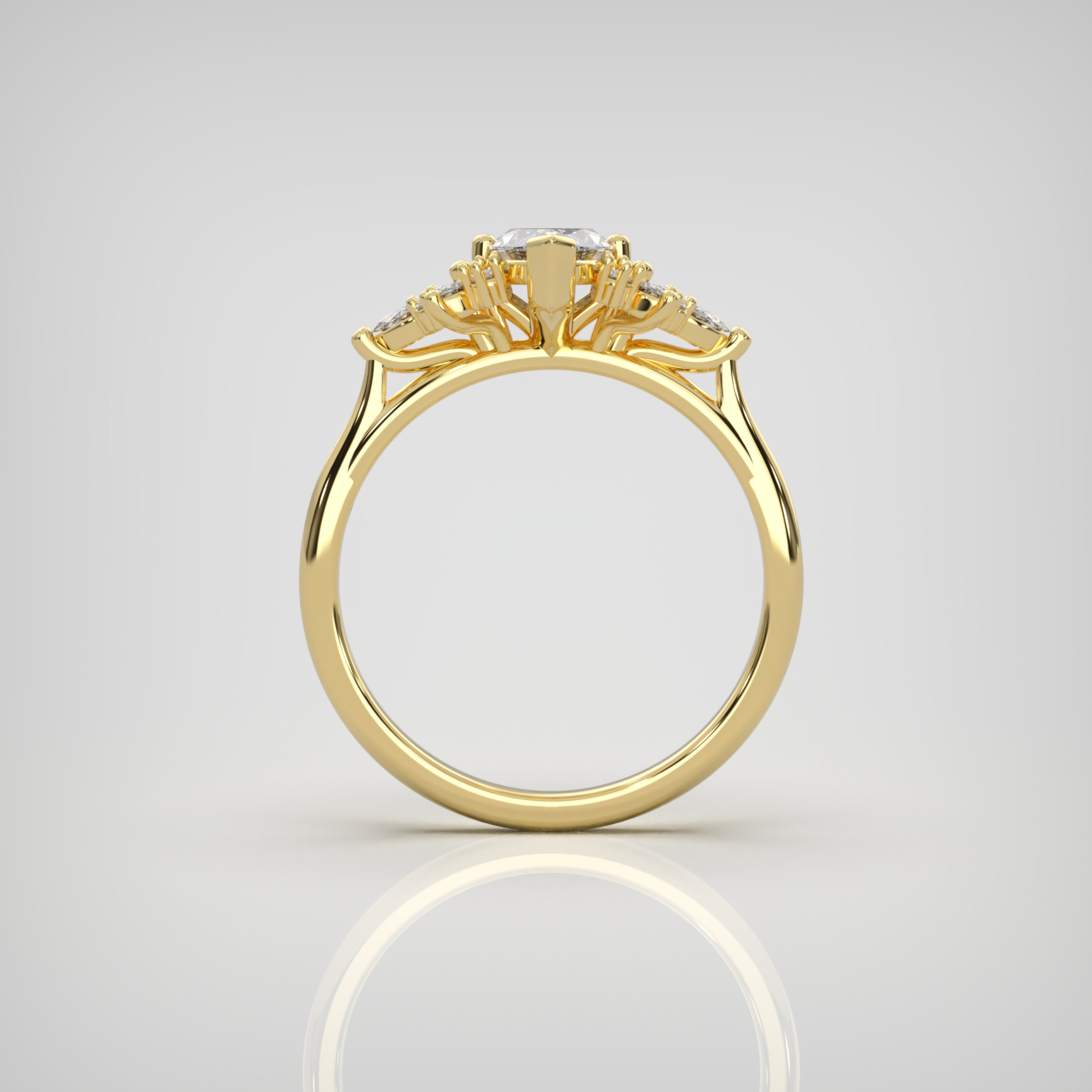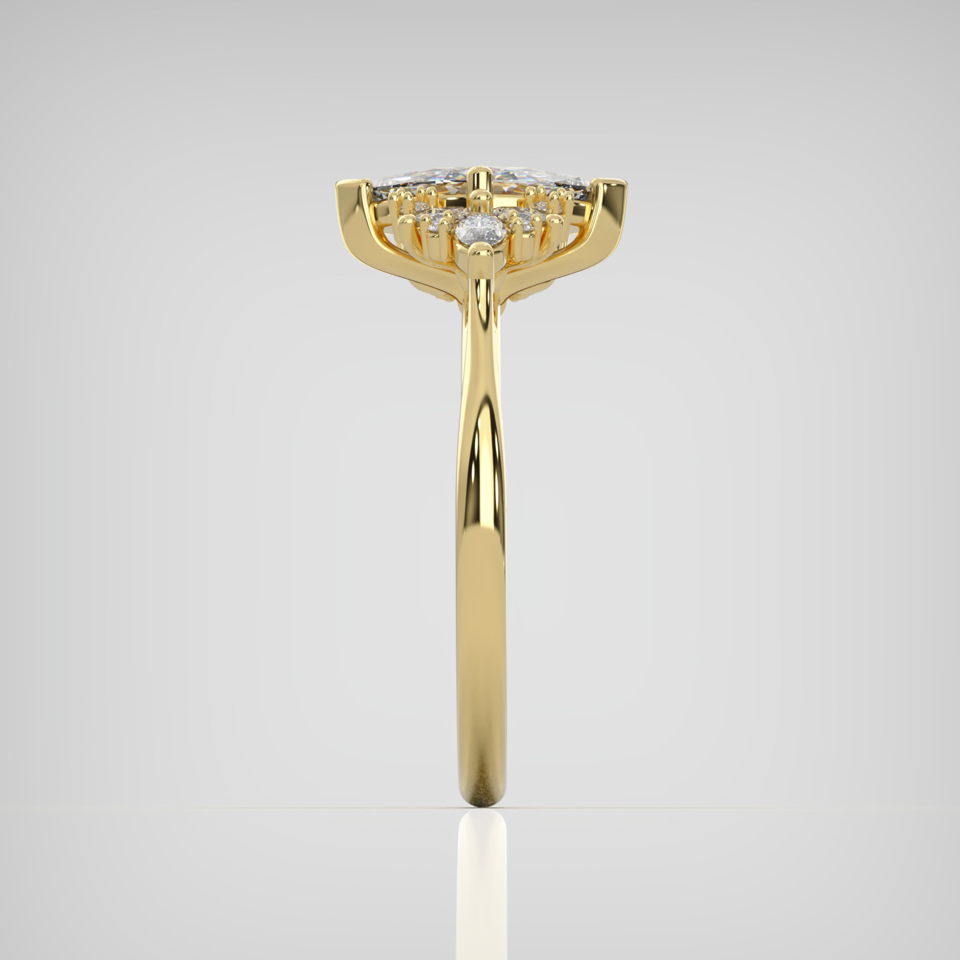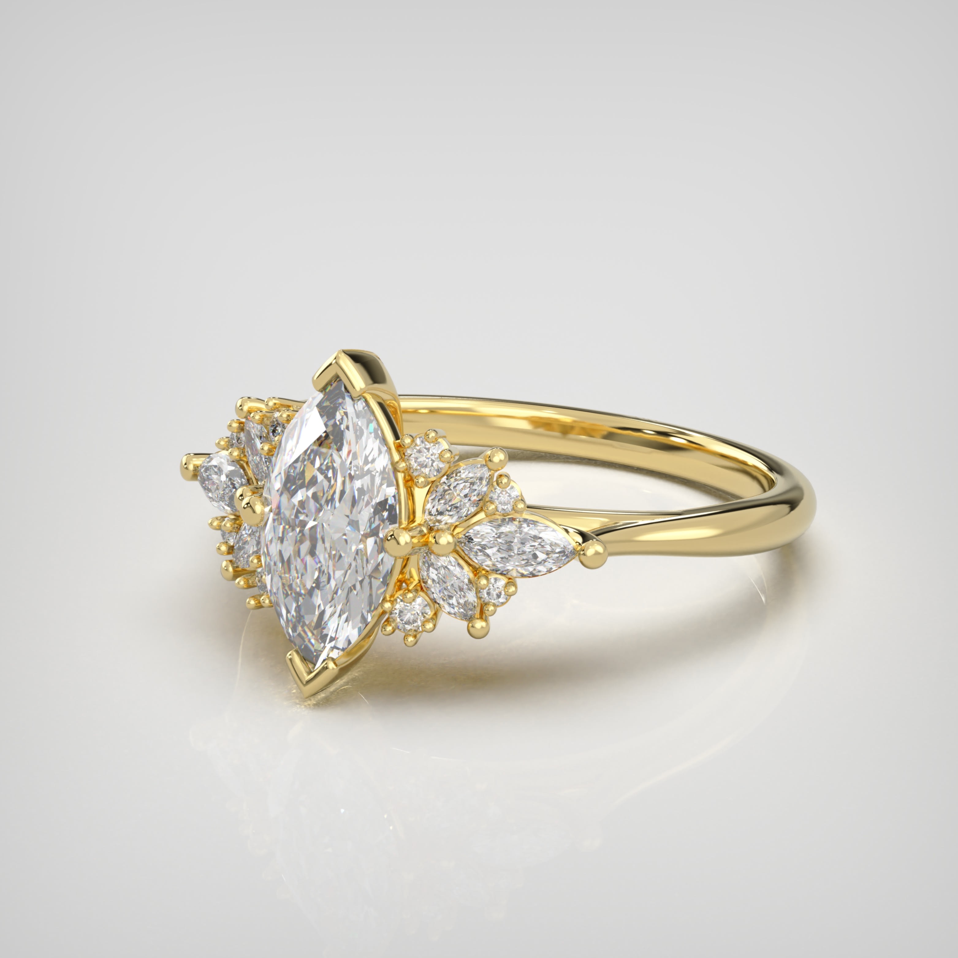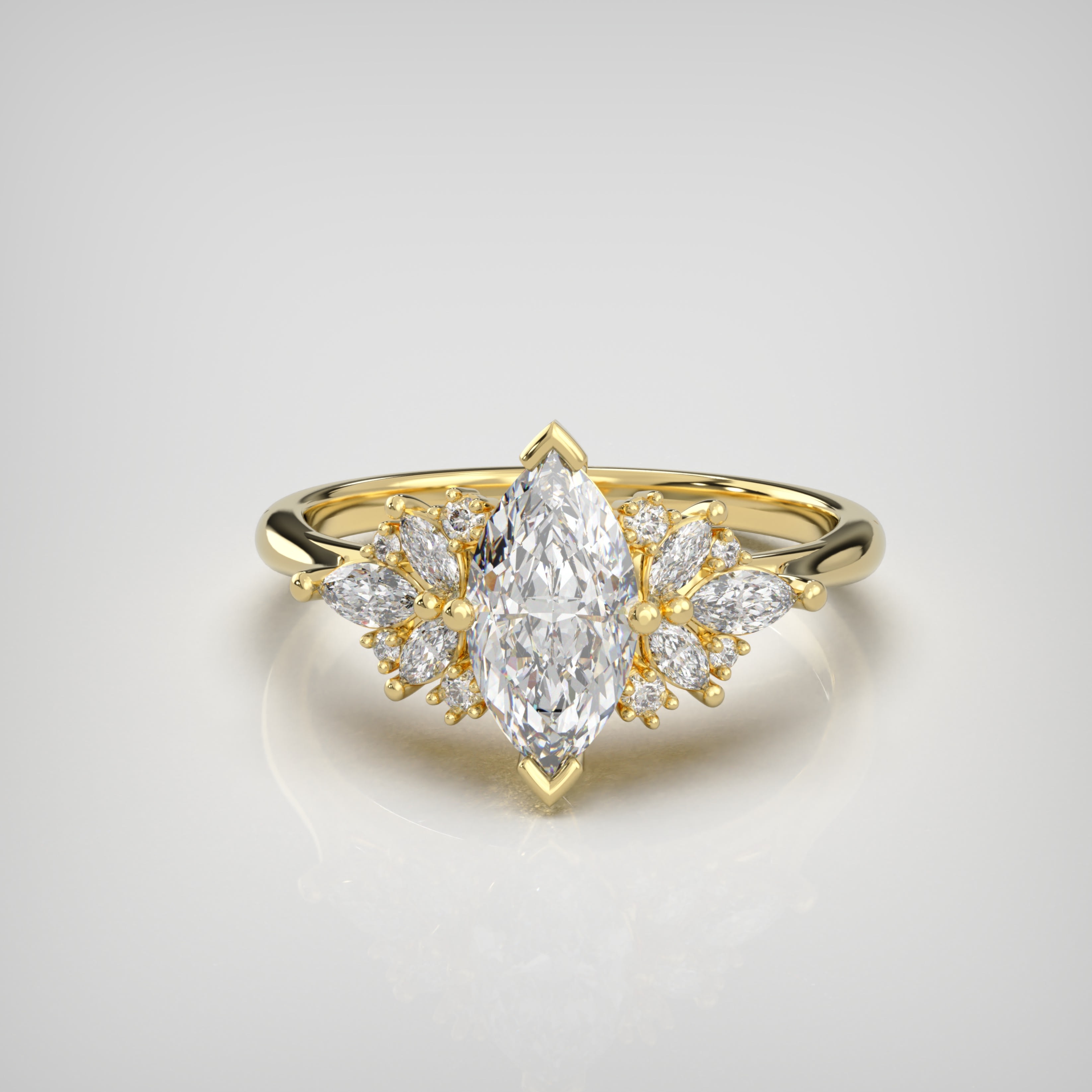 A celebration of timeless romance, this enchanting ring features a captivating marquise diamond at its center, flanked by delicate marquise and round accent stones.