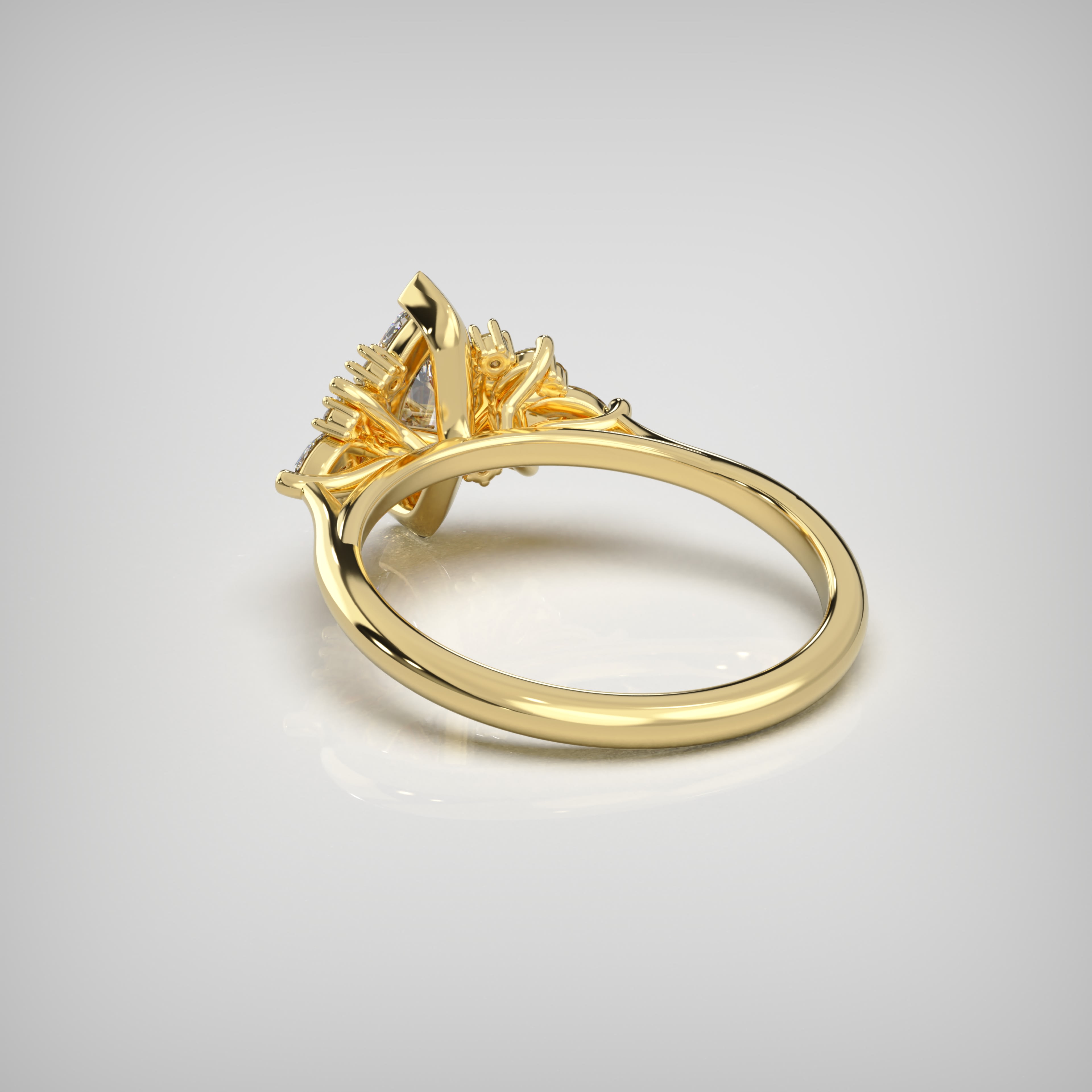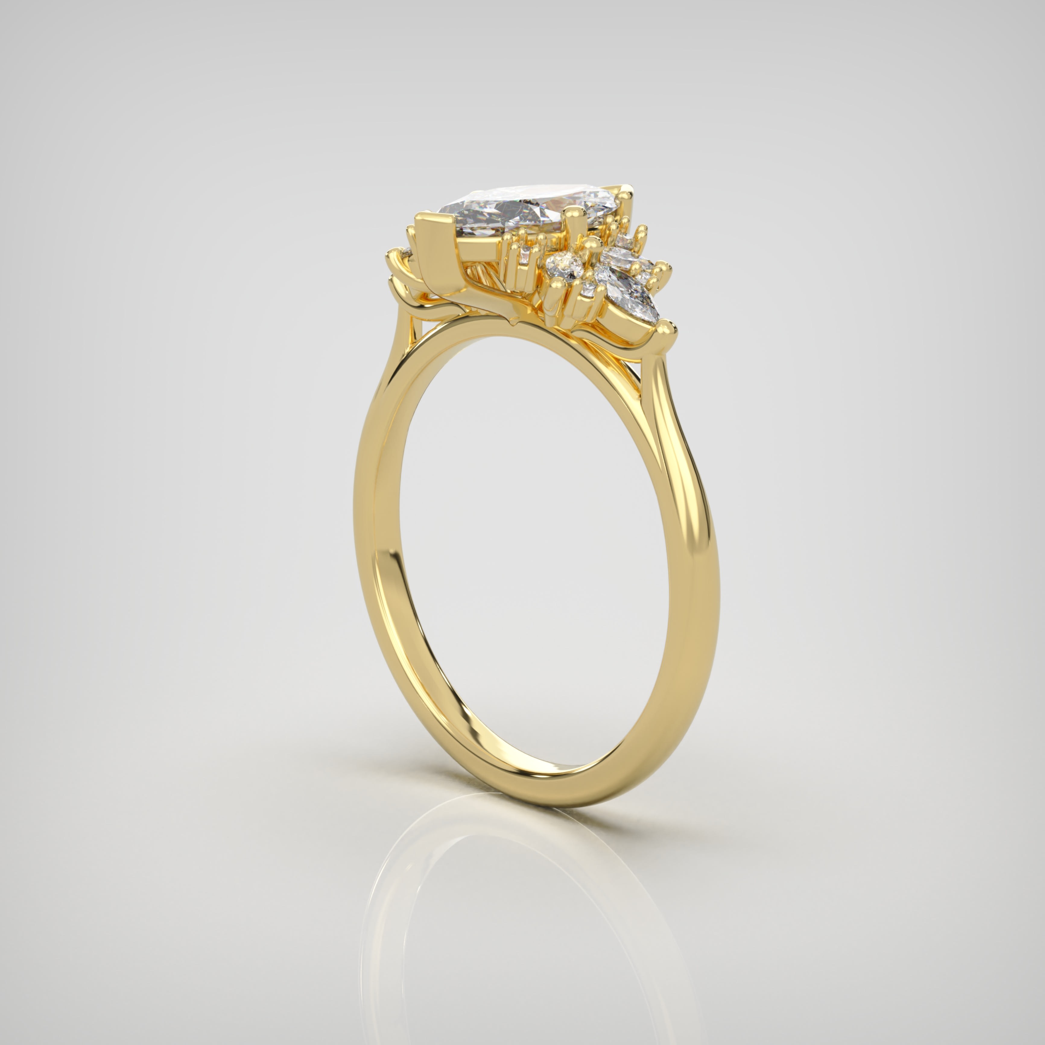 The flowing arrangement creates a graceful silhouette, reminiscent of blooming petals and whispered vows. With its unique shape and harmonious sparkle, this ring is a poetic expression of love, beauty, and devotion.