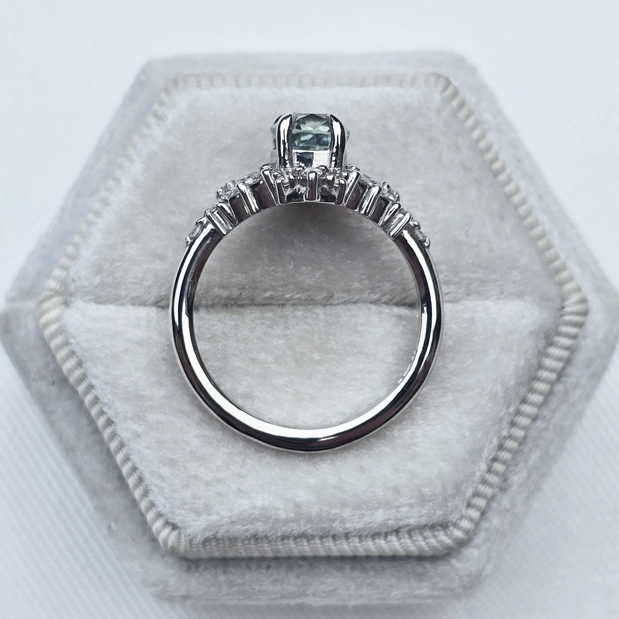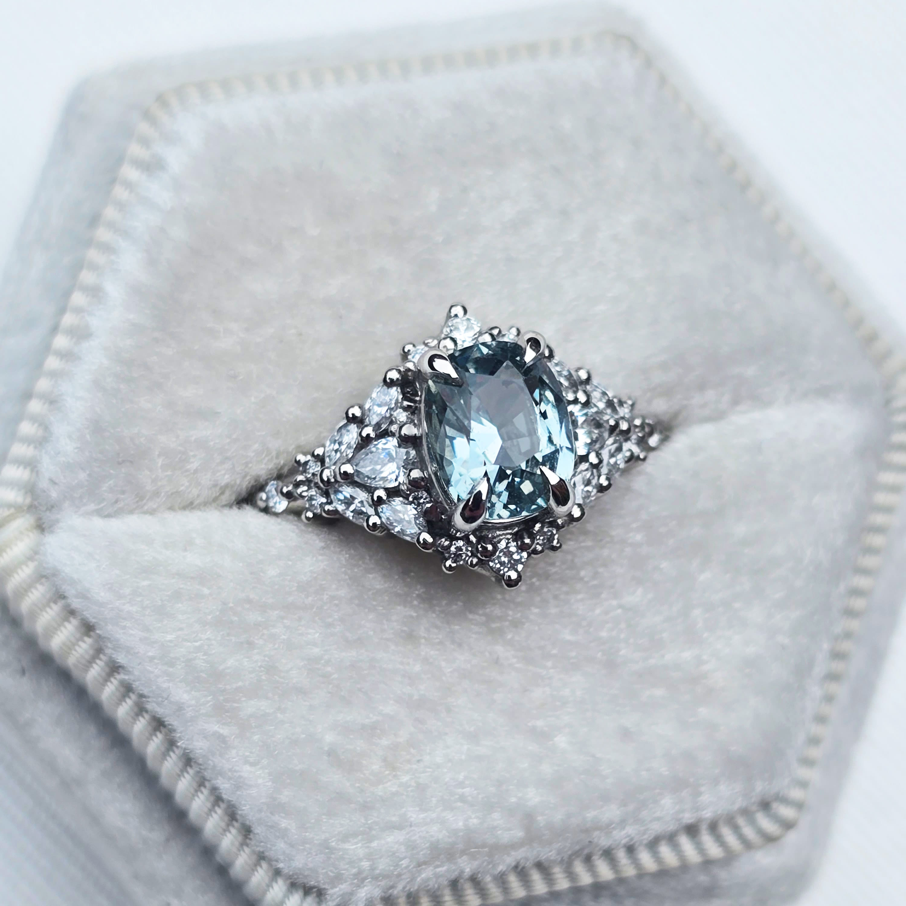 Description: The Meadow sapphire and diamond ring features a cushion-shaped, 1.53-carat natural icy teal sapphire centre stone set in the Meadow setting. The design is accented by a total of 26 lab grown diamonds, including eight marquise, two pear, and sixteen round cuts, with a total accent carat weight of 0.30ct. This fine jewellery piece is structurally inspired by natural forms and constructed using high-quality manufacturing techniques.