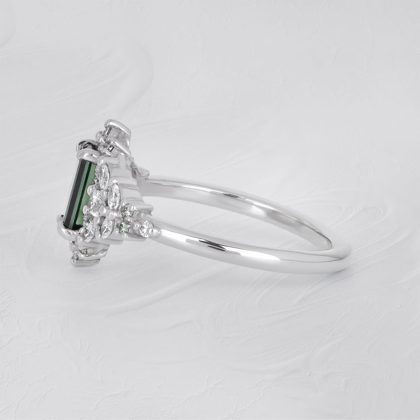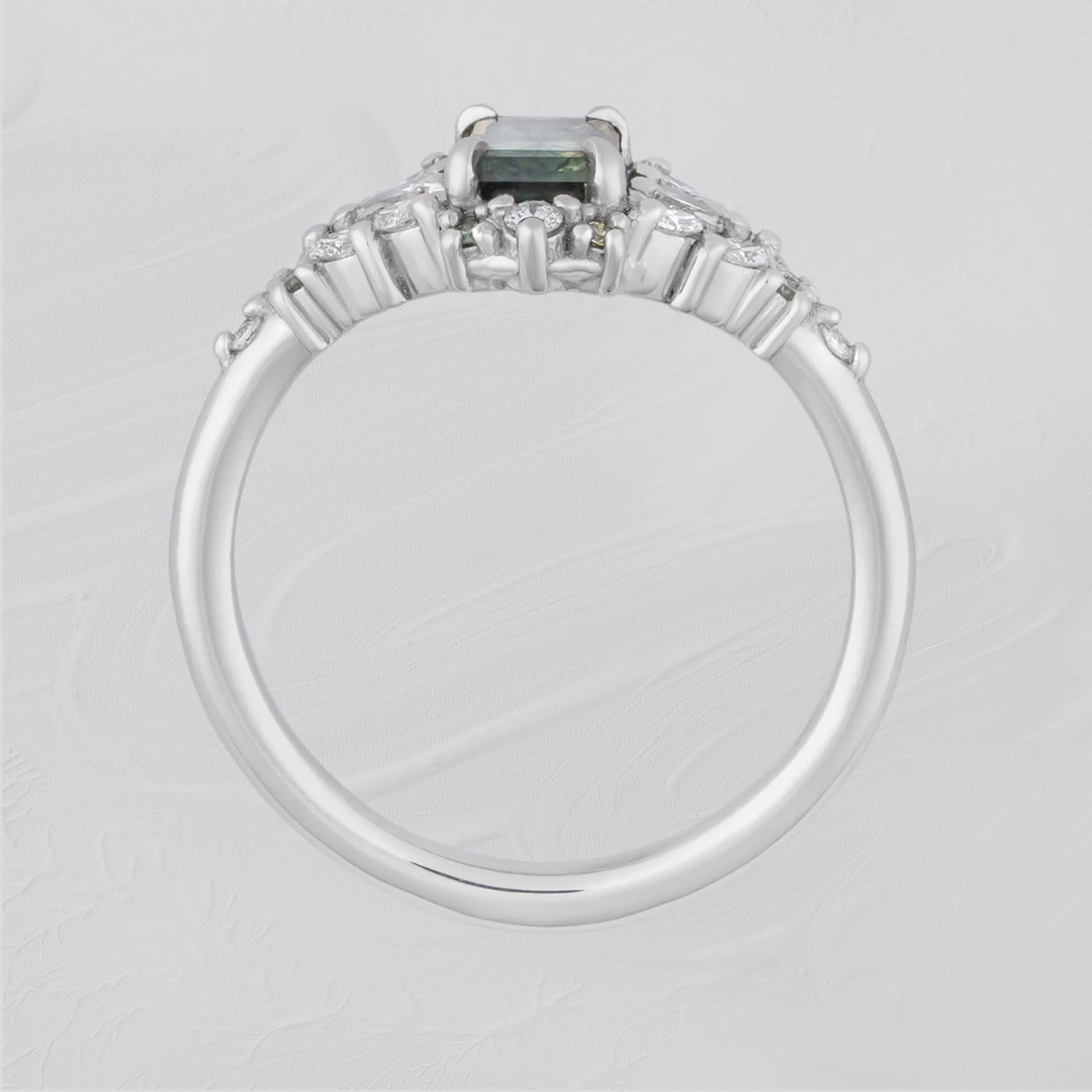 Inspired by nature, this exquisite new design is a breath-taking symphony of gemstones, masterfully composed to captivate the eye. At its heart lies a stunning 1.11ct John Dyer ‘Starbrite’ green rectangular sapphire, cradled in a delicate basket of brilliant diamonds. A harmonious blend of pear, marquise, and round-cut white diamonds surrounds the centrepiece, while subtle hints of mint green diamonds add a whisper of colour and intrigue.