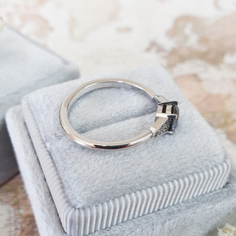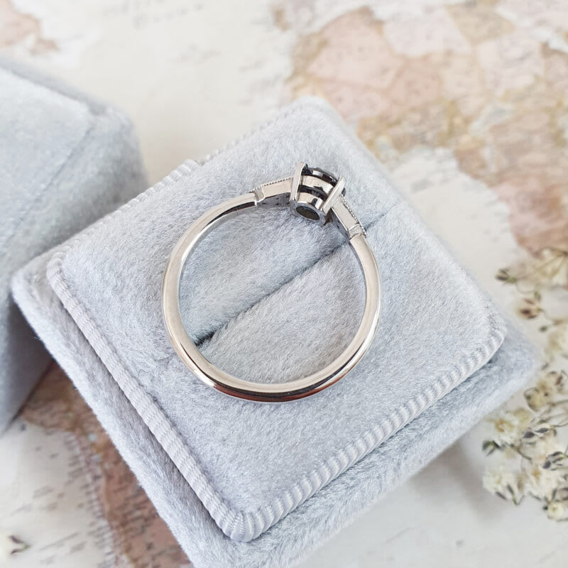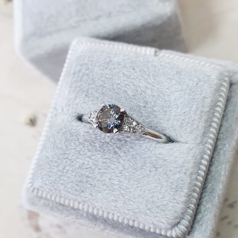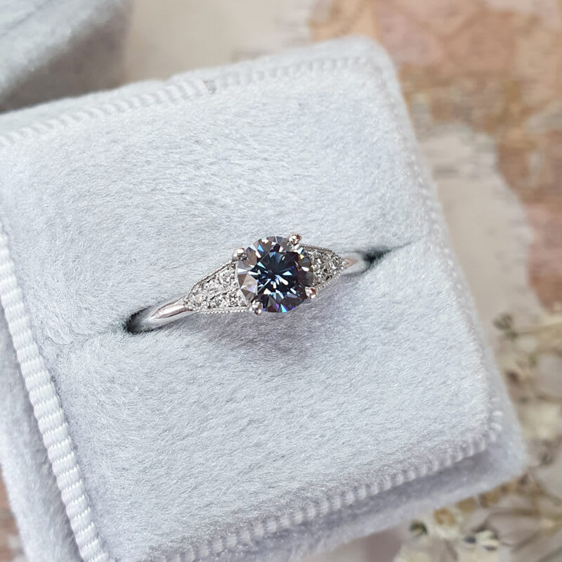 This brand new stunning ring features a central brilliant cut midnight grey moissanite, set in a stunning antique 1920s inspired mount, with accent diamonds.