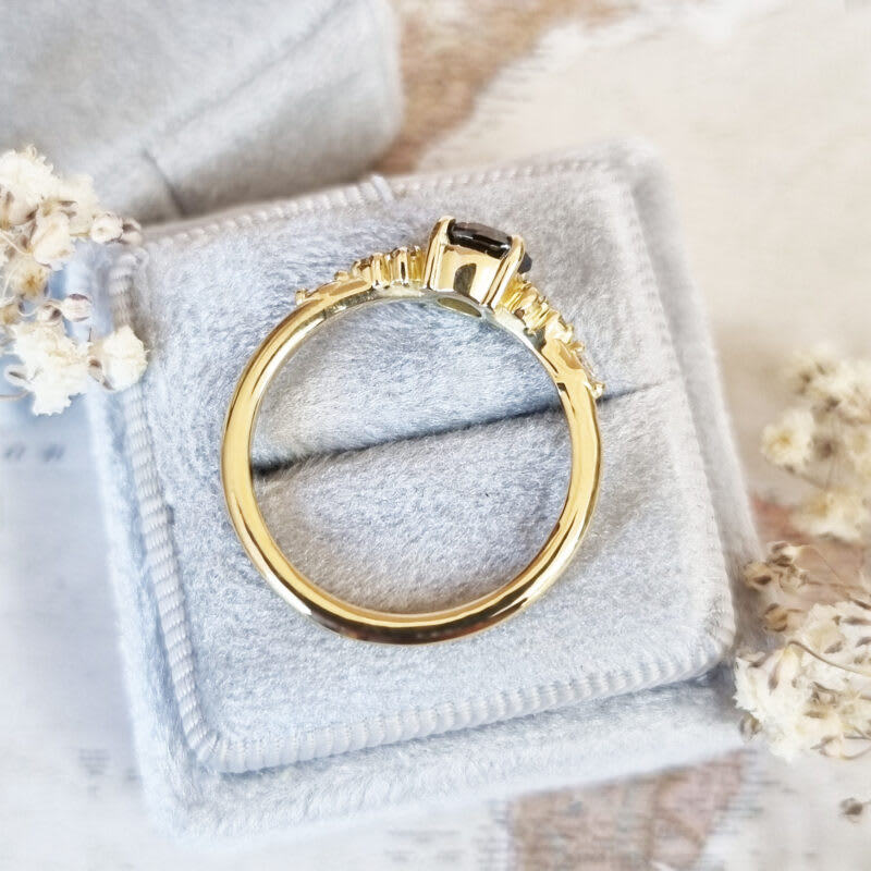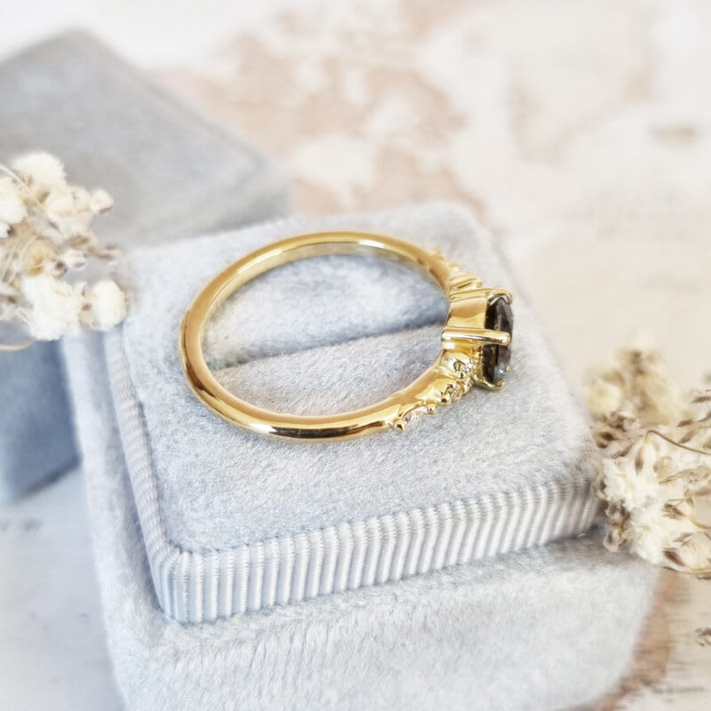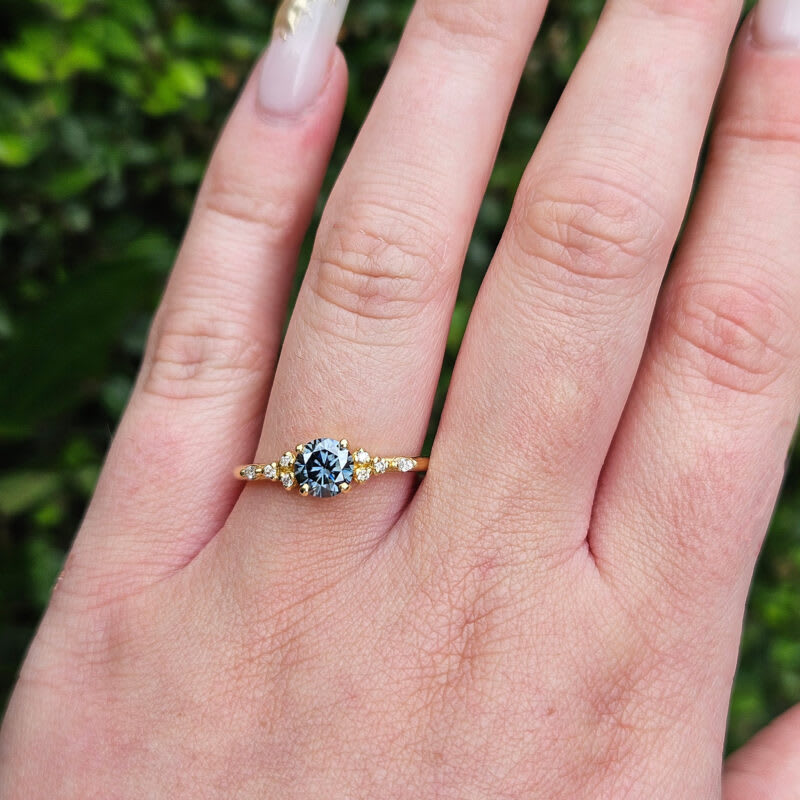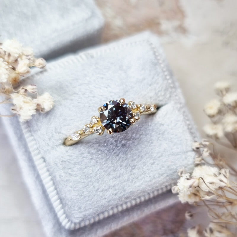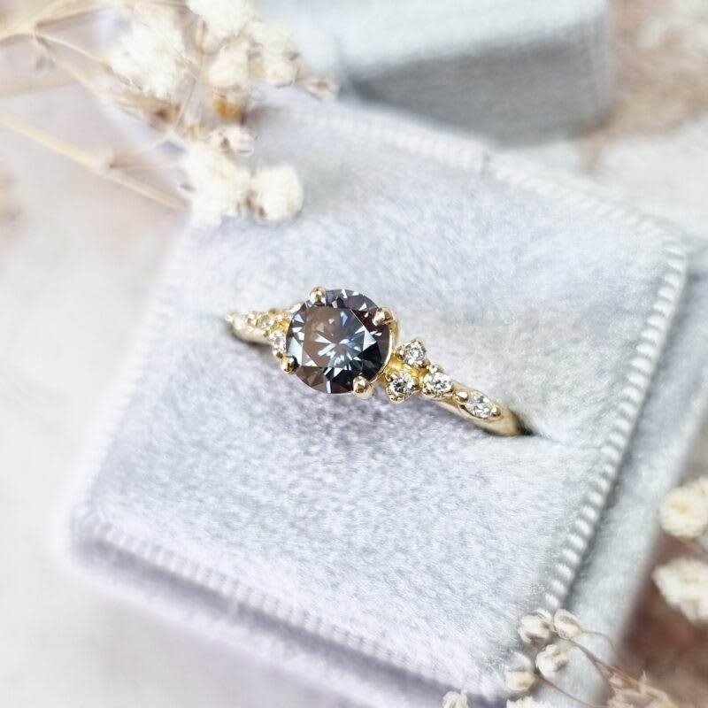 This brand new stunning ring features a central brilliant cut midnight grey moissanite. It has been set in a diamond studded, floral inspired, low profile mount!