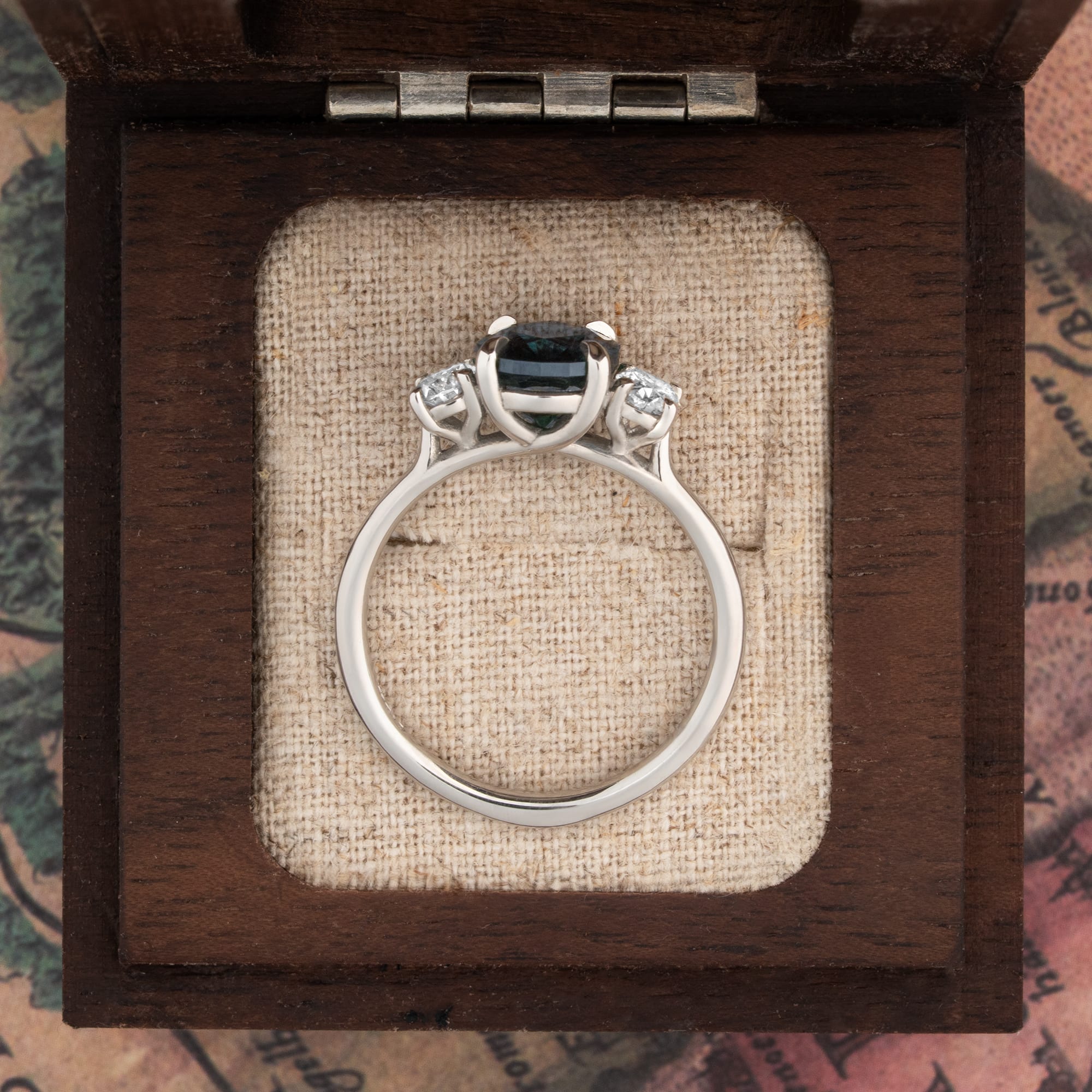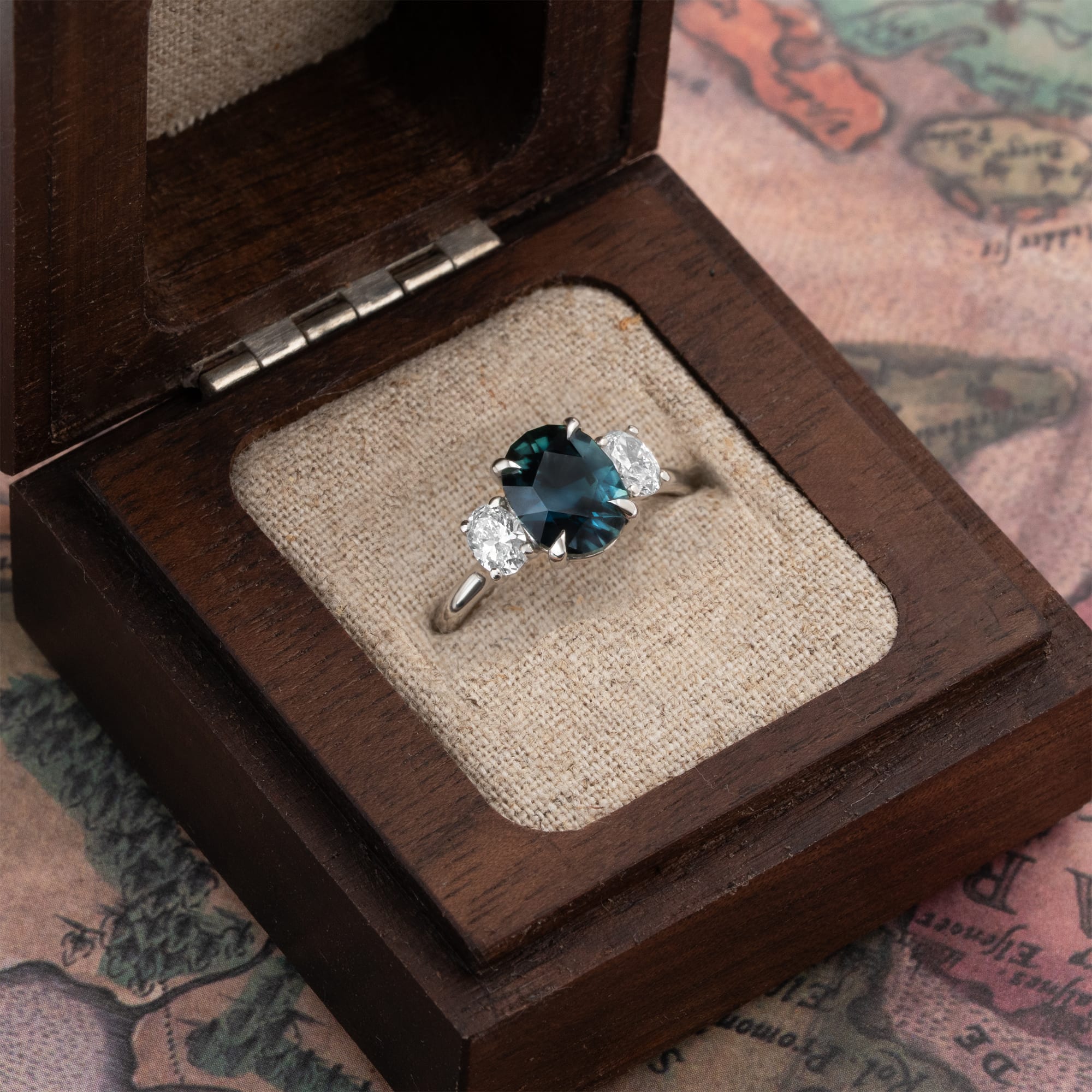 We sourced this rough sapphire ourselves and decided to send it to Italy to be cut into the very best oval shape possible. This engagement ring features a 2.94ct natural teal oval sapphire centre stone, cut in the exclusive 'Ovalution' style, by multi award winning gemstone cutter Ramon Tessaro. This sapphire is extremely rare in its colour. Usually, dark teal sapphires show dull or grey hues. However, due to the exquisite cut of this sapphire and strong natural saturation, the deep teal colour remains pure and intense. The centre stone is set in a trellis setting, flanked by two 0.40ct lab-grown oval accent diamonds. This fine jewellery piece is a one-of-a-kind sapphire and diamond ring crafted in Platinum 950.