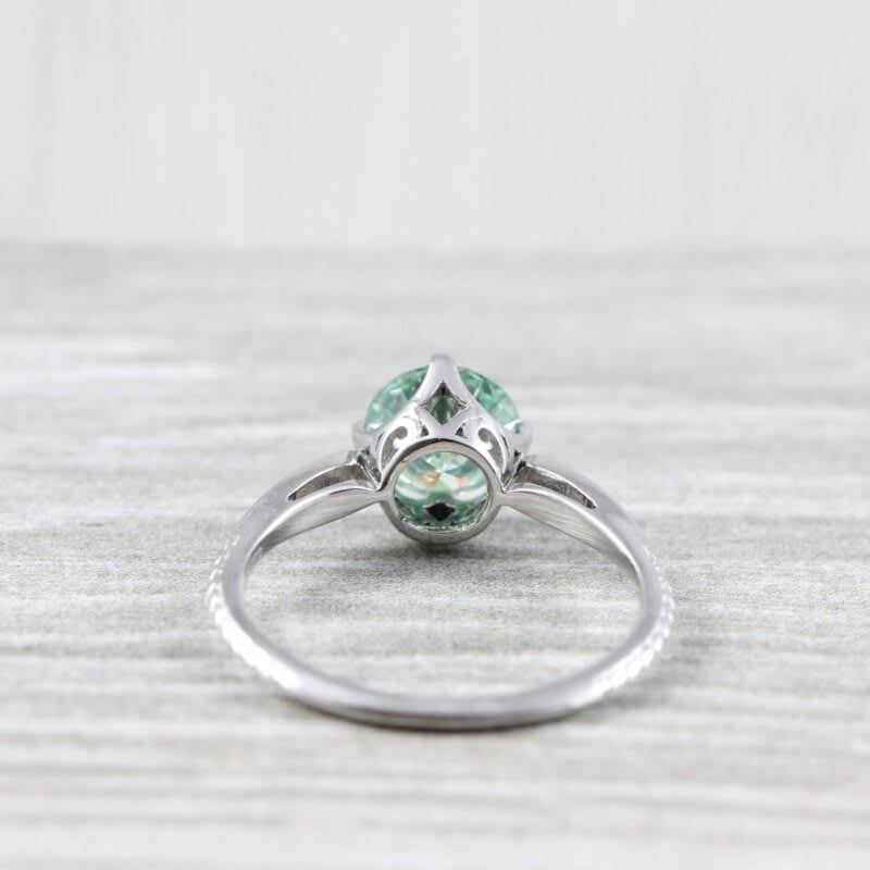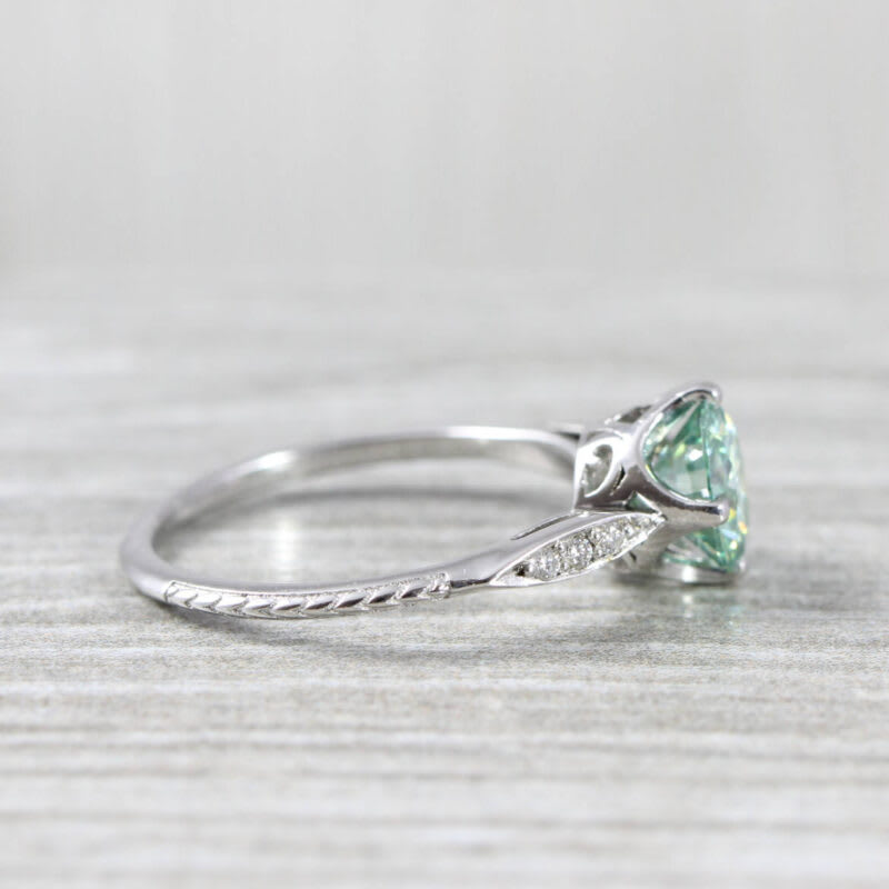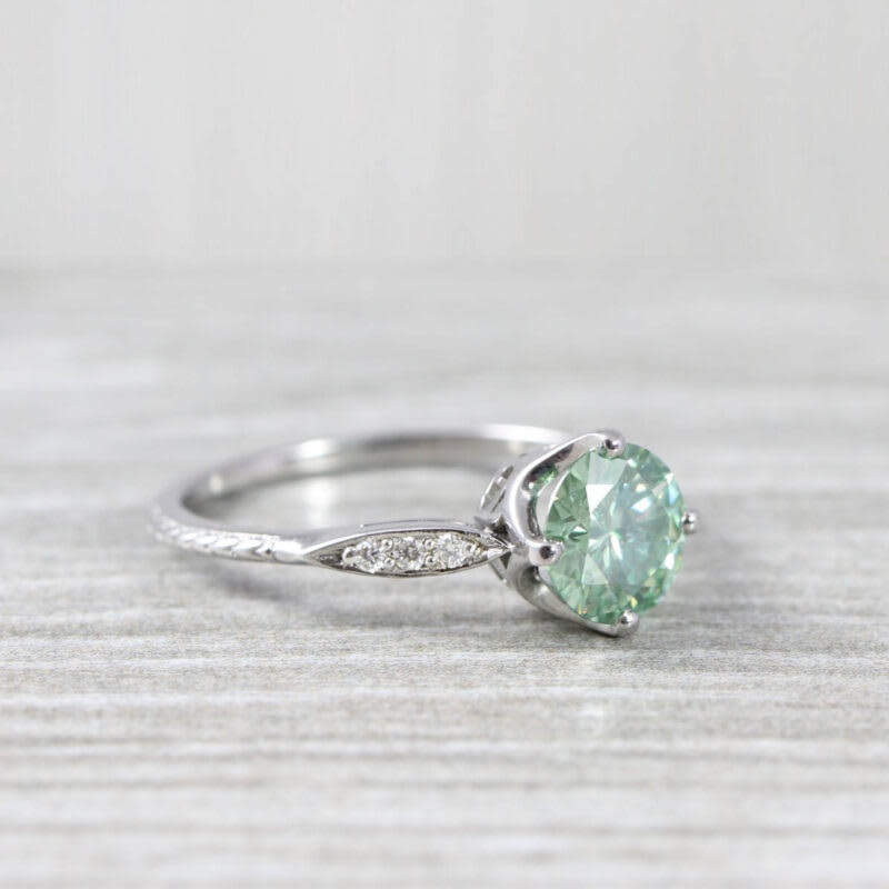 This brand new stunning ring features a central brilliant cut mint green Moissanite, flanked by 6 brilliant cut diamonds in a gold or platinum mount!
