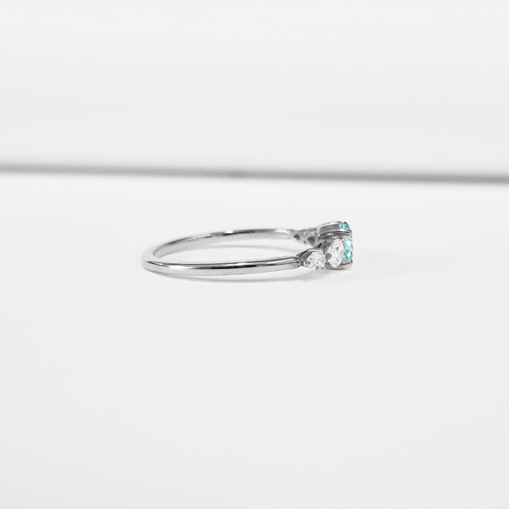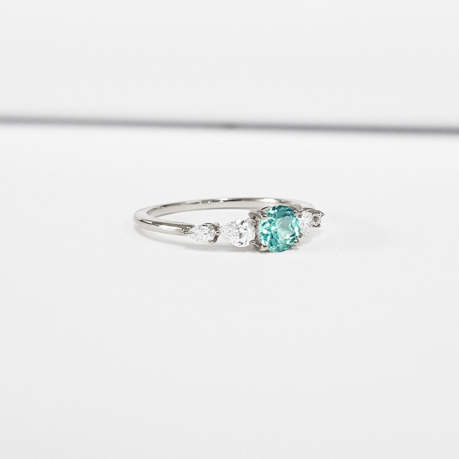 This brand new stunning ring features a central round lab grown mint sapphire, that has been claw set with 4 graduating pear cut diamonds, in a sleek and elegant mount.