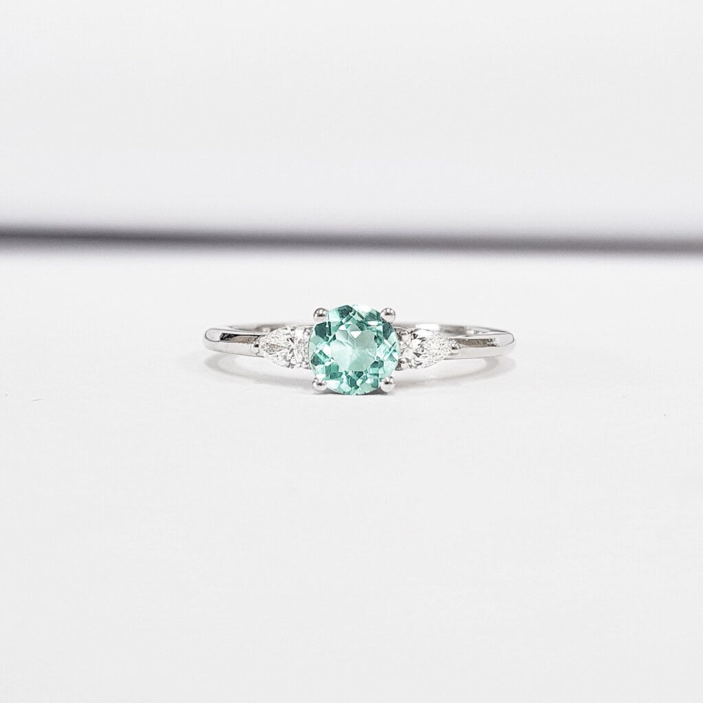 This brand new stunning ring features a central lab created mint sapphire, that has been claw set with 2 pear cut diamonds, in a sleek and elegant low profile mount.
