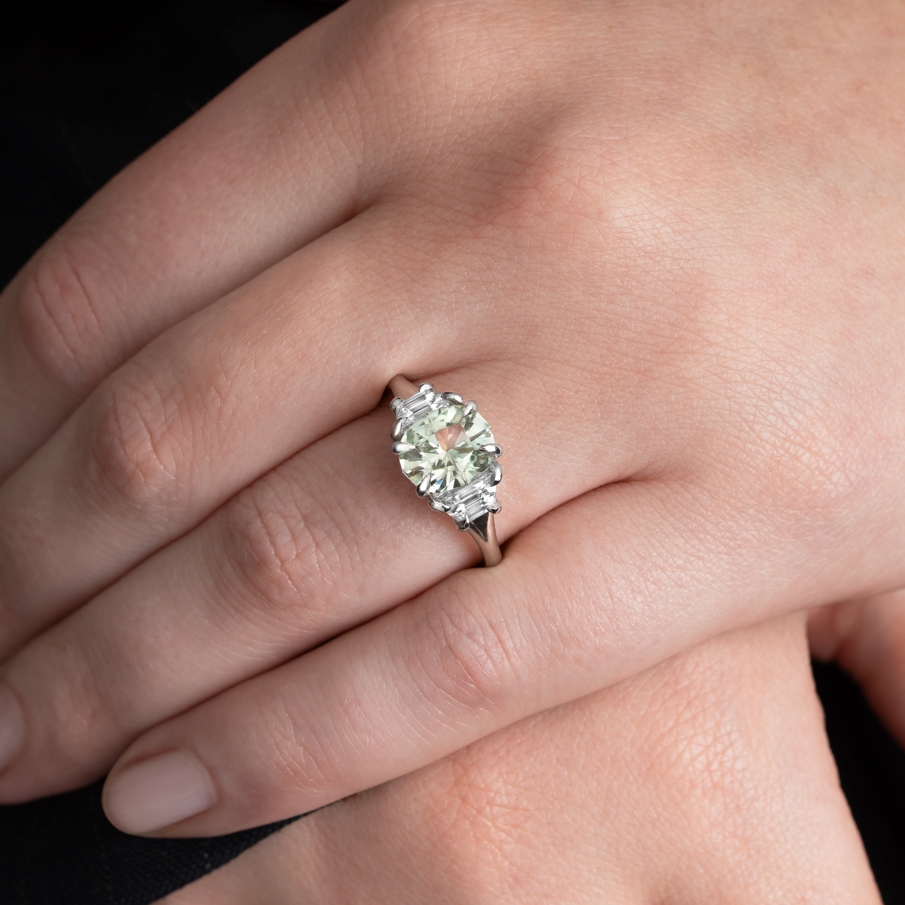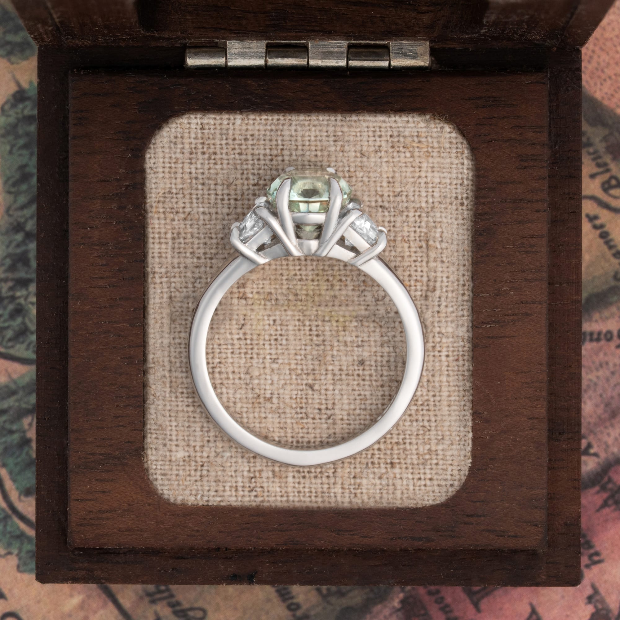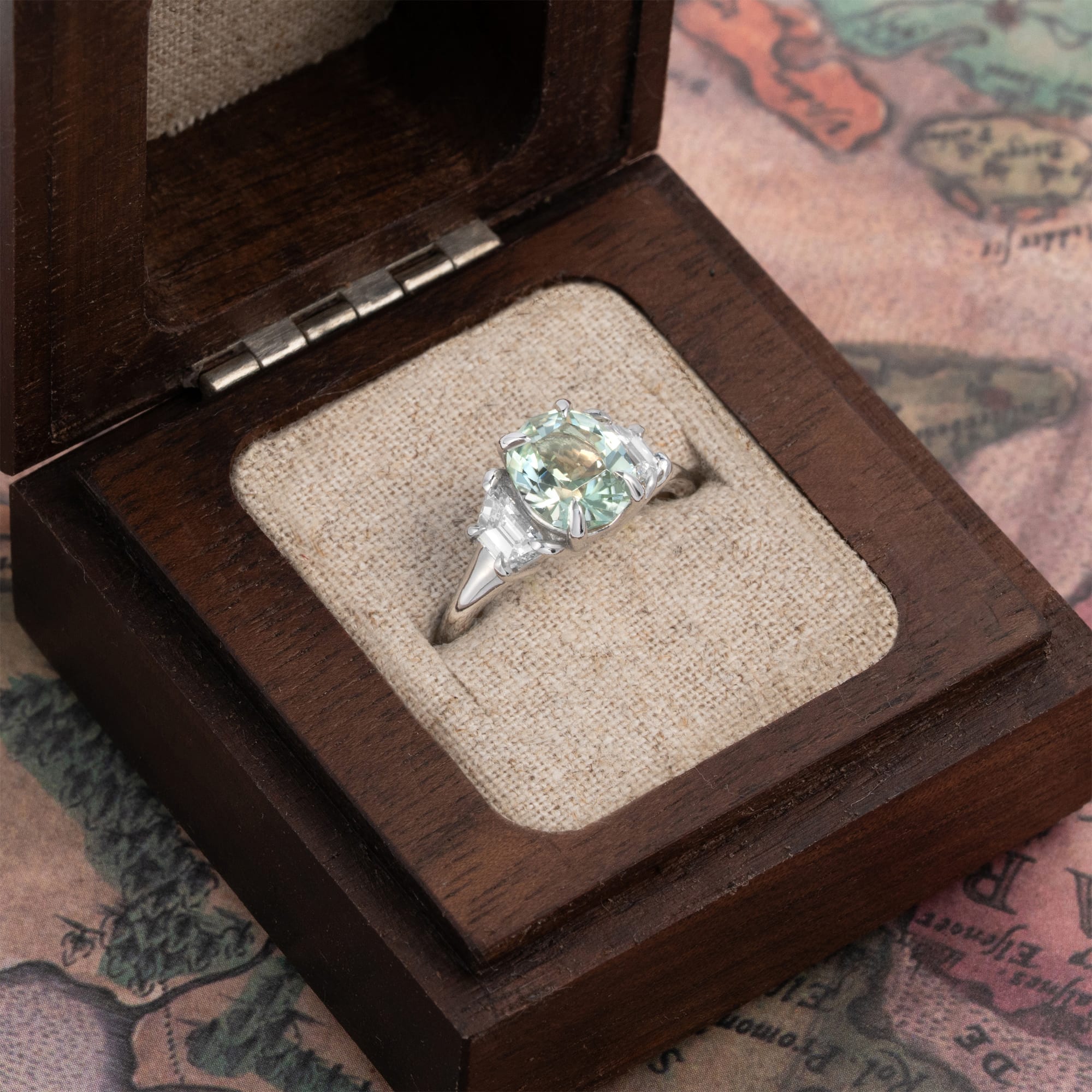 Description: This pre-made fine jewellery engagement ring features a central 2.19ct oval-cut natural mint tourmaline. The tourmaline is talon set between two trapezoid-cut lab-grown diamonds, also talon set, to create a three-stone trilogy design with an Art Deco geometric profile. The side stones are lab-grown diamonds with a total carat weight of 1.00ct.