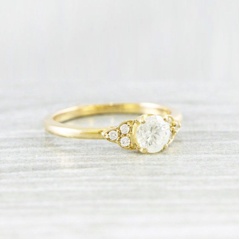 This brand new stunning ring features a central brilliant cut moissanite, flanked by 6 diamonds in an antique inspired mount!
