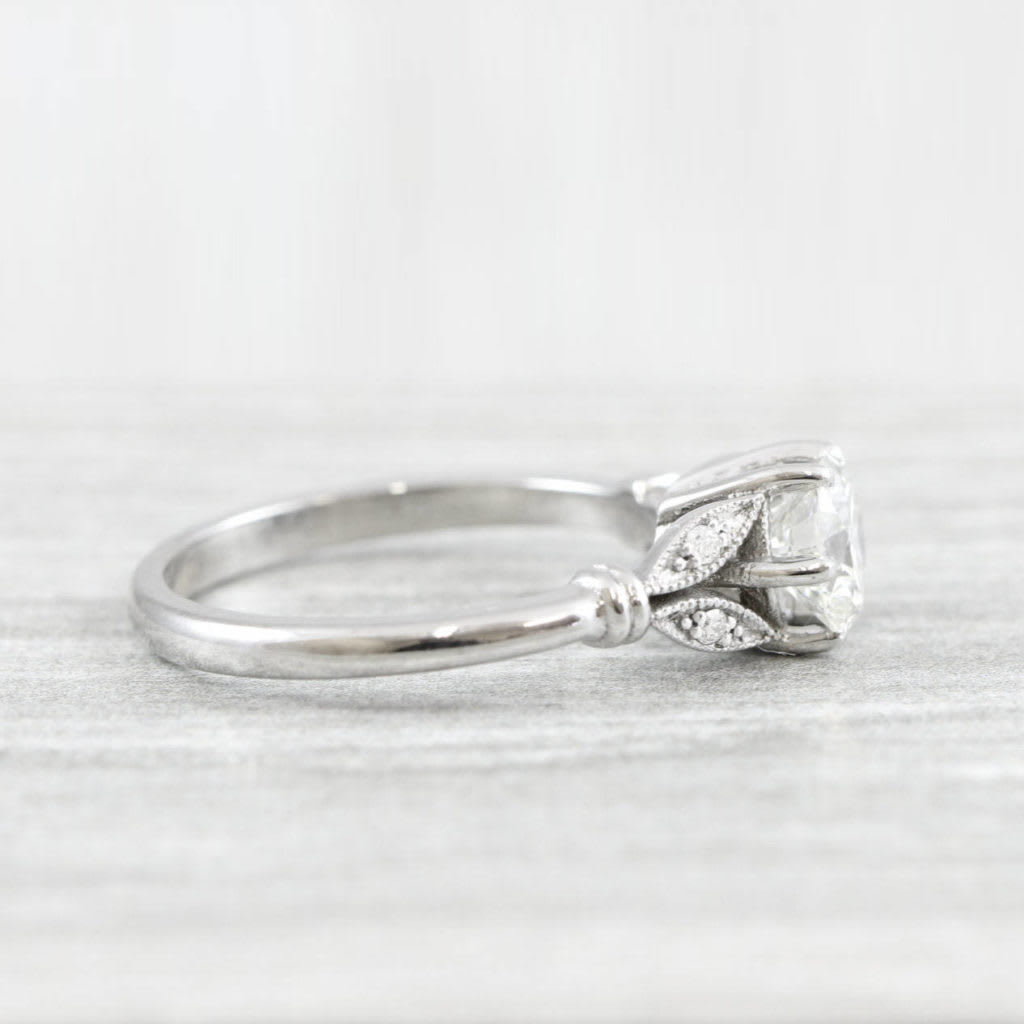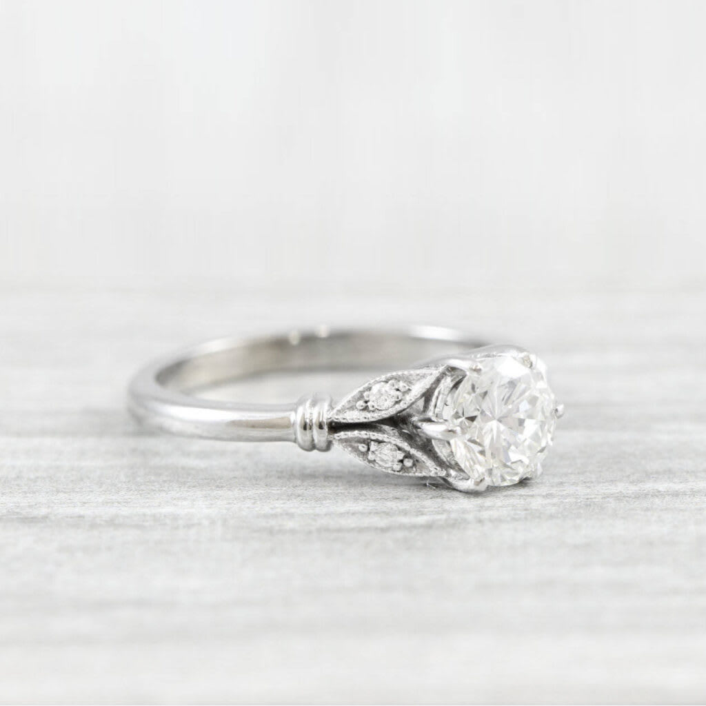 This brand new stunning ring features a central round brilliant cut Moissanite, set in a gorgeous floral inspired gold mount, with 4 diamond accent stones!