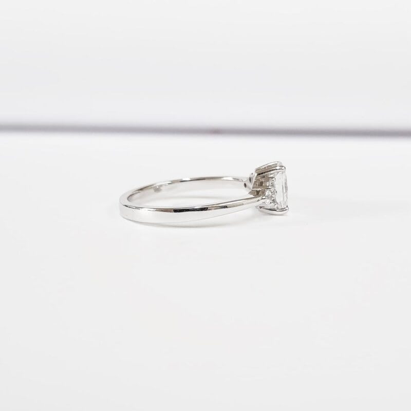 This absolutely gorgeous ring features a dazzling oval Moissanite with 6 diamonds flanking on either side in a gold or platinum mount!