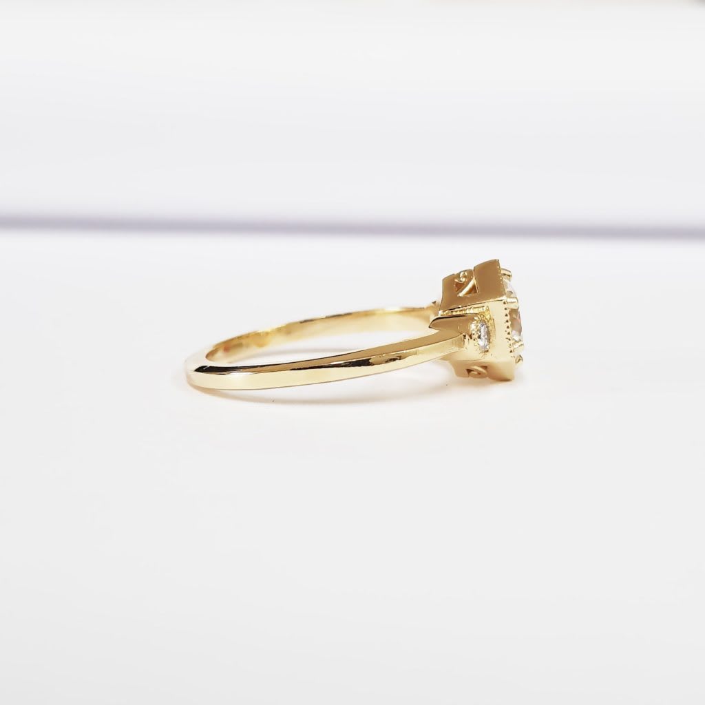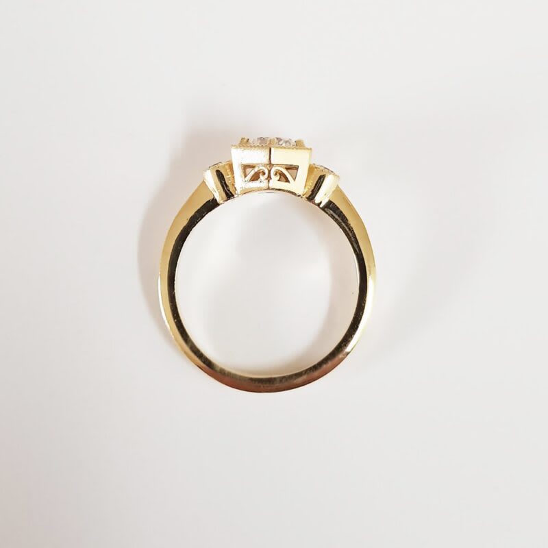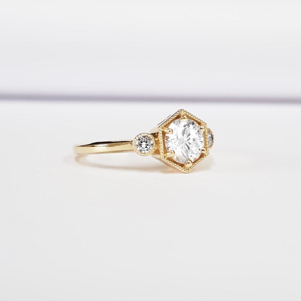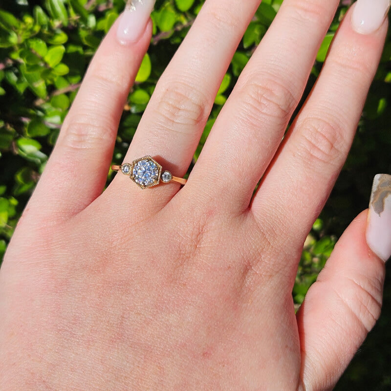 This brand new stunning ring features a central brilliant cut Moissanite, that has been claw set with two smaller brilliant cut moissanites, in a art deco inspired, hexagon milgrain setting.