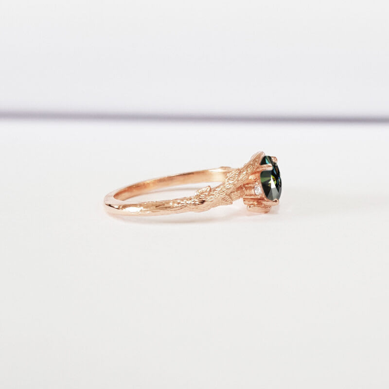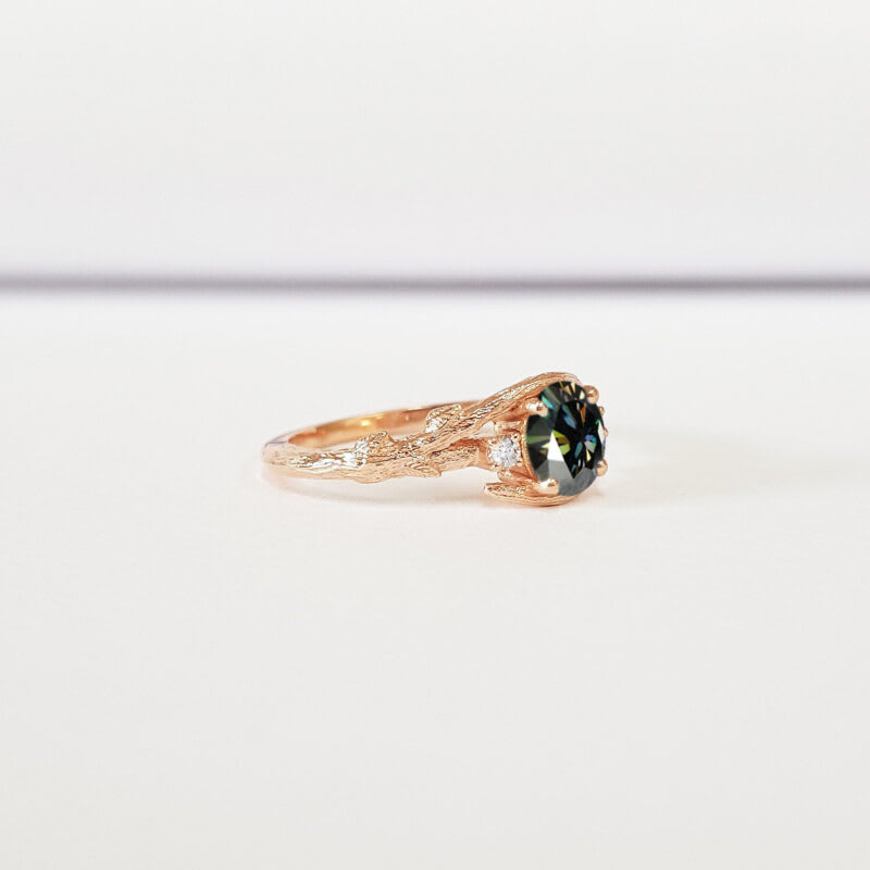 This brand new stunning ring features a central brilliant cut moonlight moissanite, flanked by two diamonds and set in a custom tree mount with tiny golden leaves!