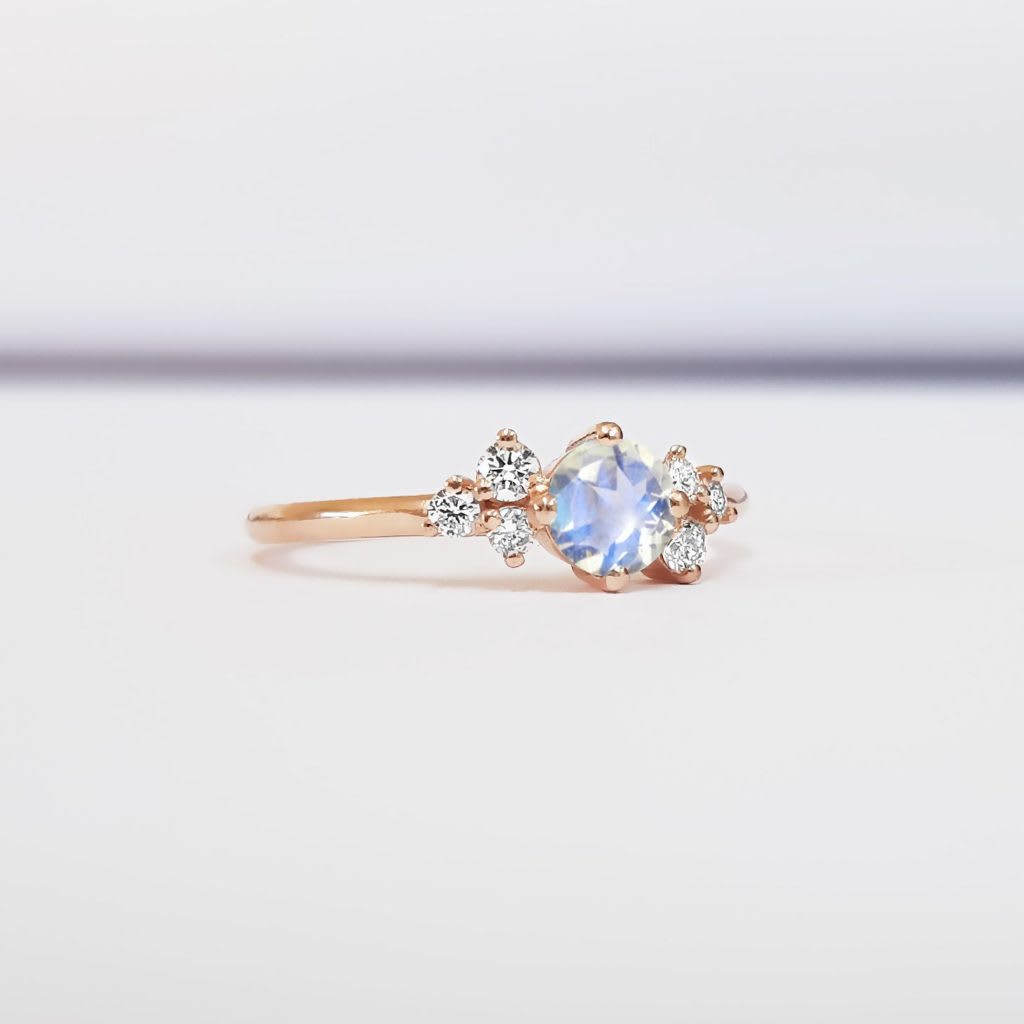 This brand new stunning ring features a central round cut Moonstone, that has been claw set with 6 brilliant cut diamonds, in a sleek and elegant low profile mount.