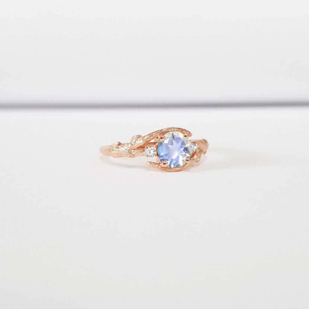 This brand new stunning ring features a central faceted Moonstone, flanked by two diamonds and set in a custom tree mount with tiny golden leaves!
