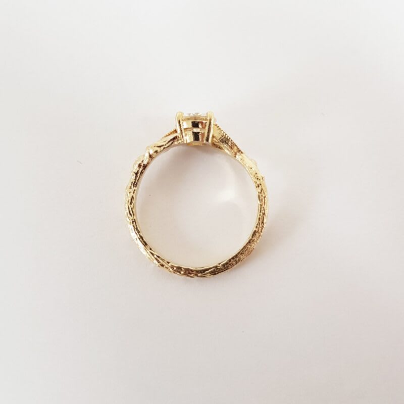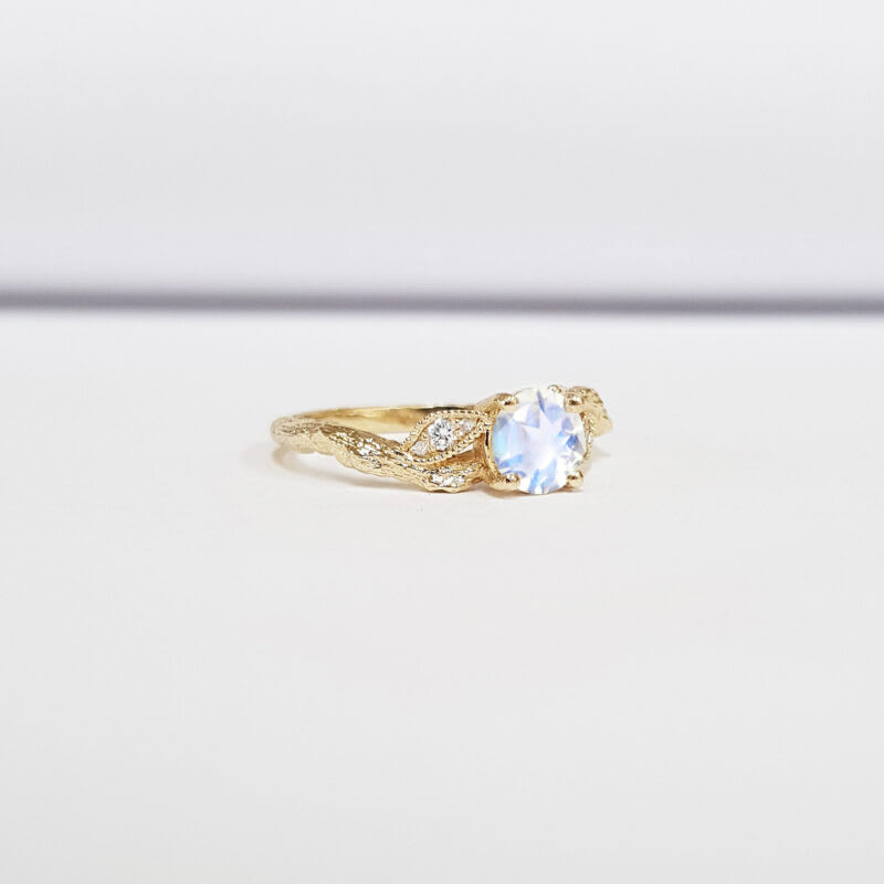 This brand new stunning ring features a central moonstone, set in a custom wooden textured tree mount, with leaves that are studded with 6 brilliant cut diamonds!