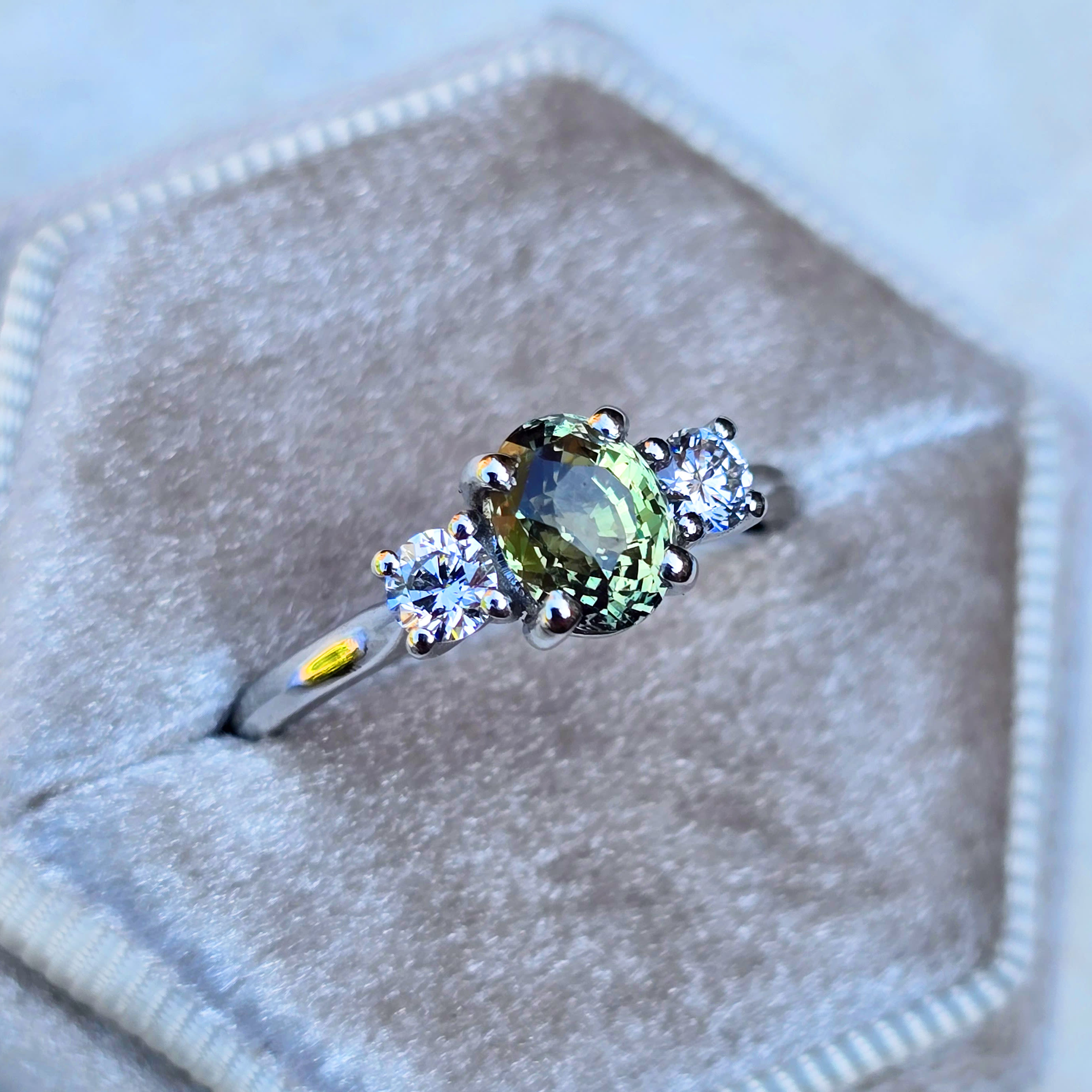 This spectacular ring features a very rare natural oval cut Alexandrite. We have set it with two brilliant lab grown diamonds in a platinum weaving trellis setting.