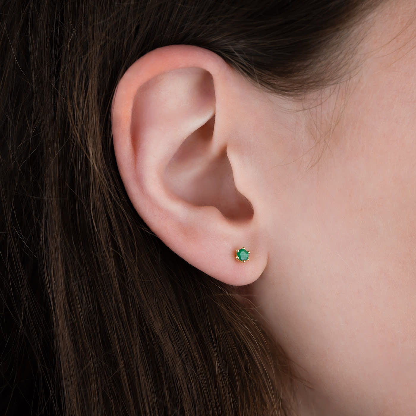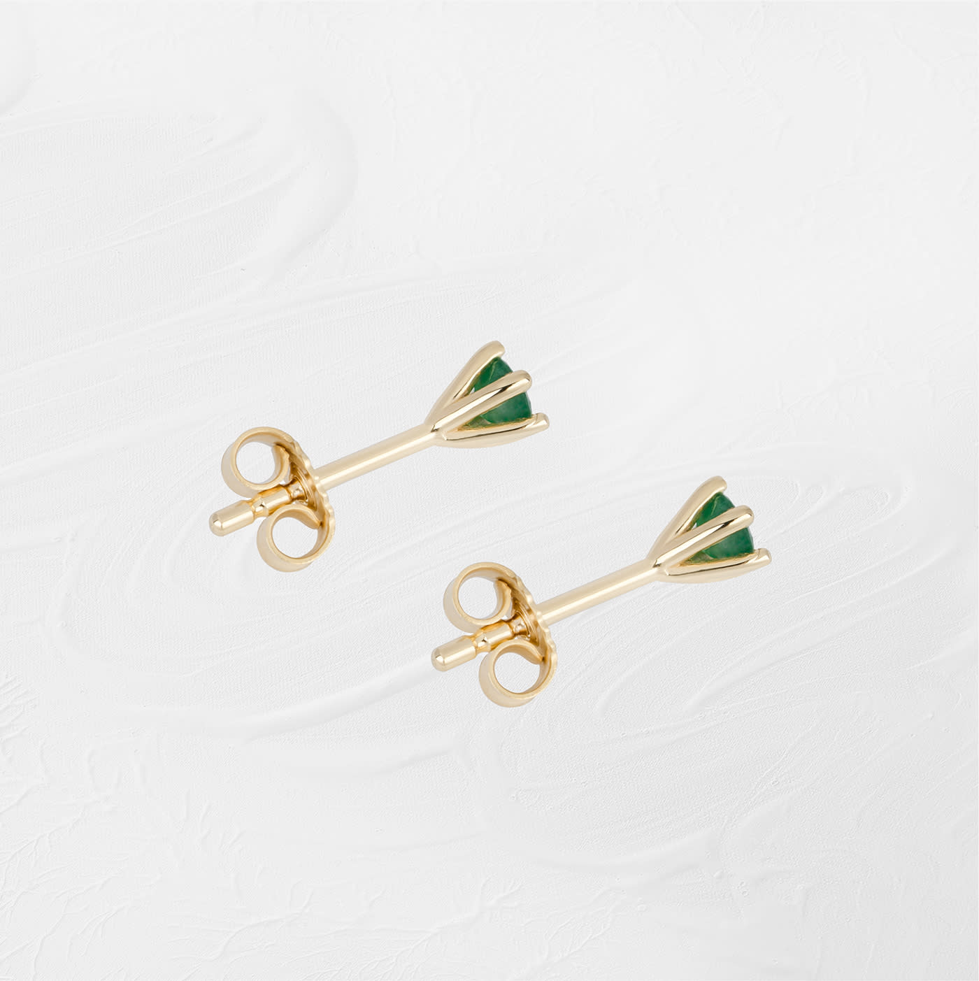 These brand new claw set emerald earrings feature a round 3mm emerald set with 6 rounded prongs in 9ct yellow gold.