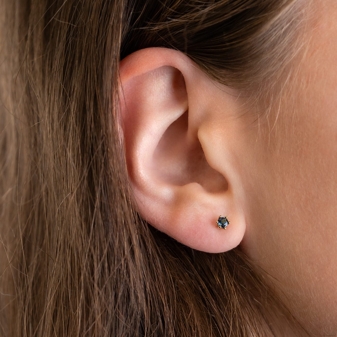 Description: These are claw set emerald earrings. Each earring features a round 3mm natural sapphire secured with six rounded prongs. The earrings are fine jewellery constructed in 9ct yellow gold.